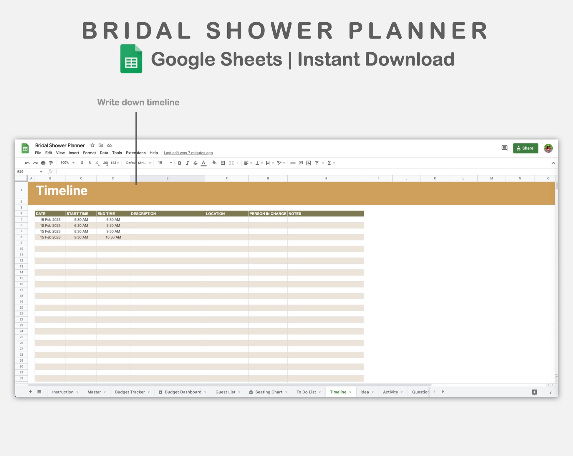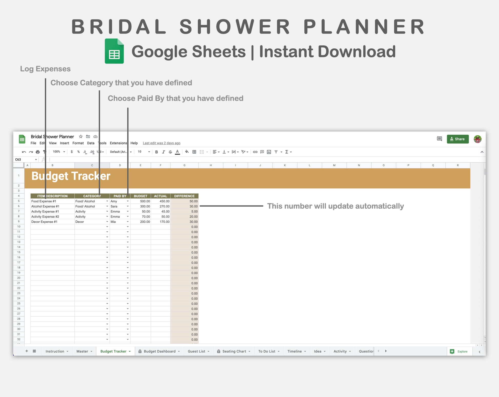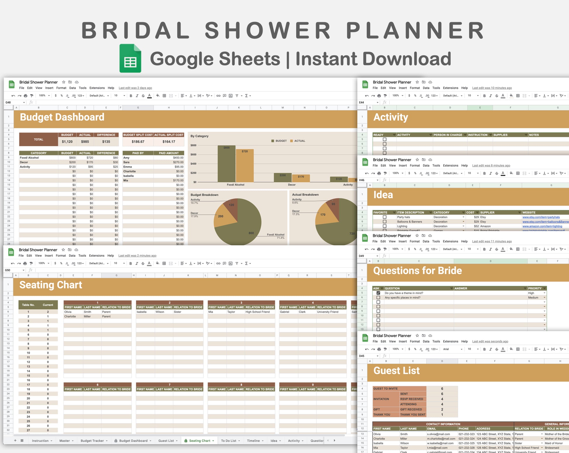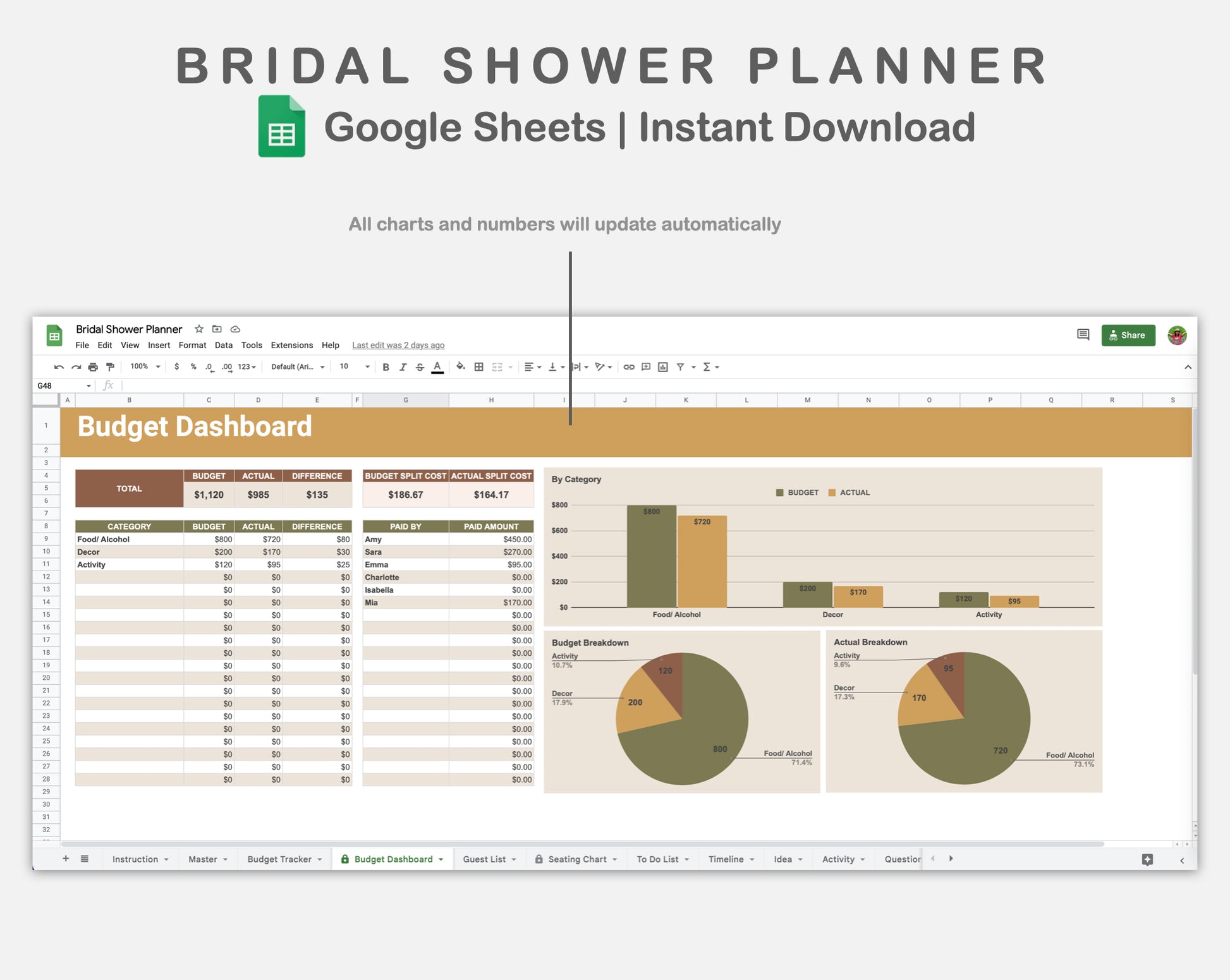 • There are 12 sheets: Instruction, Master, Budget Tracker, Budget Dashboard, Guest List, Seating Chart, To Do List, Timeline, Activity, Idea, Questions for Bride, and Formula.