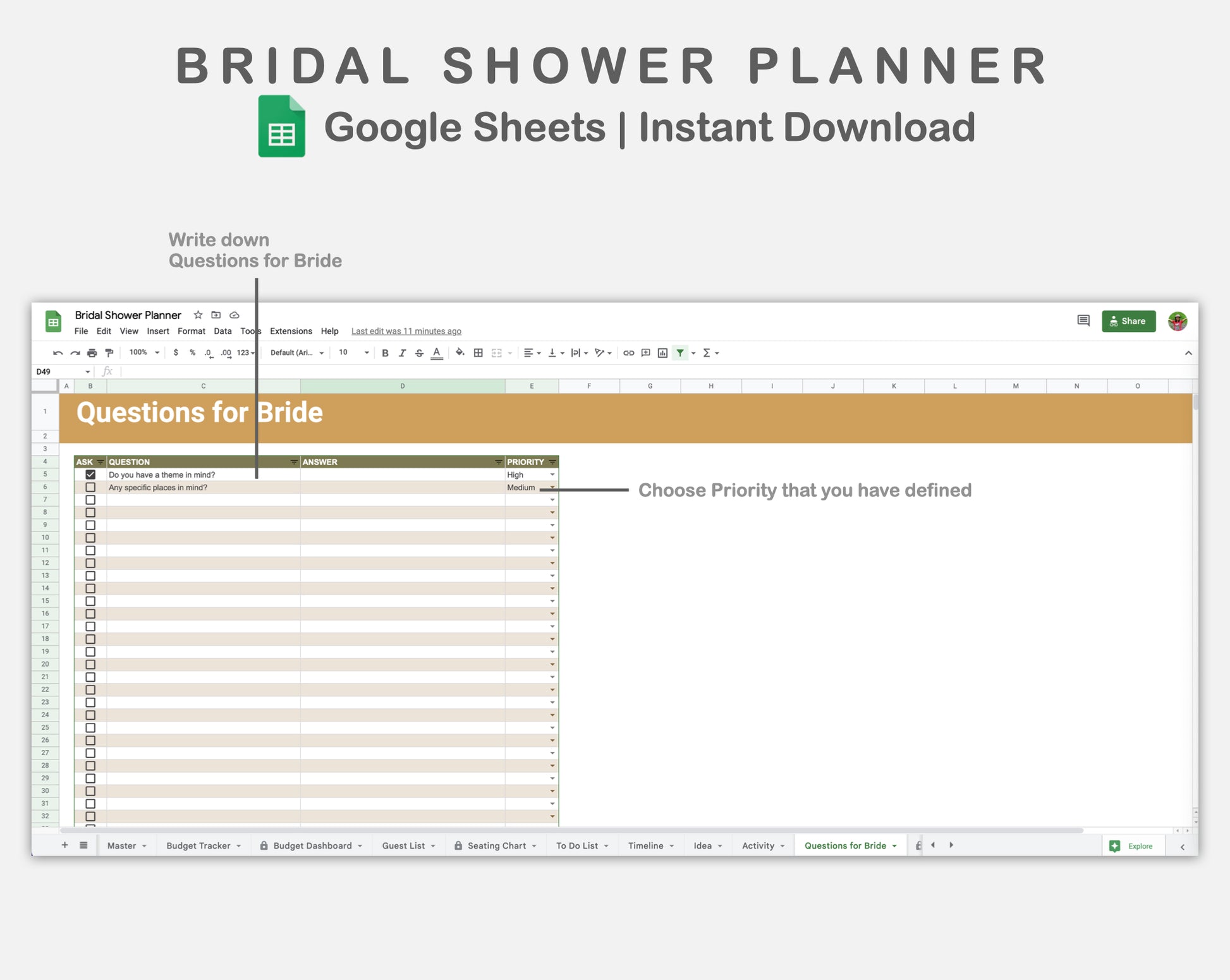 This Bridal Shower Planner Spreadsheet for Google Sheets is made in BOHO theme in order to help you plan and organize your Bridal Shower easily and effortlessly.