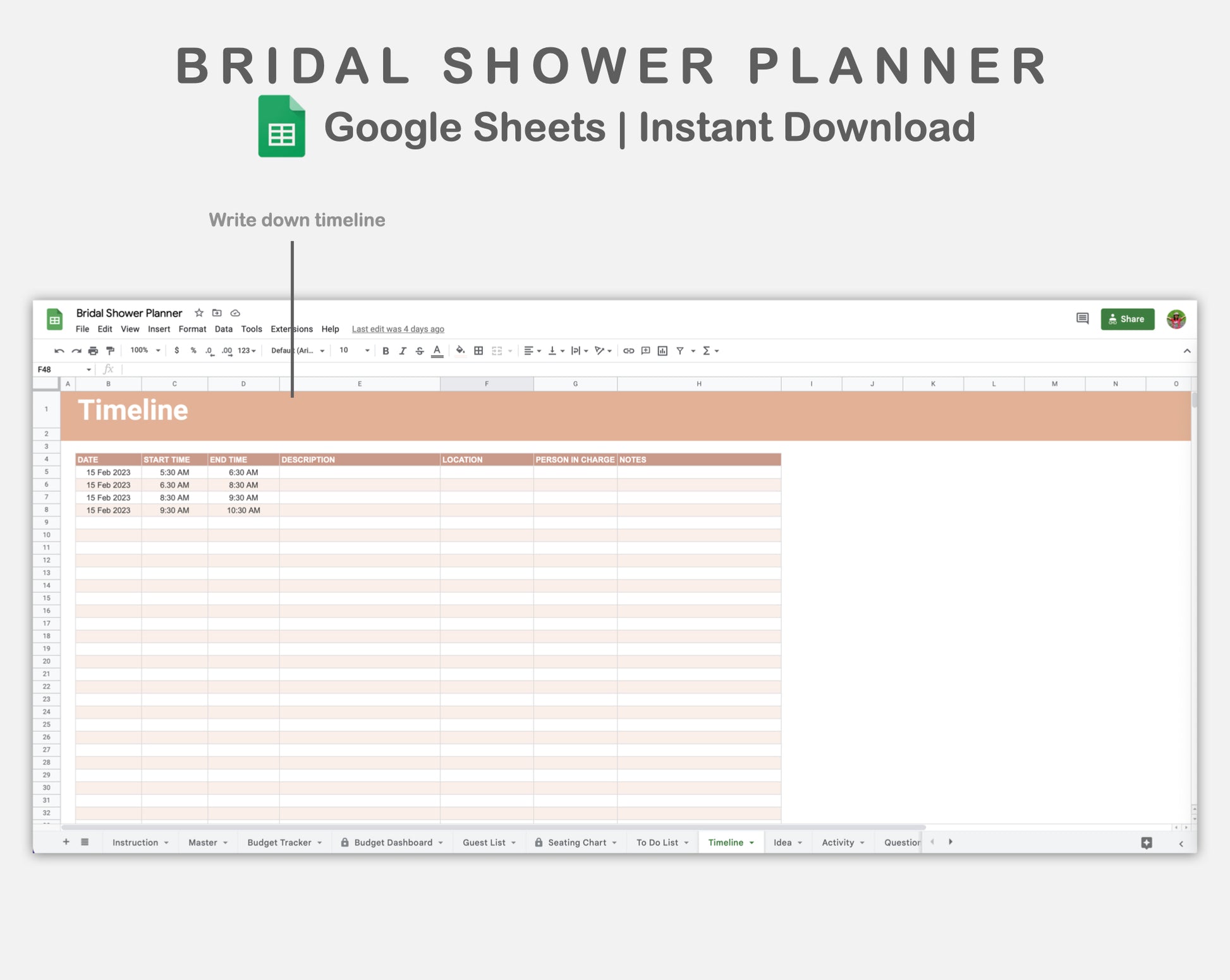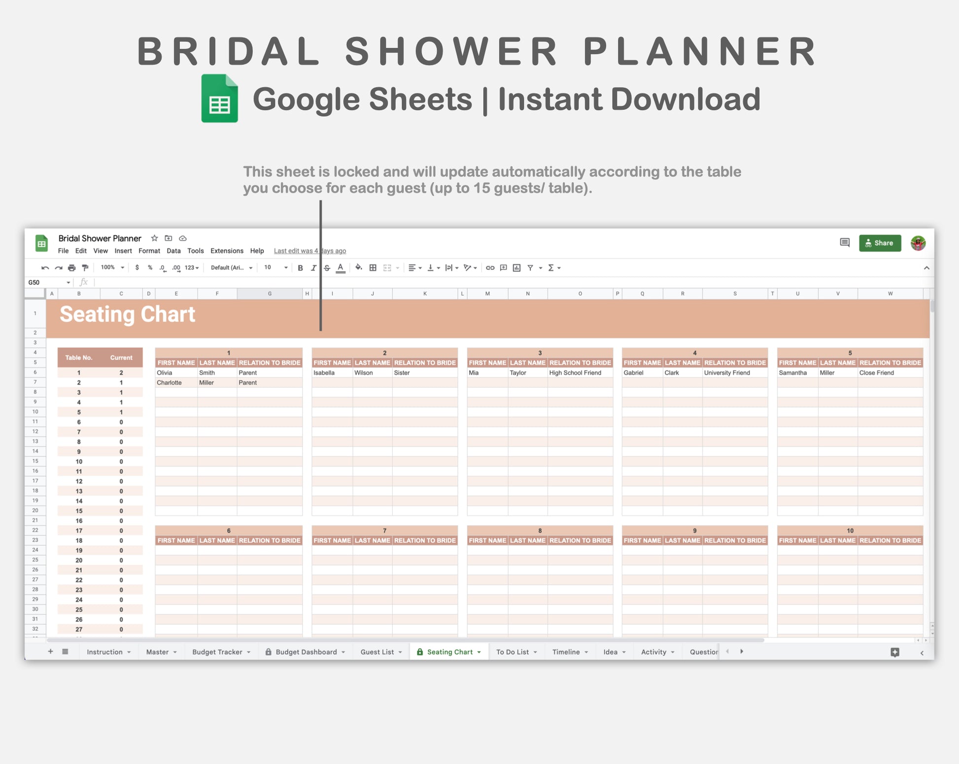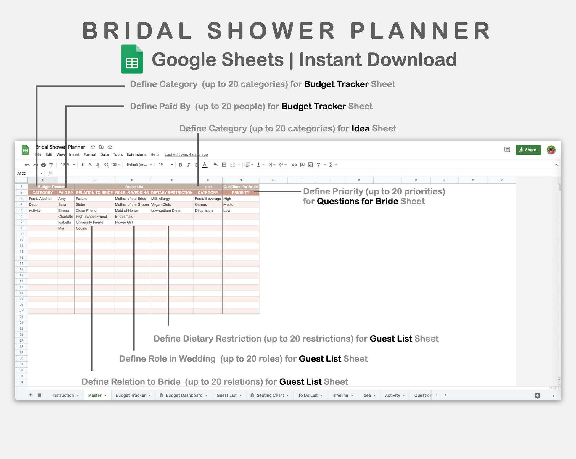 • There are 12 sheets: Instruction, Master, Budget Tracker, Budget Dashboard, Guest List, Seating Chart, To Do List, Timeline, Activity, Idea, Questions for Bride, and Formula.
