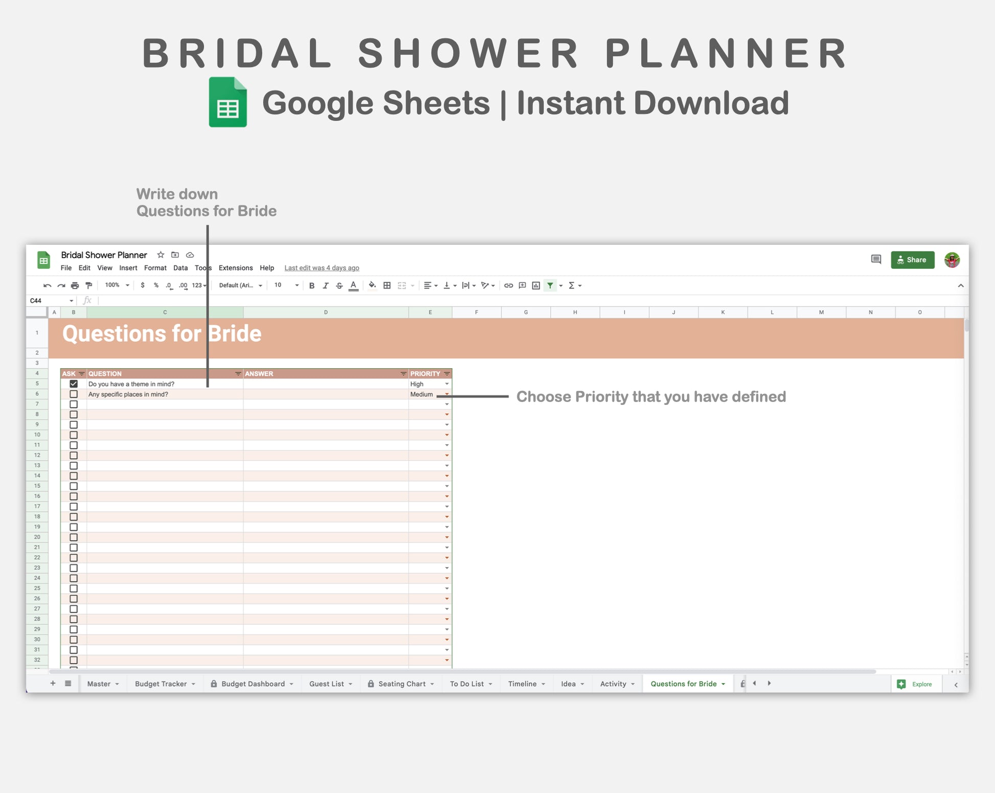 This Bridal Shower Planner Spreadsheet for Google Sheets is made in NEUTRAL theme in order to help you plan and organize your Bridal Shower easily and effortlessly.