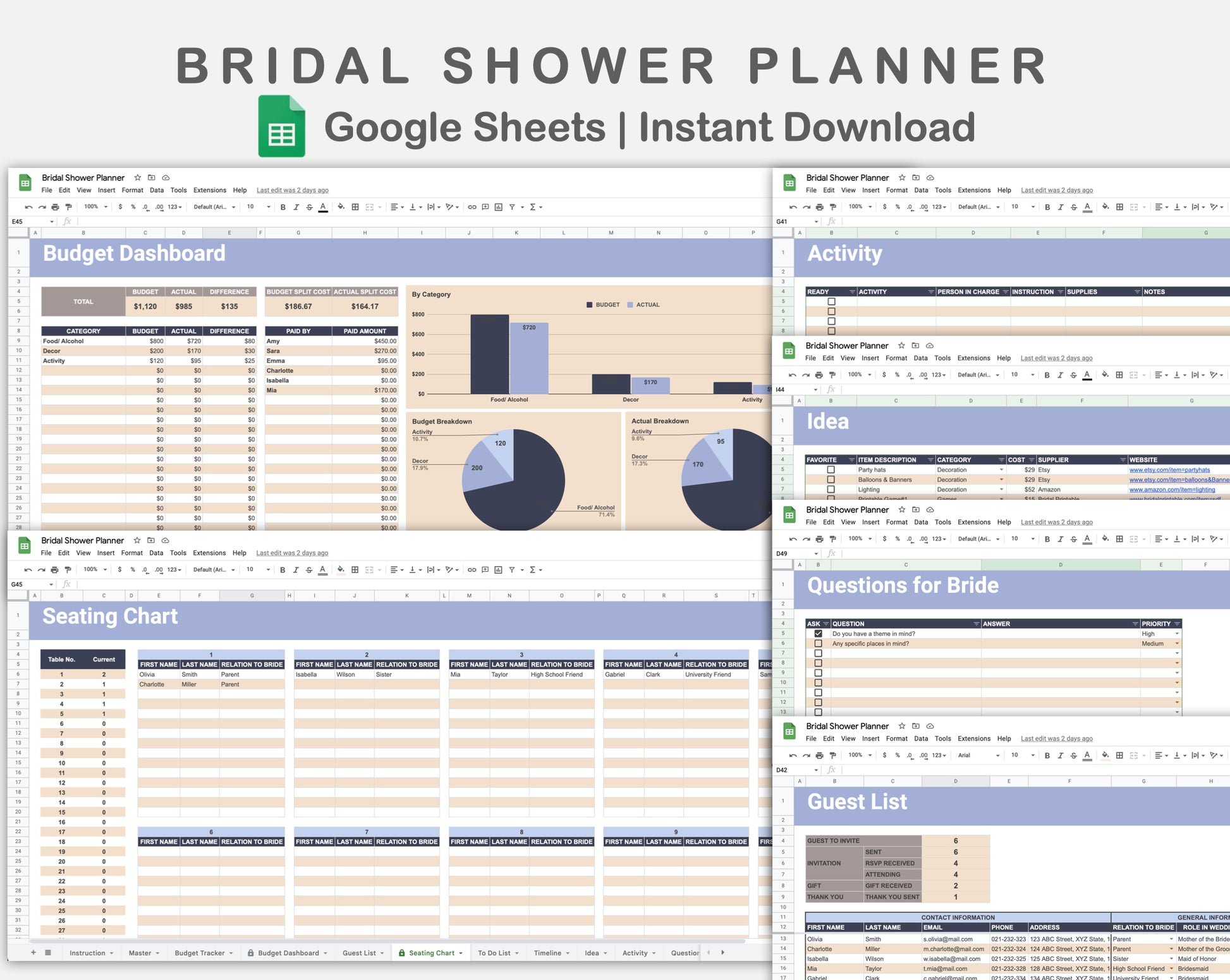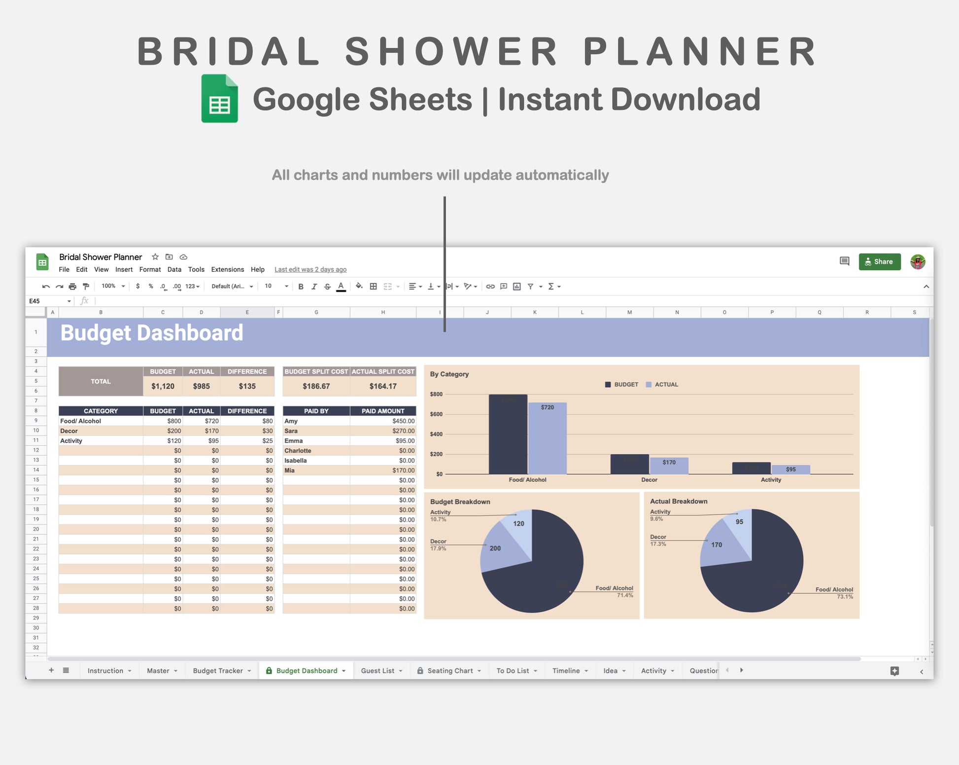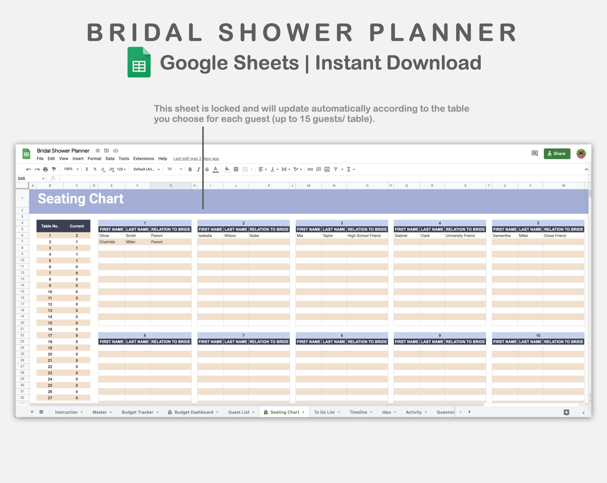 • There are 12 sheets: Instruction, Master, Budget Tracker, Budget Dashboard, Guest List, Seating Chart, To Do List, Timeline, Activity, Idea, Questions for Bride, and Formula.
