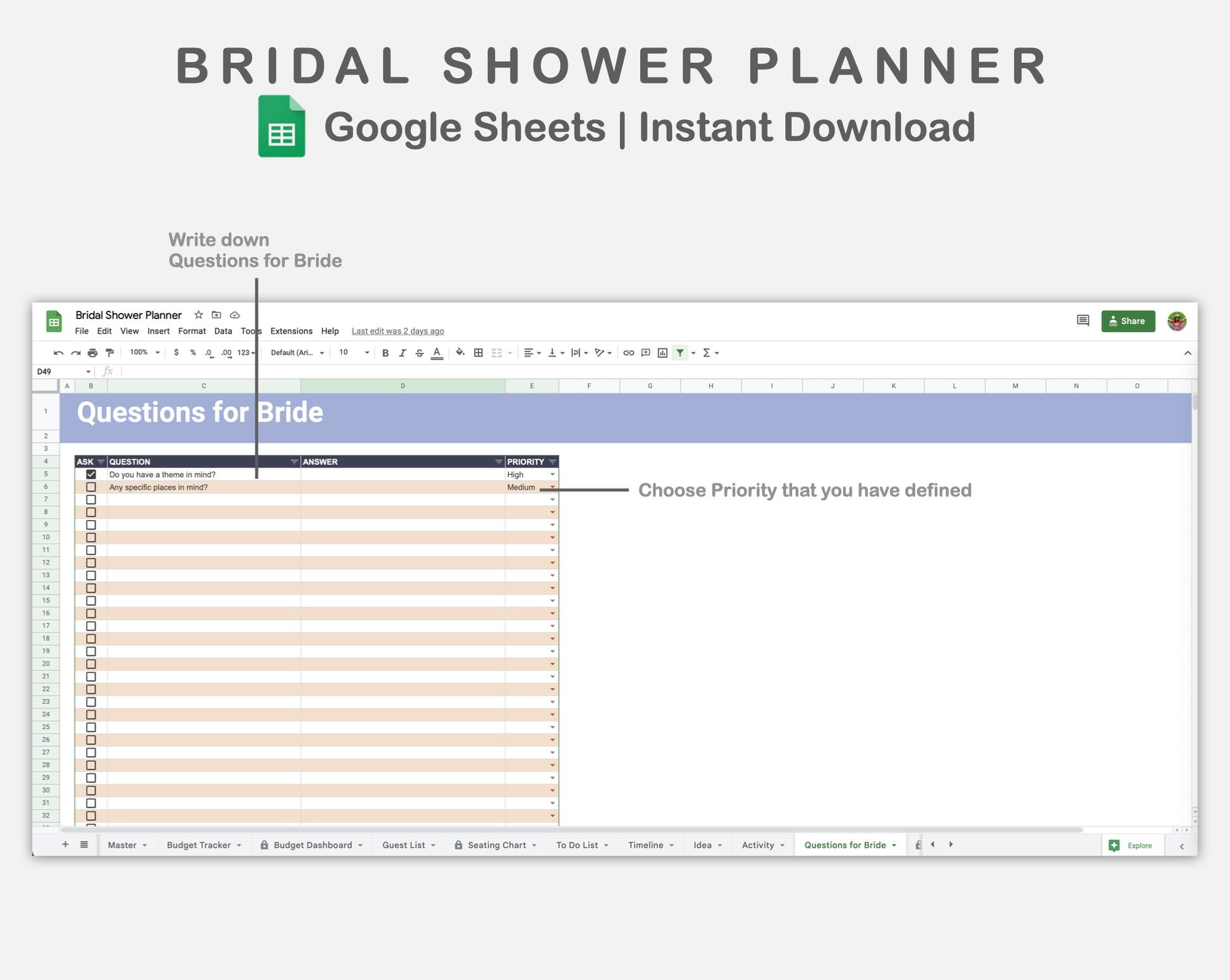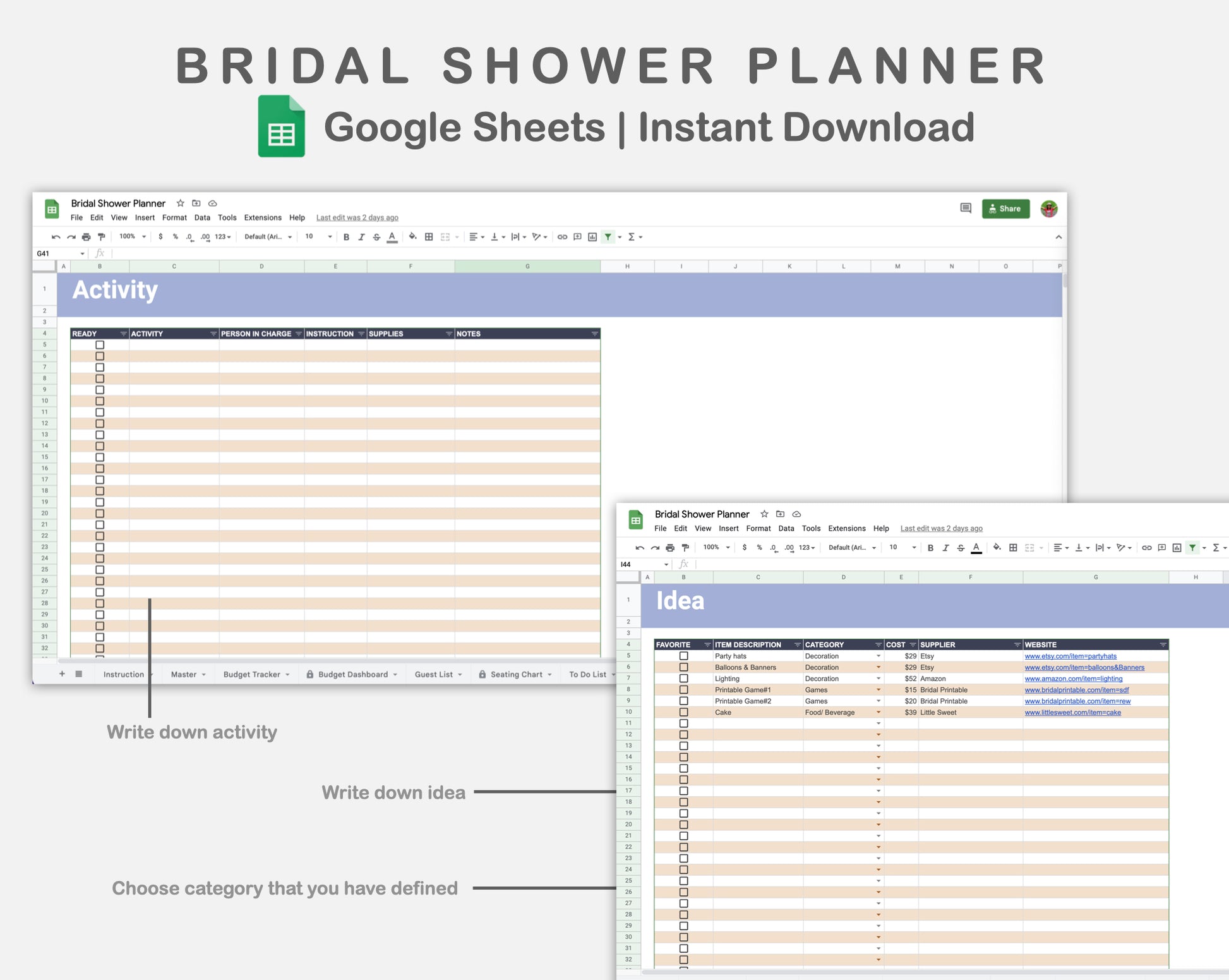 This Bridal Shower Planner Spreadsheet for Google Sheets is made in SWEET theme in order to help you plan and organize your Bridal Shower easily and effortlessly.