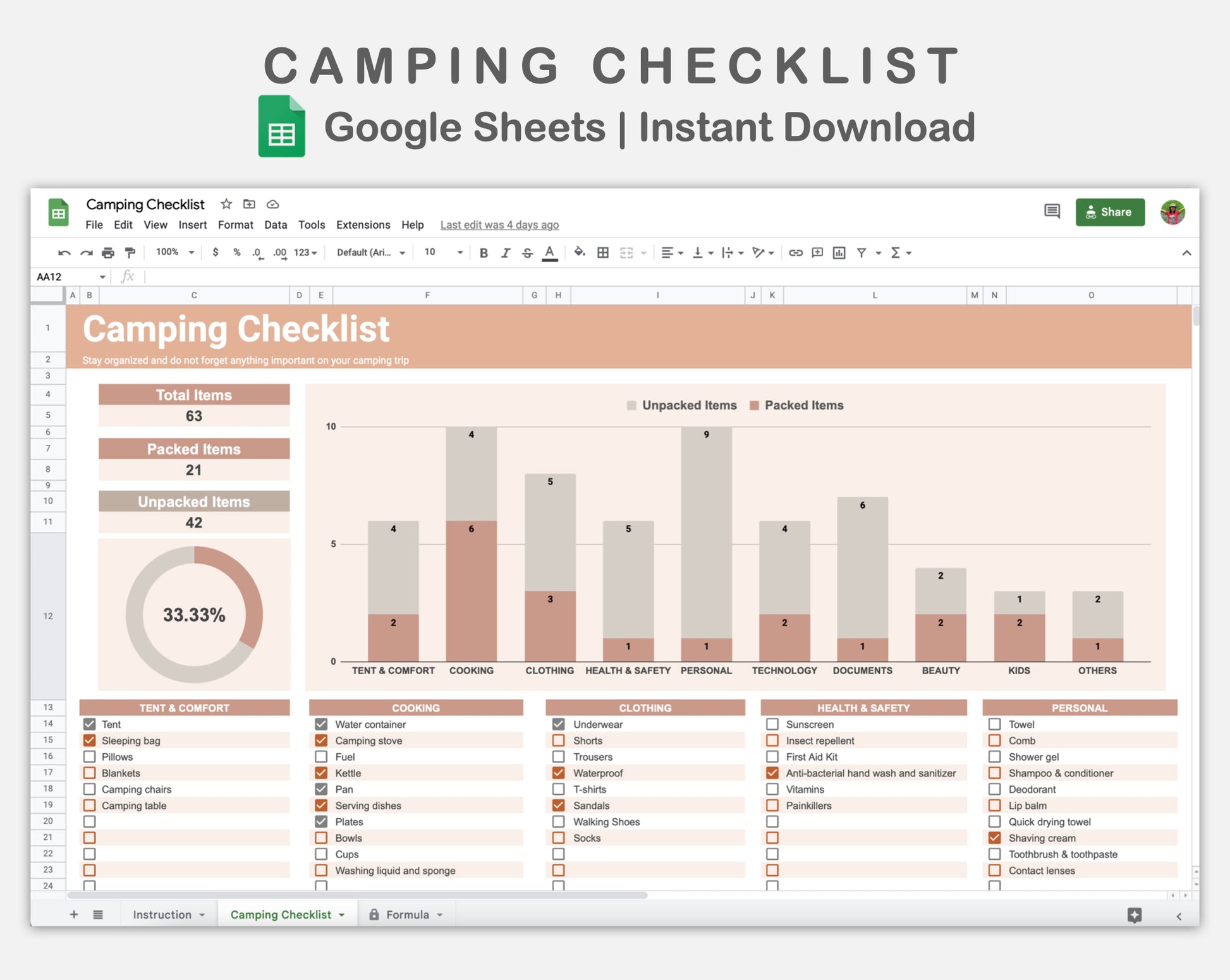 This Camping Checklist Spreadsheet for Google Sheets is made in NEUTRAL theme in order to help you stay organized and do not forget anything important on your camping trip.