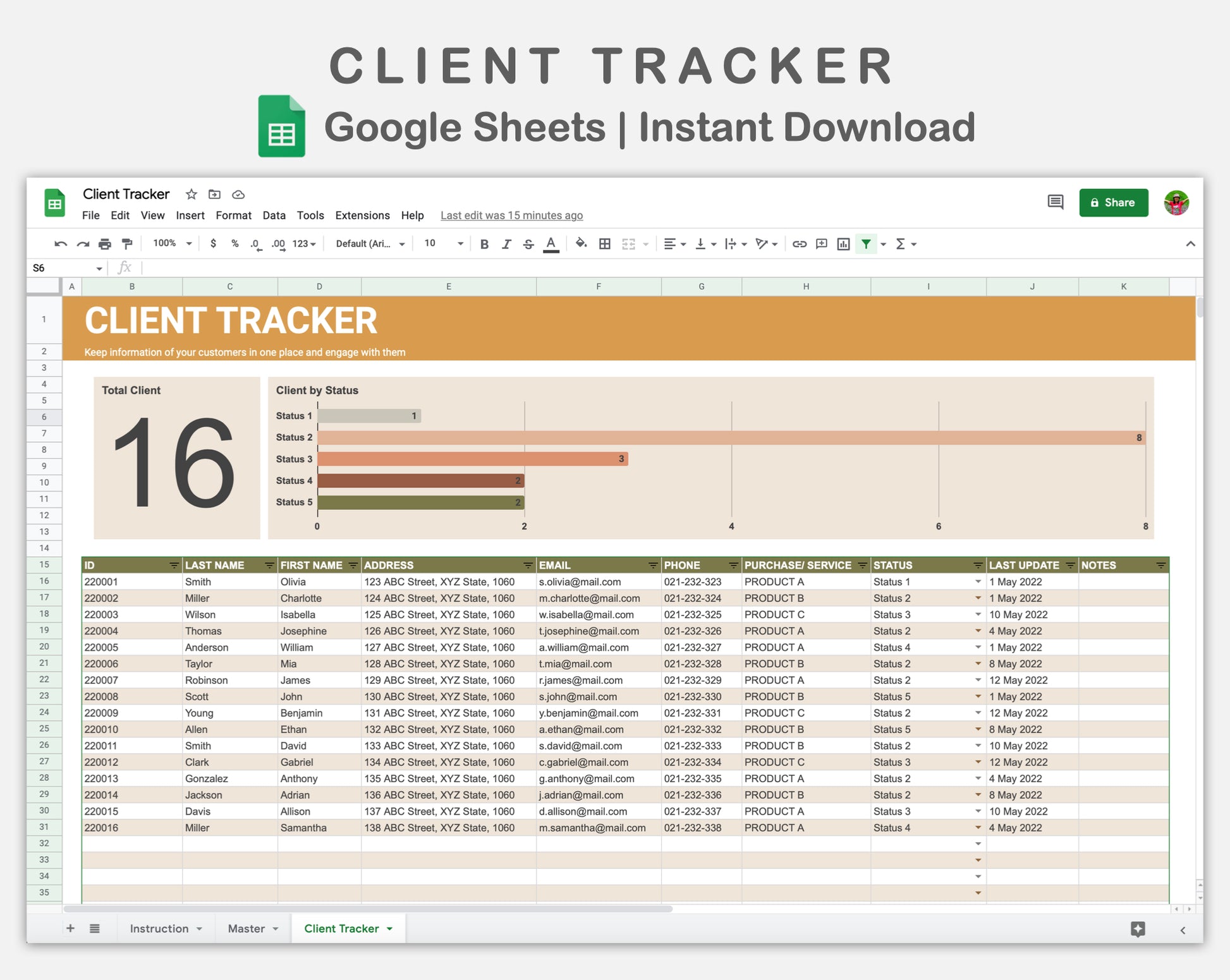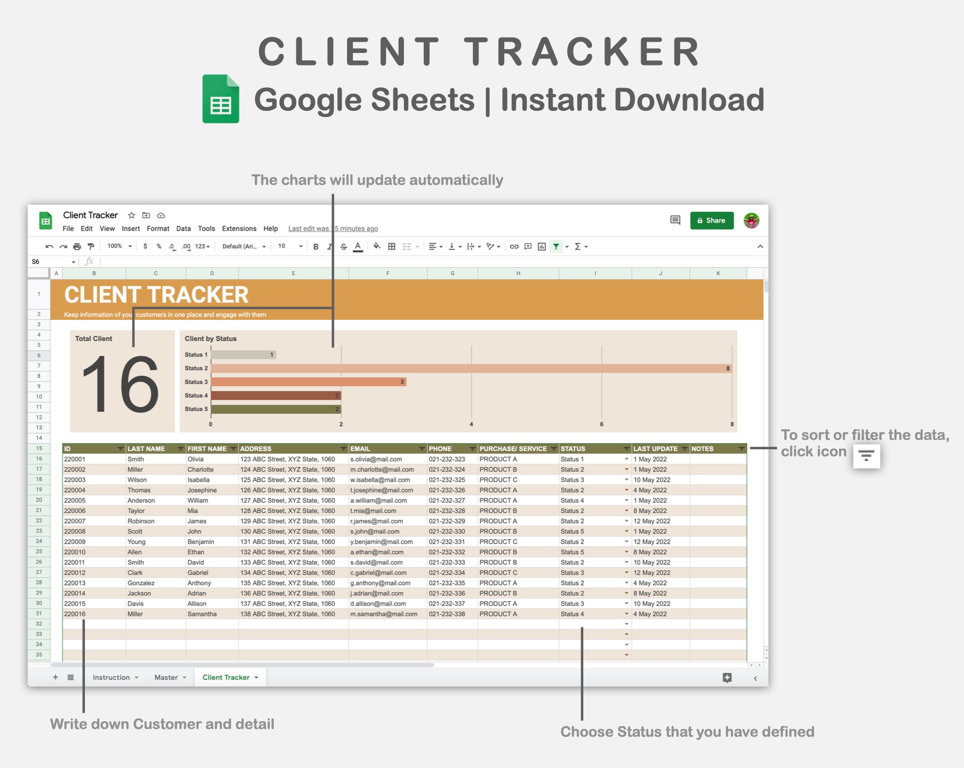 This Client Tracker Spreadsheet for Google Sheets is made in BOHO theme in order to help you keep information of your customers in one place and engage with them.