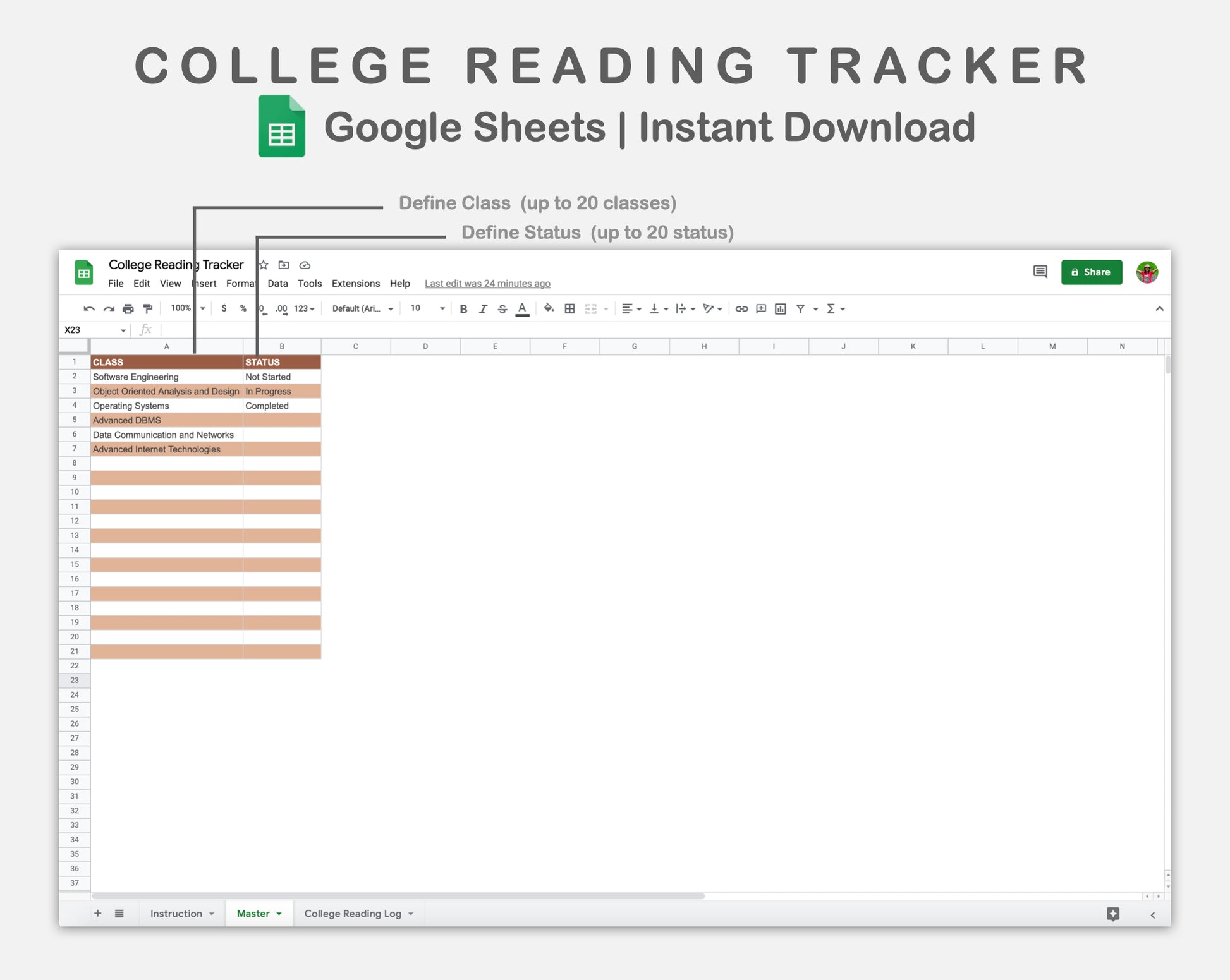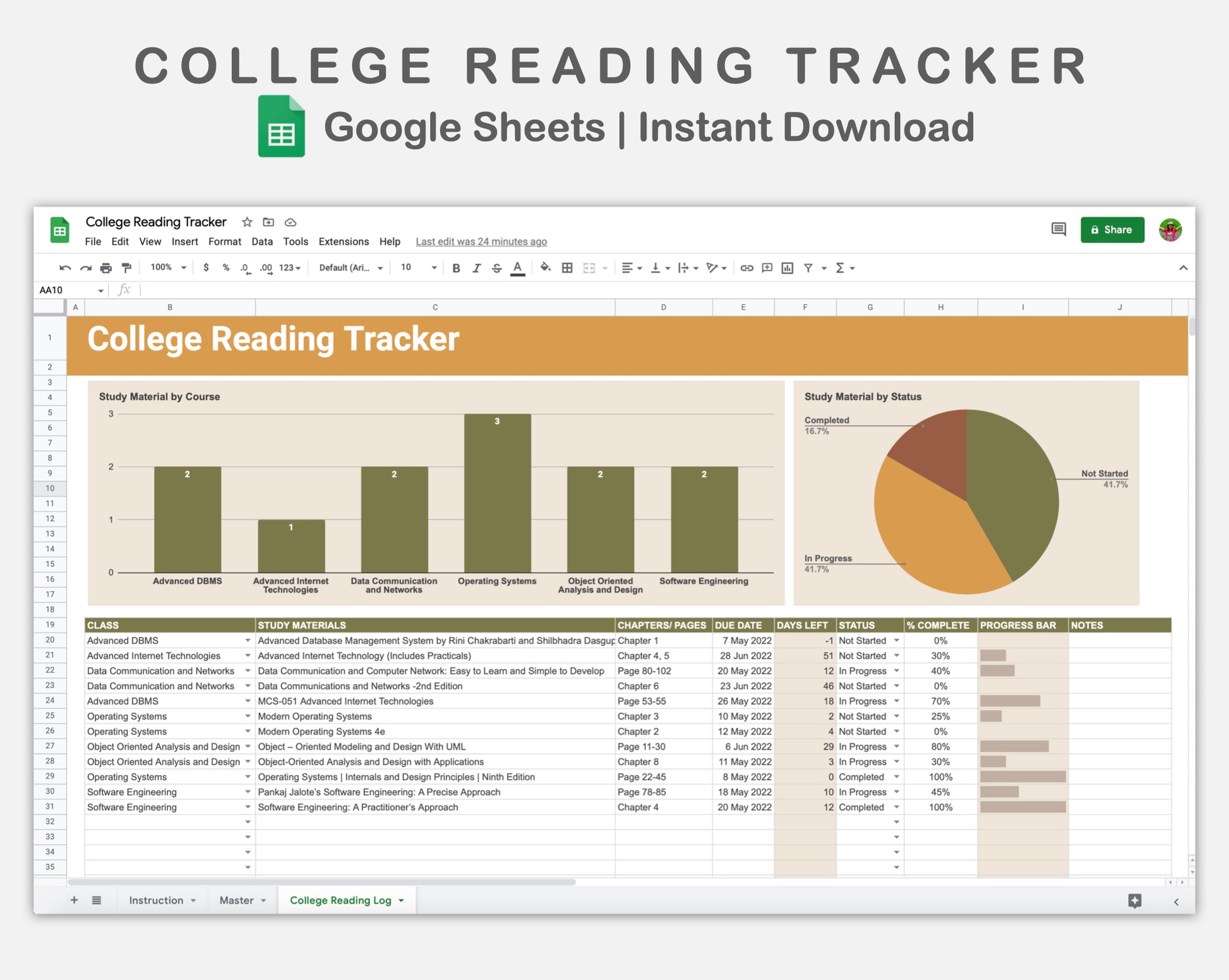 Google Sheets - College Reading Tracker - Boho