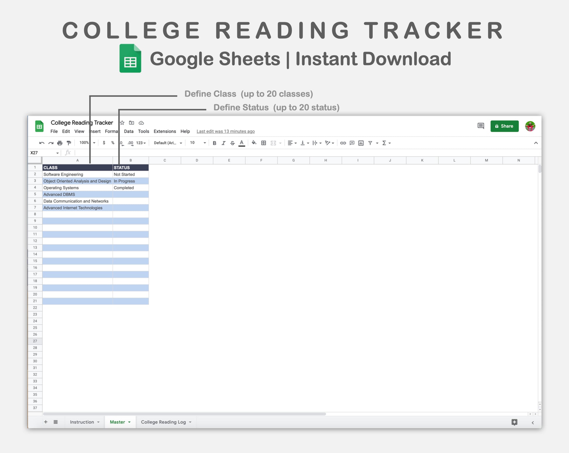 This College Reading Tracker Spreadsheet for Google Sheets is made in SWEET theme in order to help you plan and keep track of your reading.