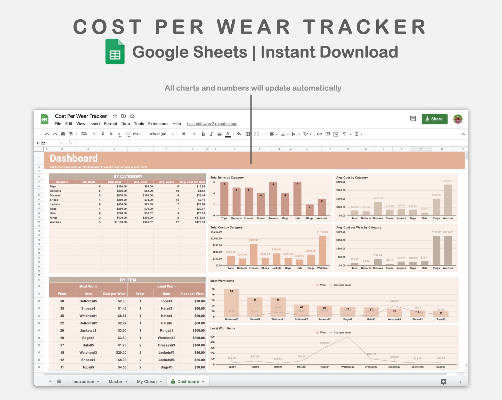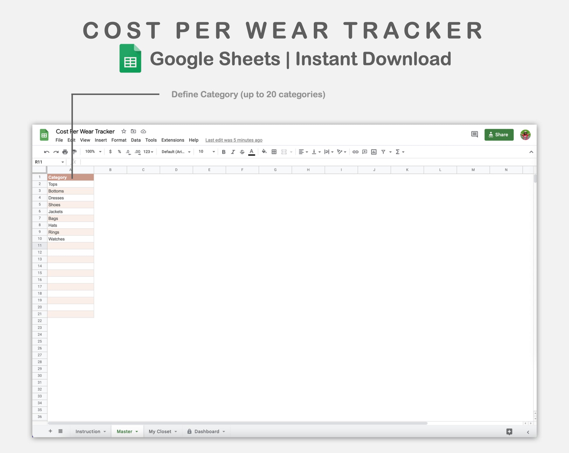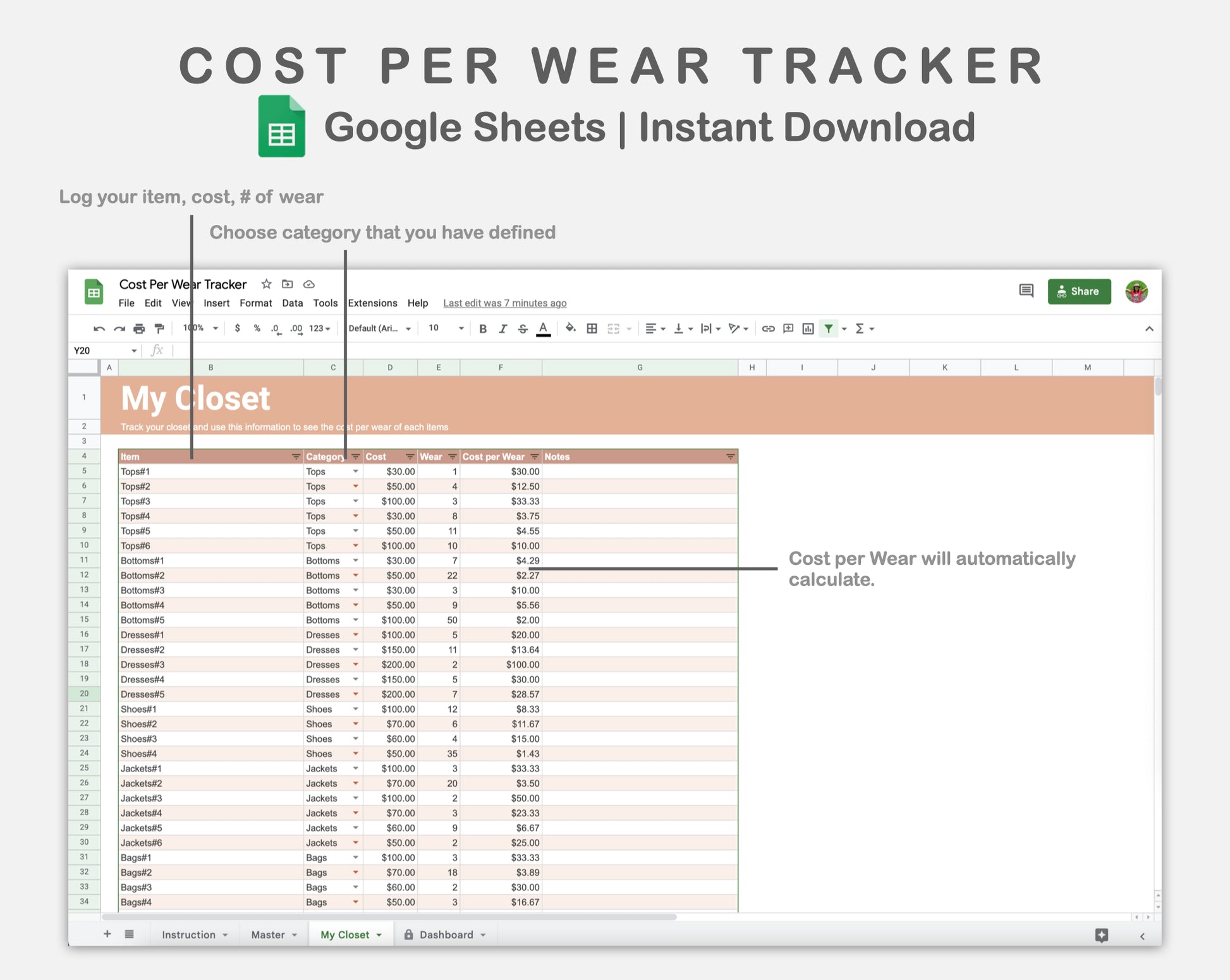 This Cost per Wear Tracker for Google Sheets is made in NEUTRAL theme in order to help you track your closet and use this information to see the cost per wear of each items.