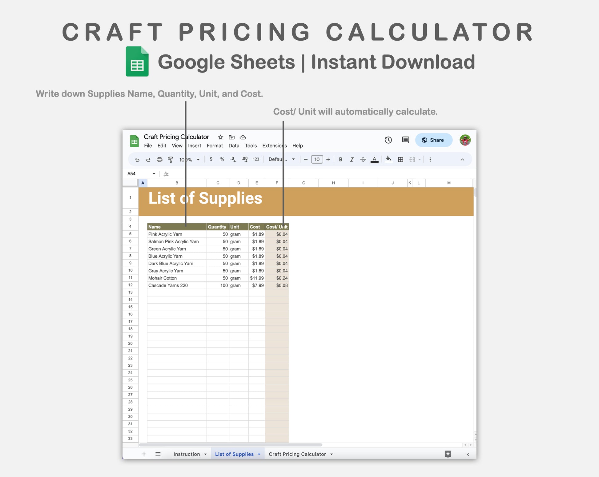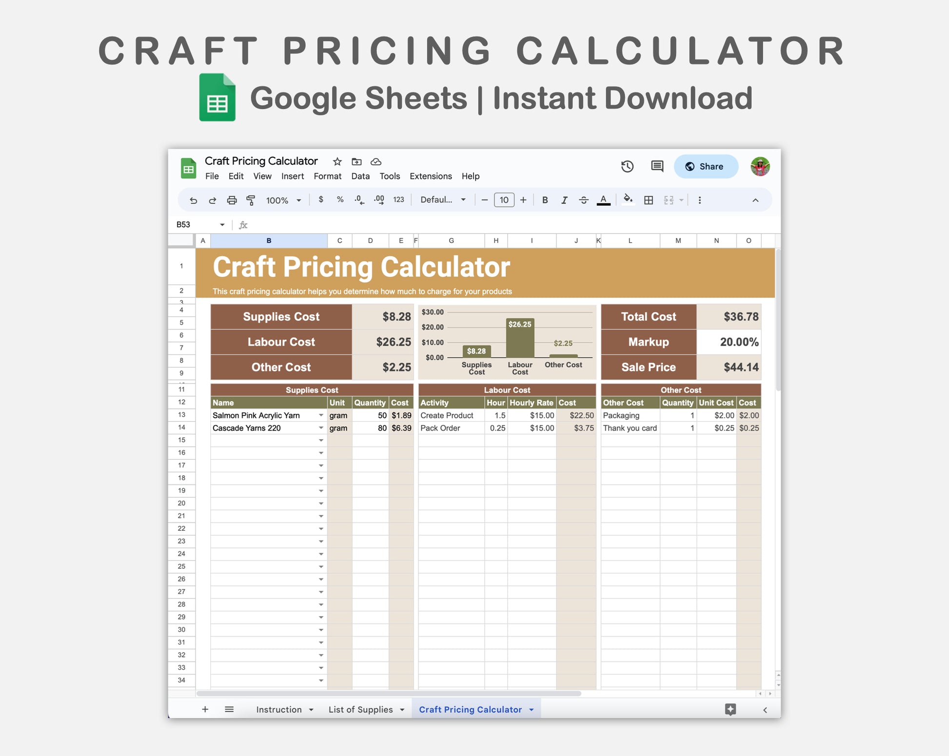 This Craft Pricing Calculator for Google Sheets is made in BOHO theme in order to helps you determine how much to charge for your products.