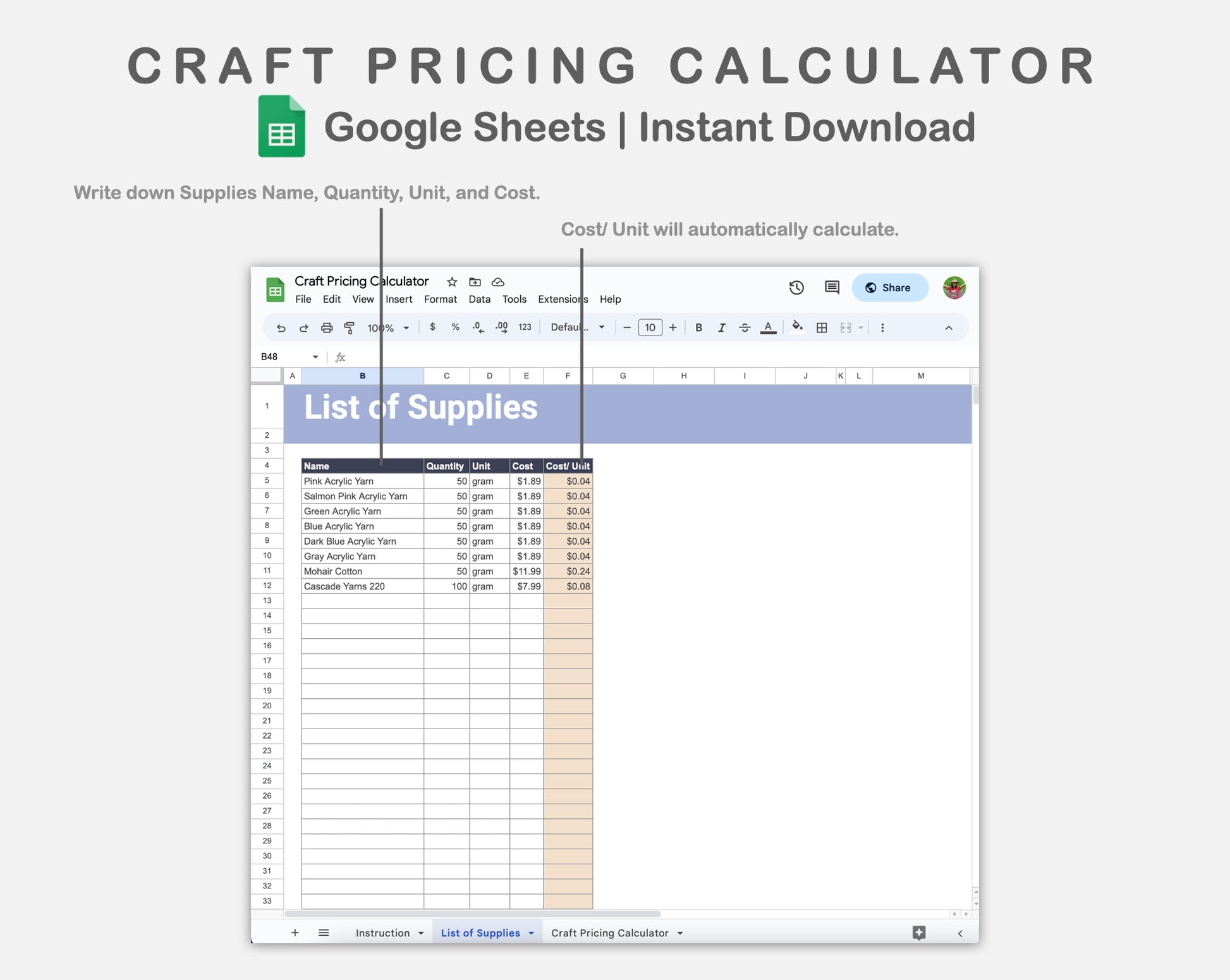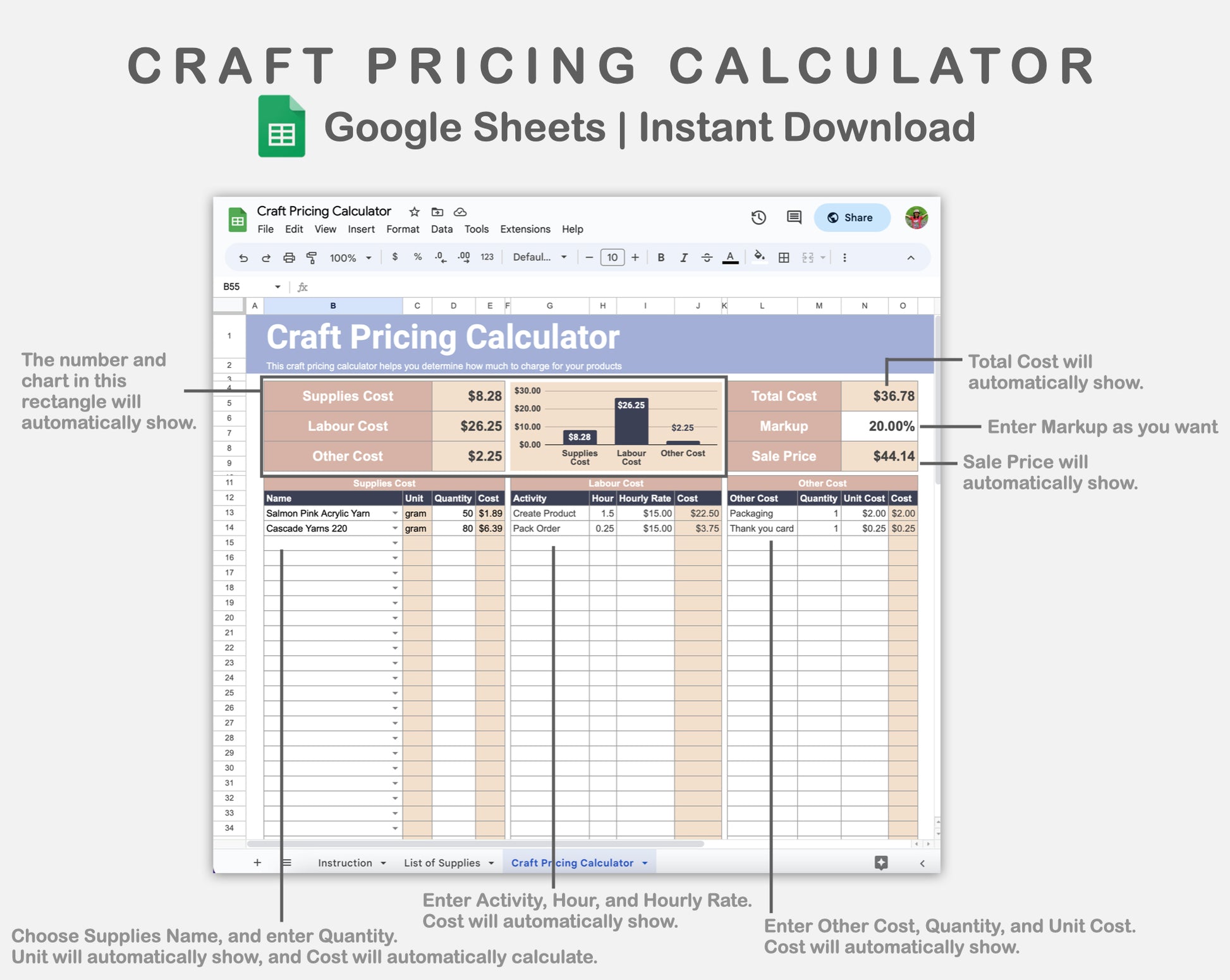 This Craft Pricing Calculator for Google Sheets is made in SWEET theme in order to helps you determine how much to charge for your products.
