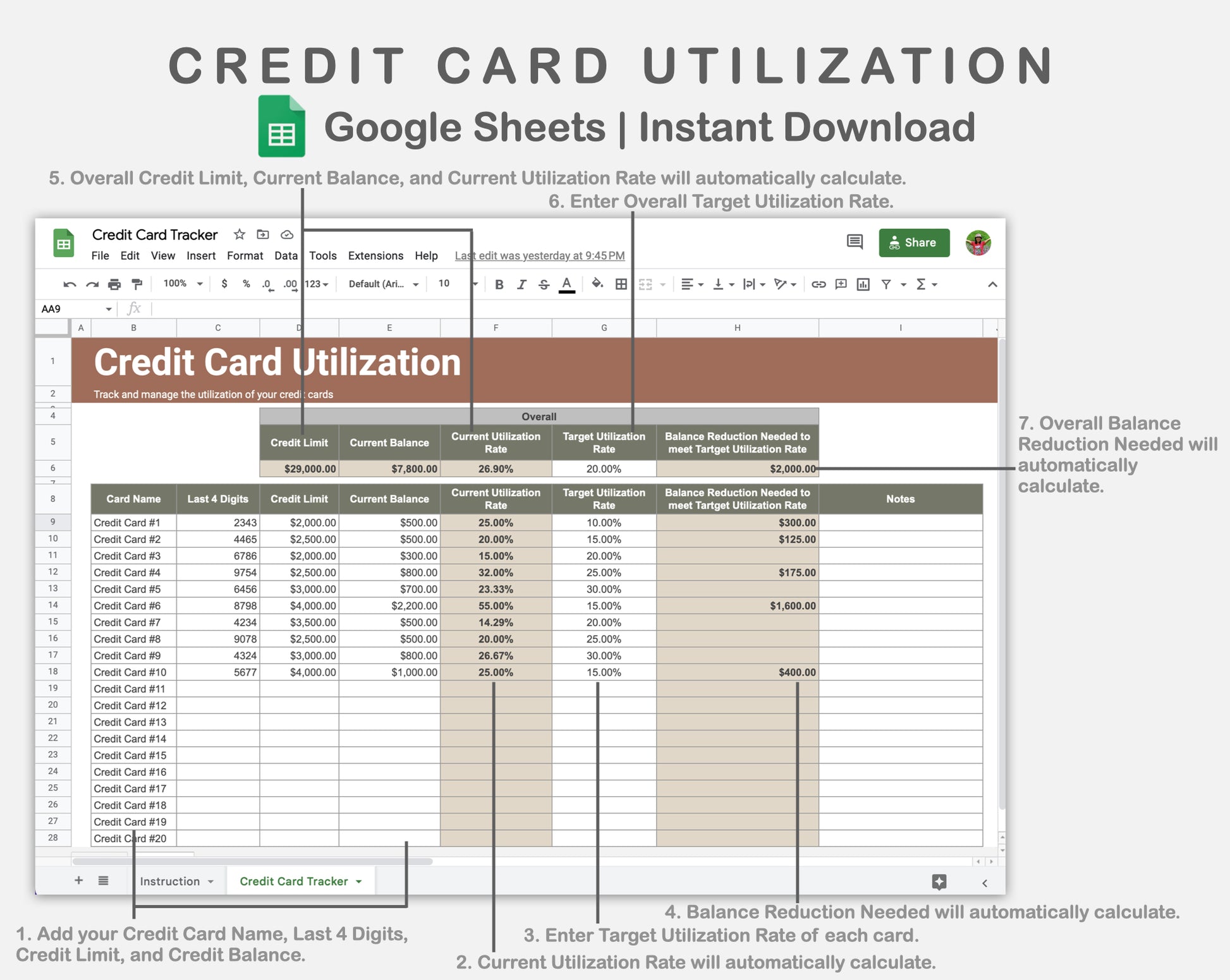 This Credit Card Utilization Spreadsheet for Google Sheets is made in EARTHY theme in order to help you track and manage the utilization of your credit cards.