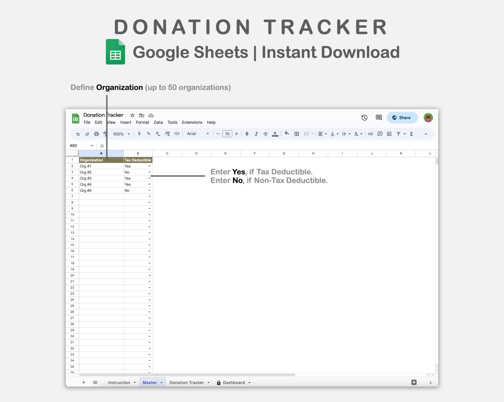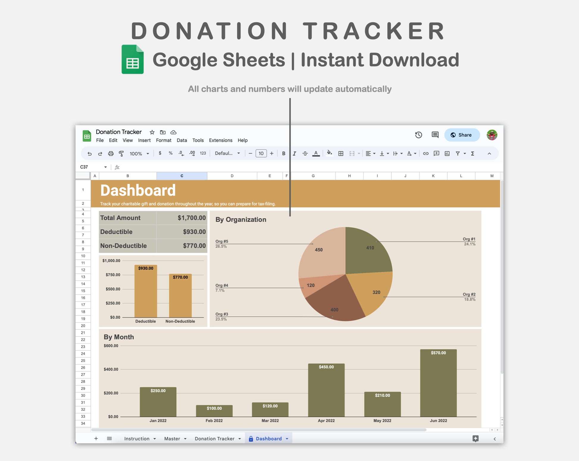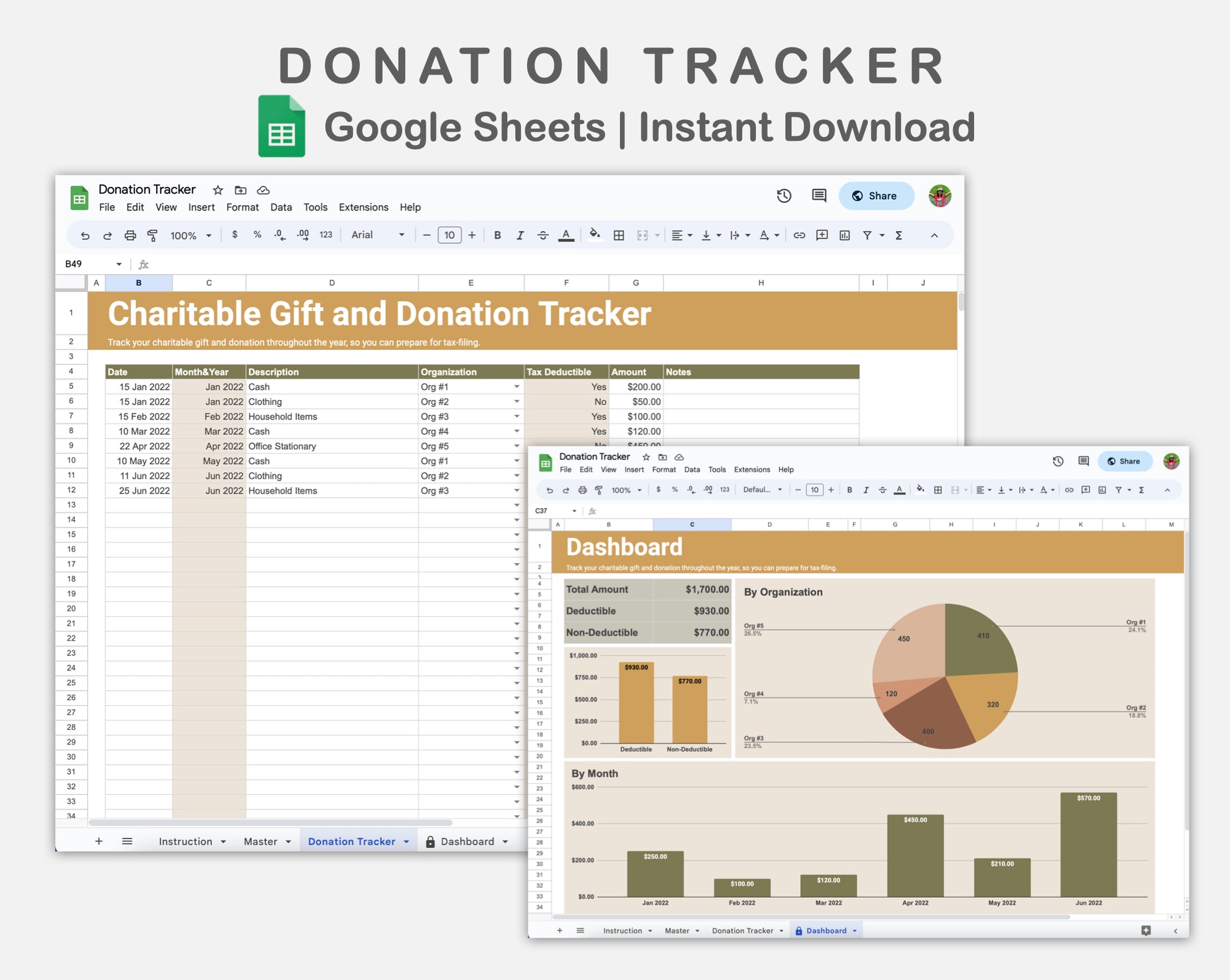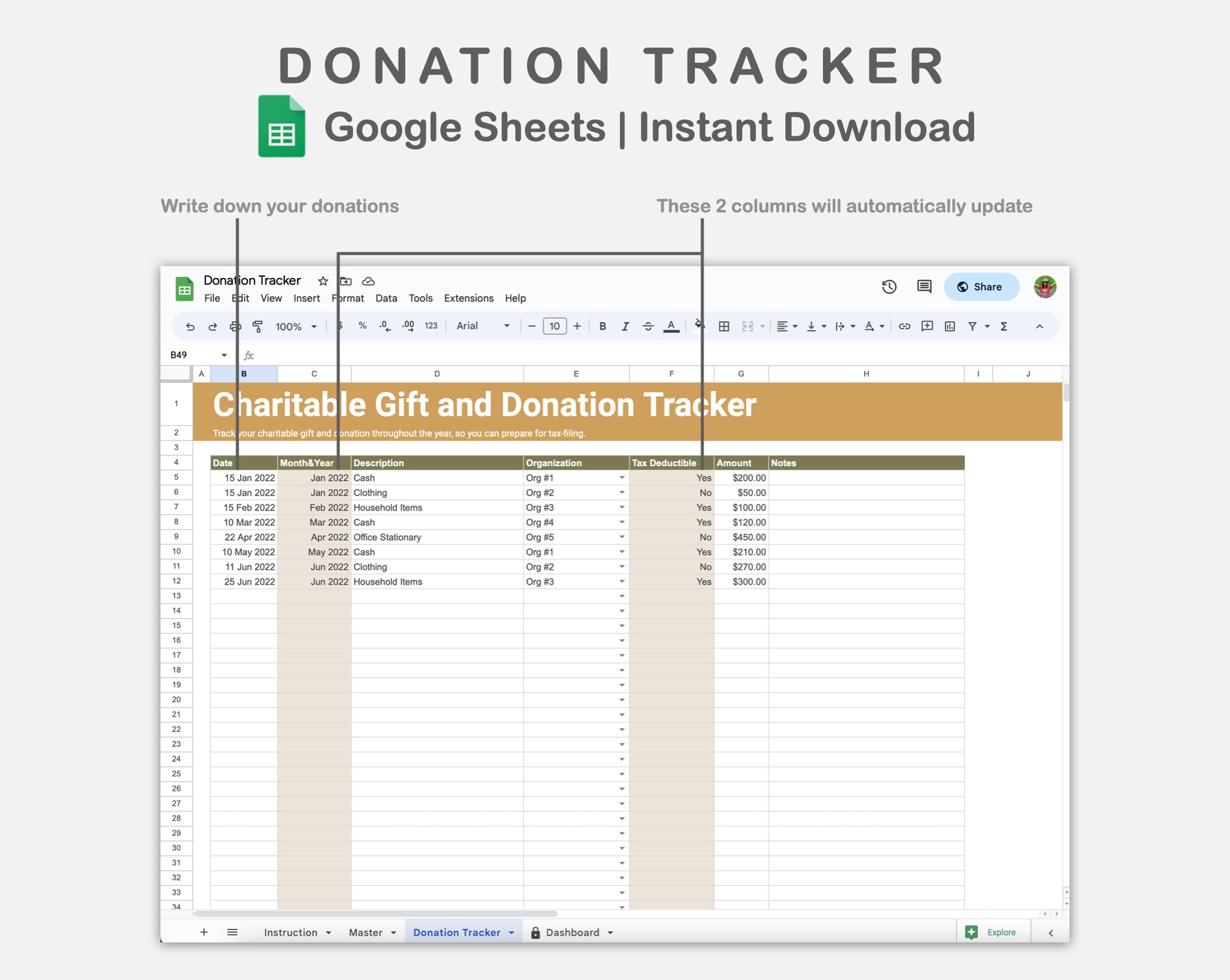 This Donation Tracker Spreadsheet for Google Sheets is made in BOHO theme in order to help you track your charitable gift and donation throughout the year, so you can prepare for tax-filing.