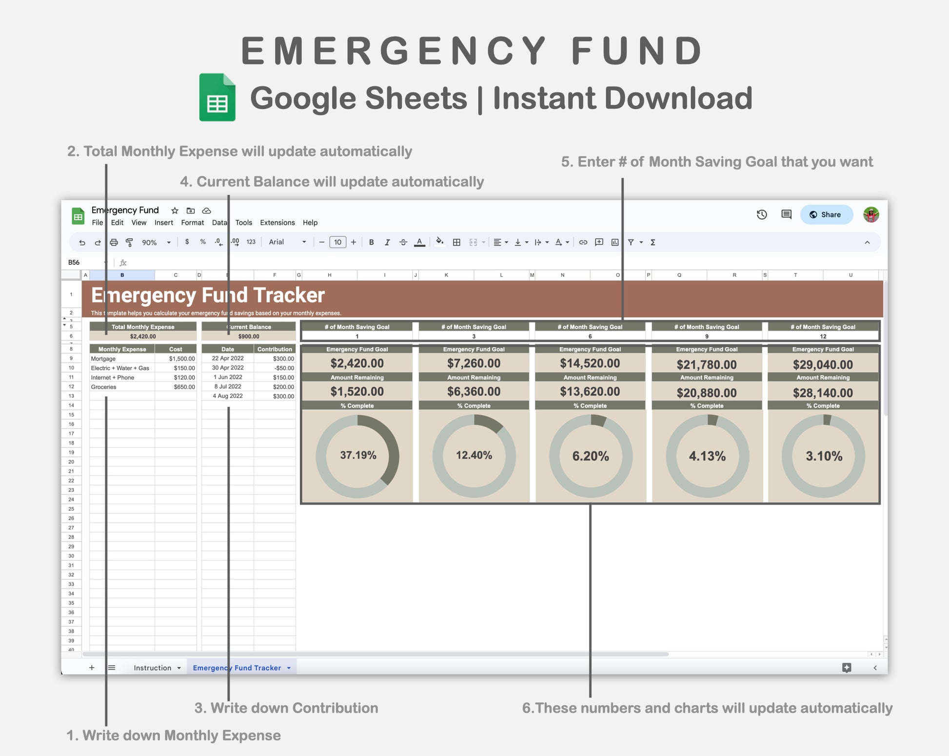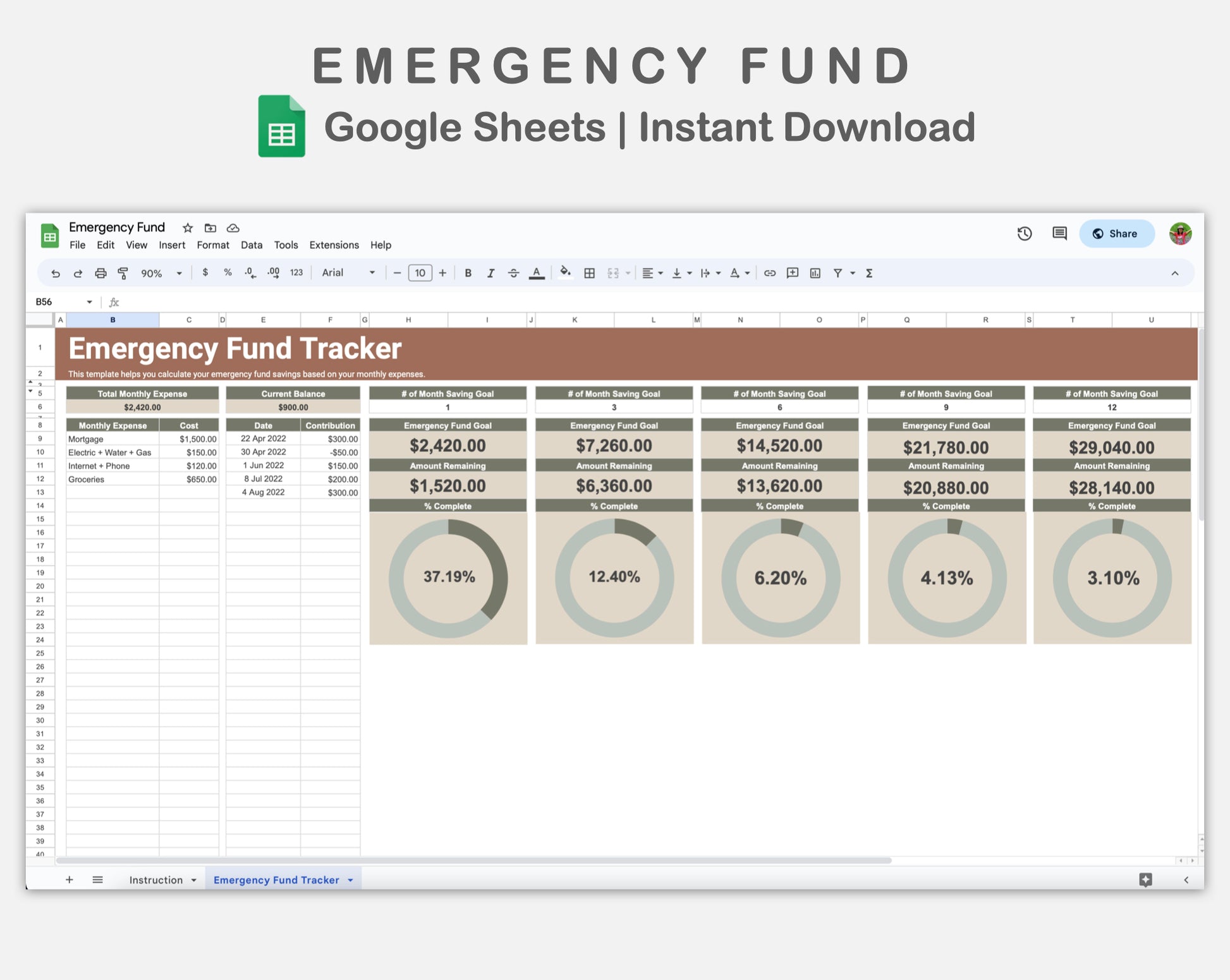This Emergency Fund Tracker Spreadsheet for Google Sheets is made in EARTHY theme in order to help you calculate your emergency fund savings based on your monthly expenses.