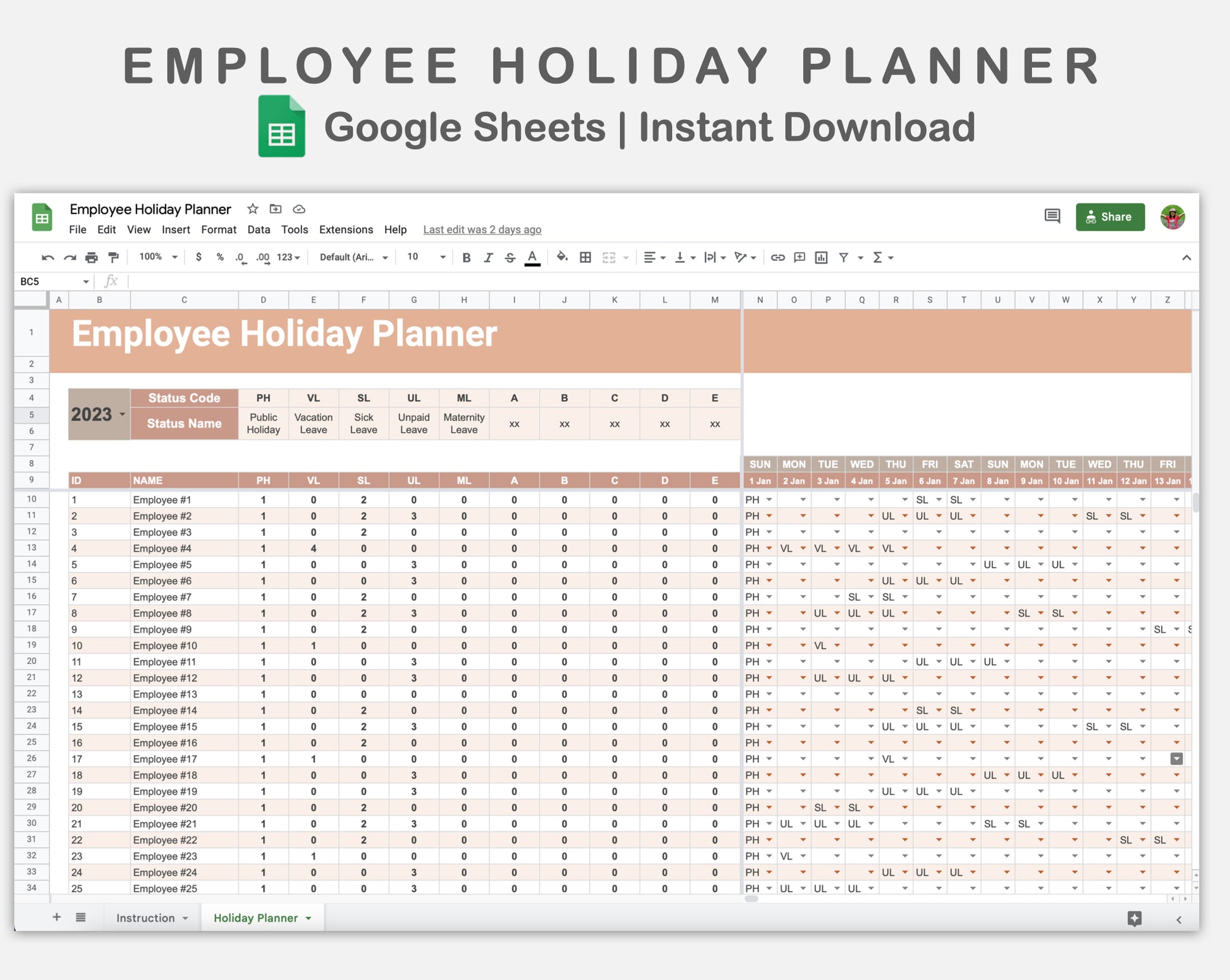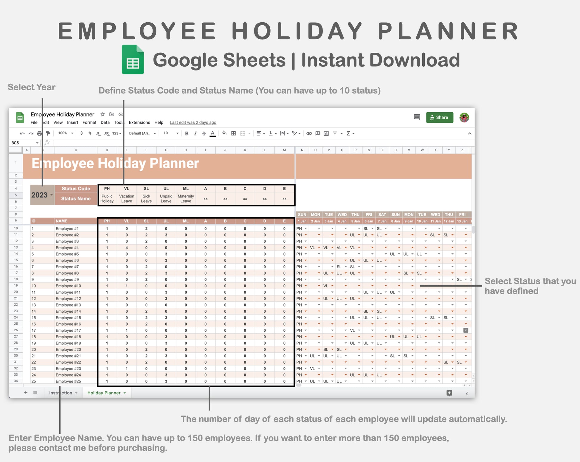 This Employee Holiday Planner for Google Sheets is made in NEUTRAL theme in order to help you plan your employee holiday, annual leave, and so on.