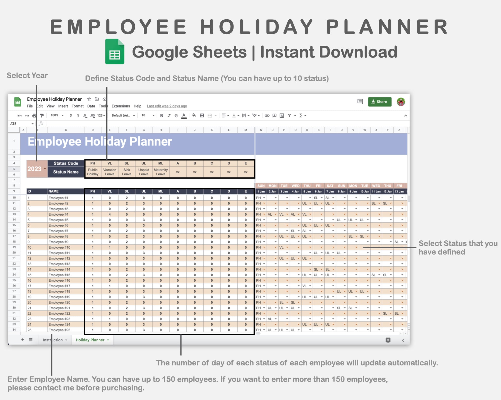 This Employee Holiday Planner for Google Sheets is made in SWEET theme in order to help you plan your employee holiday, annual leave, and so on.