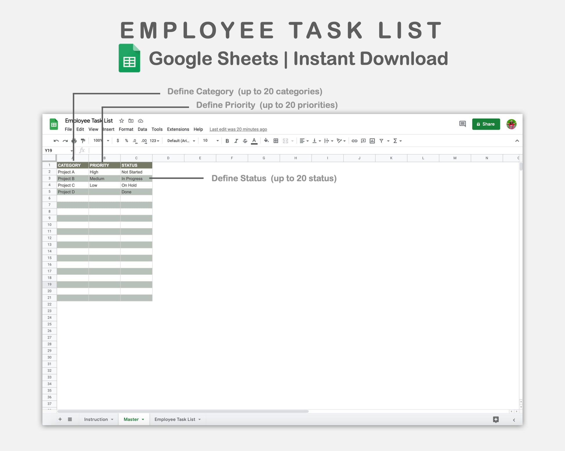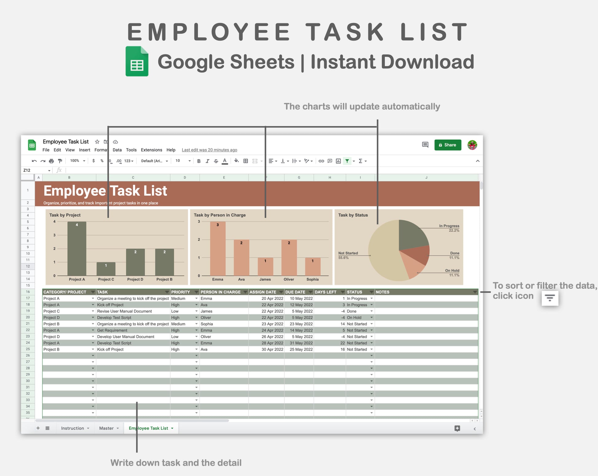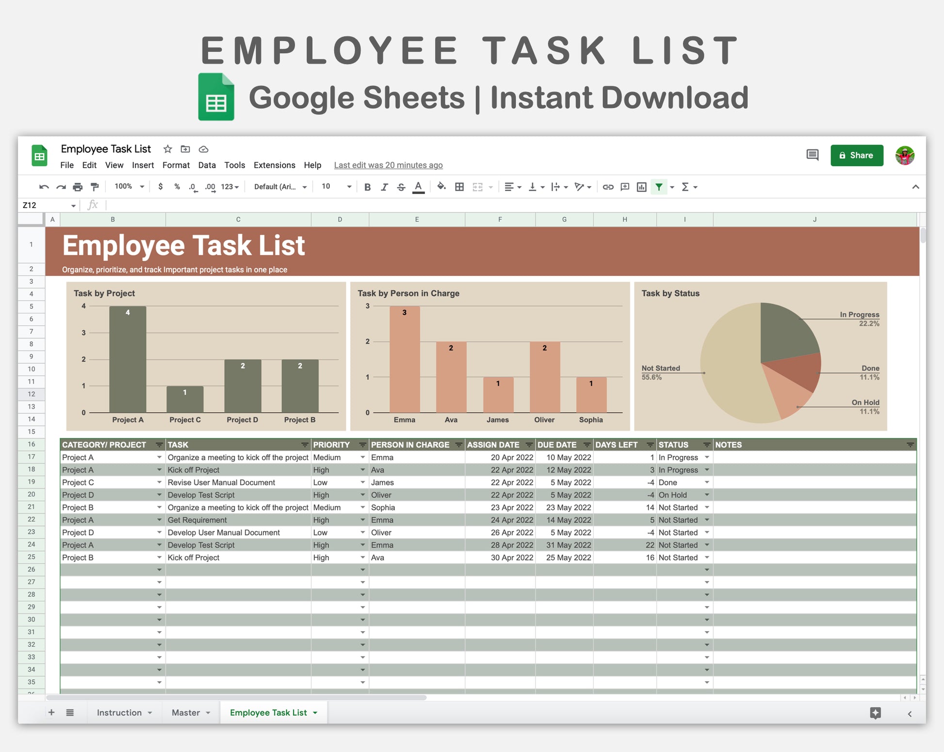 This Employee Task List Spreadsheet for Google Sheets is made in EARTHY theme in order to organize, prioritize, and track Important project tasks in one place.