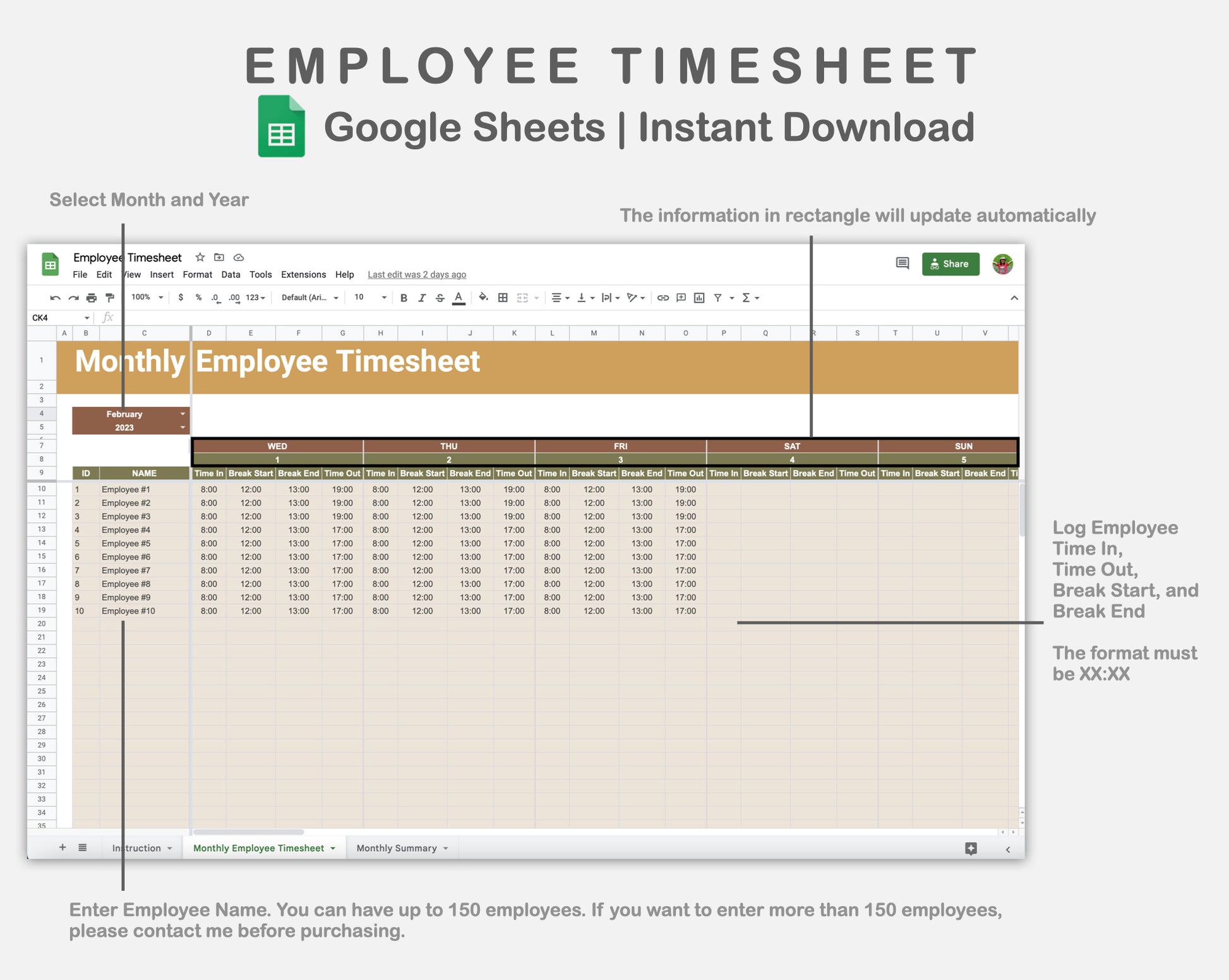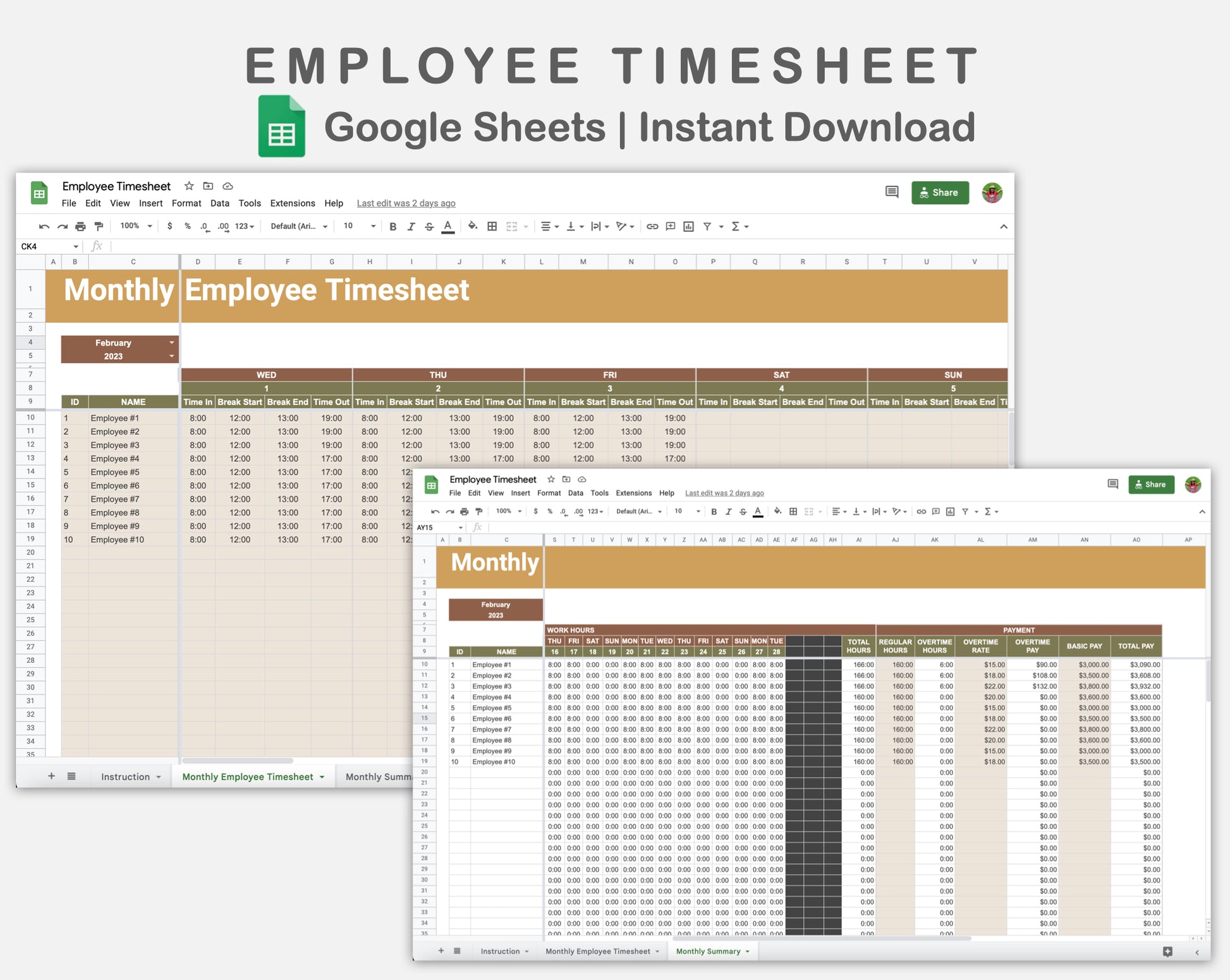 This Employee Timesheet for Google Sheets is made in BOHO theme in order to help you log employee work hours and also calculate salary.