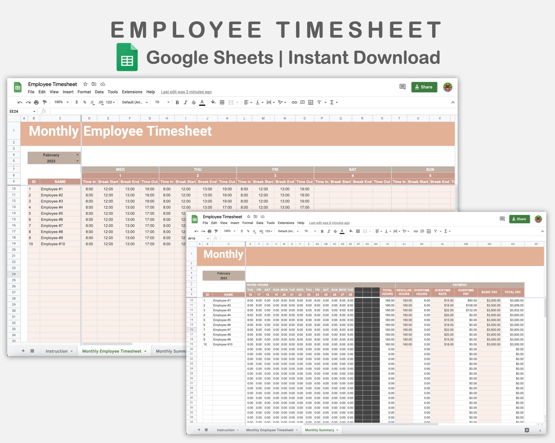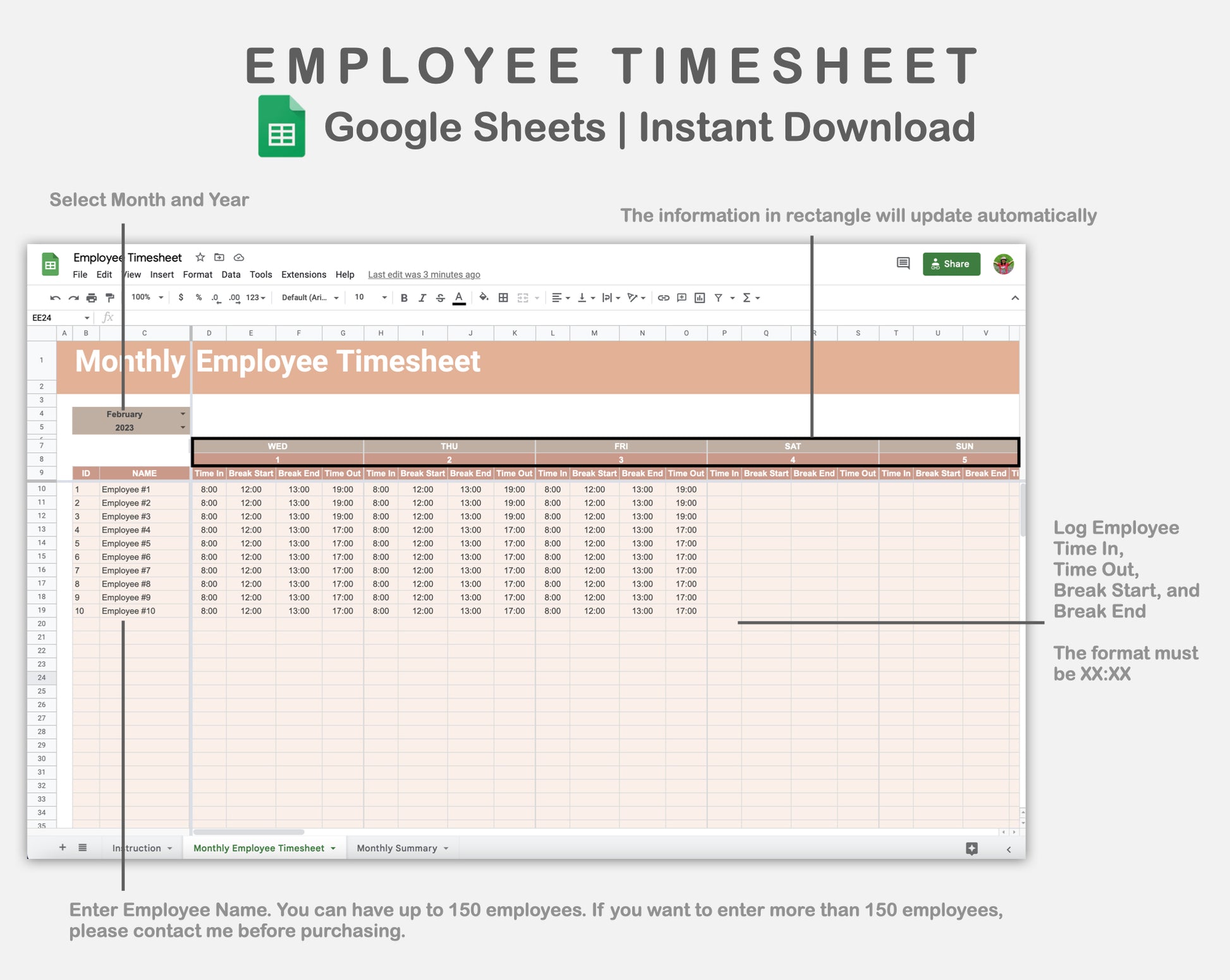 This Employee Timesheet for Google Sheets is made in NEUTRAL theme in order to help you log employee work hours and also calculate salary.