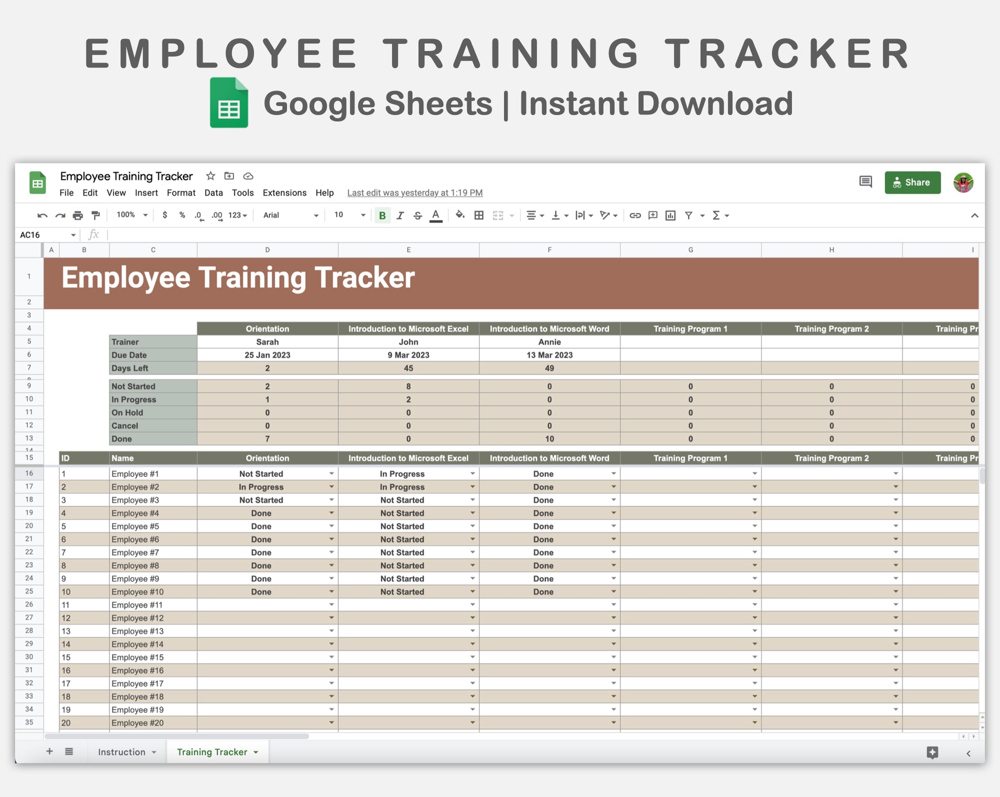 This Employee Training Tracker for Google Sheets is made in EARTHY theme in order to help you manage and keep track of trainings of your employee.