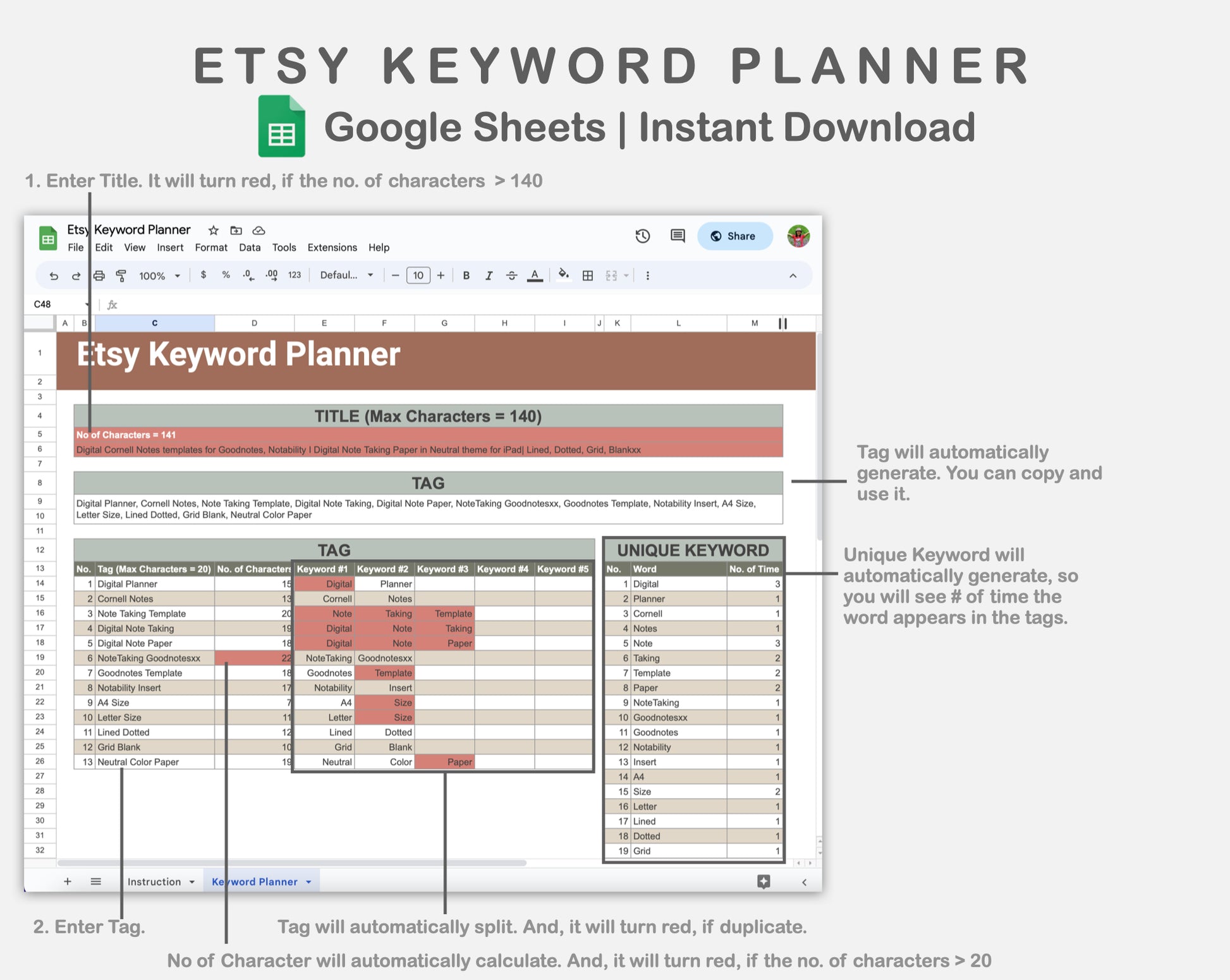 This Etsy Keyword Planner Spreadsheet for Google Sheets is made in EARTHY theme in order to help you create your Etsy listing title and tags effectively and optimize your Etsy SEO to improve your listings' visibility. This template does NOT find keywords automatically.