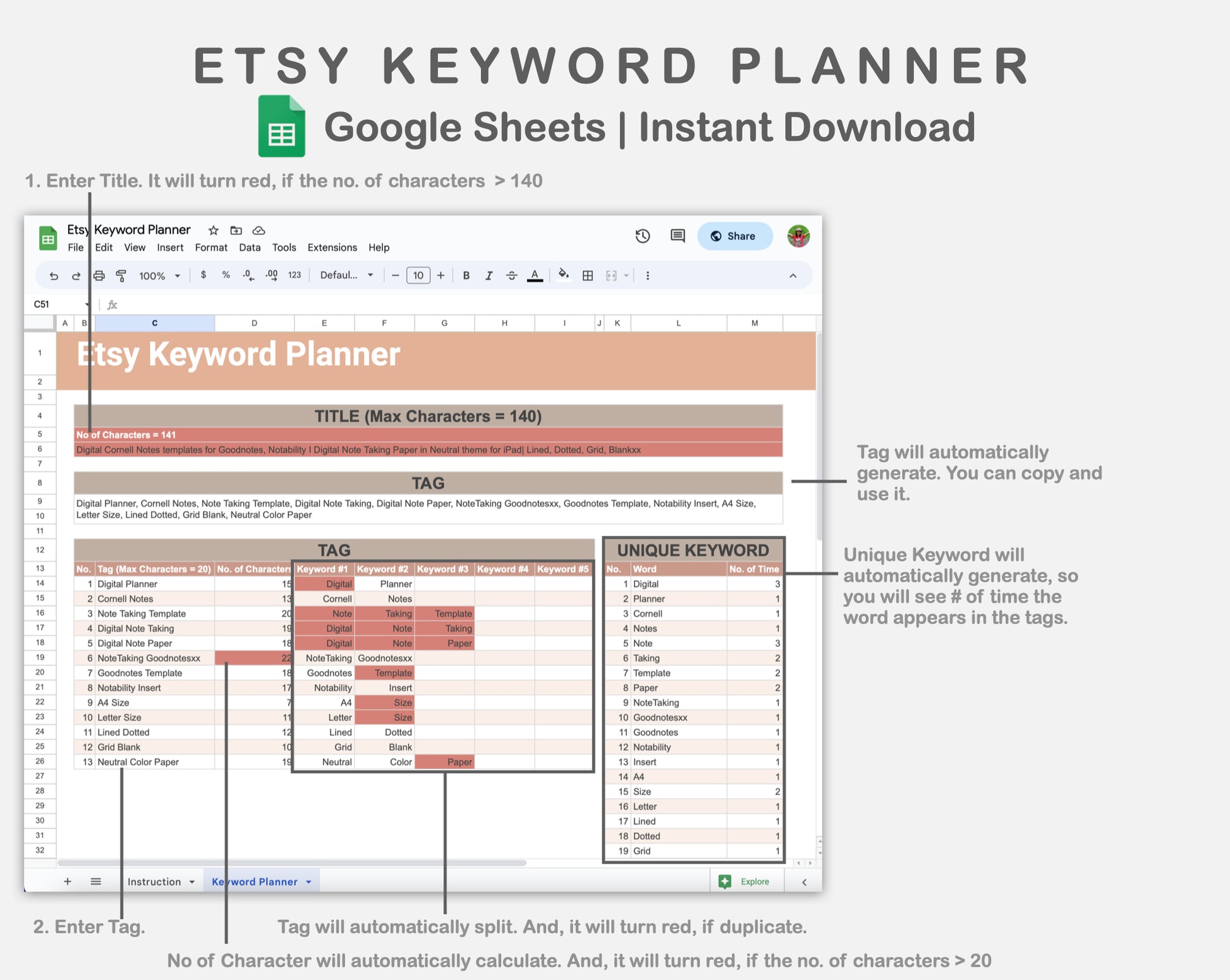 This Etsy Keyword Planner Spreadsheet for Google Sheets is made in NEUTRAL theme in order to help you create your Etsy listing title and tags effectively and optimize your Etsy SEO to improve your listings' visibility. This template does NOT find keywords automatically.
