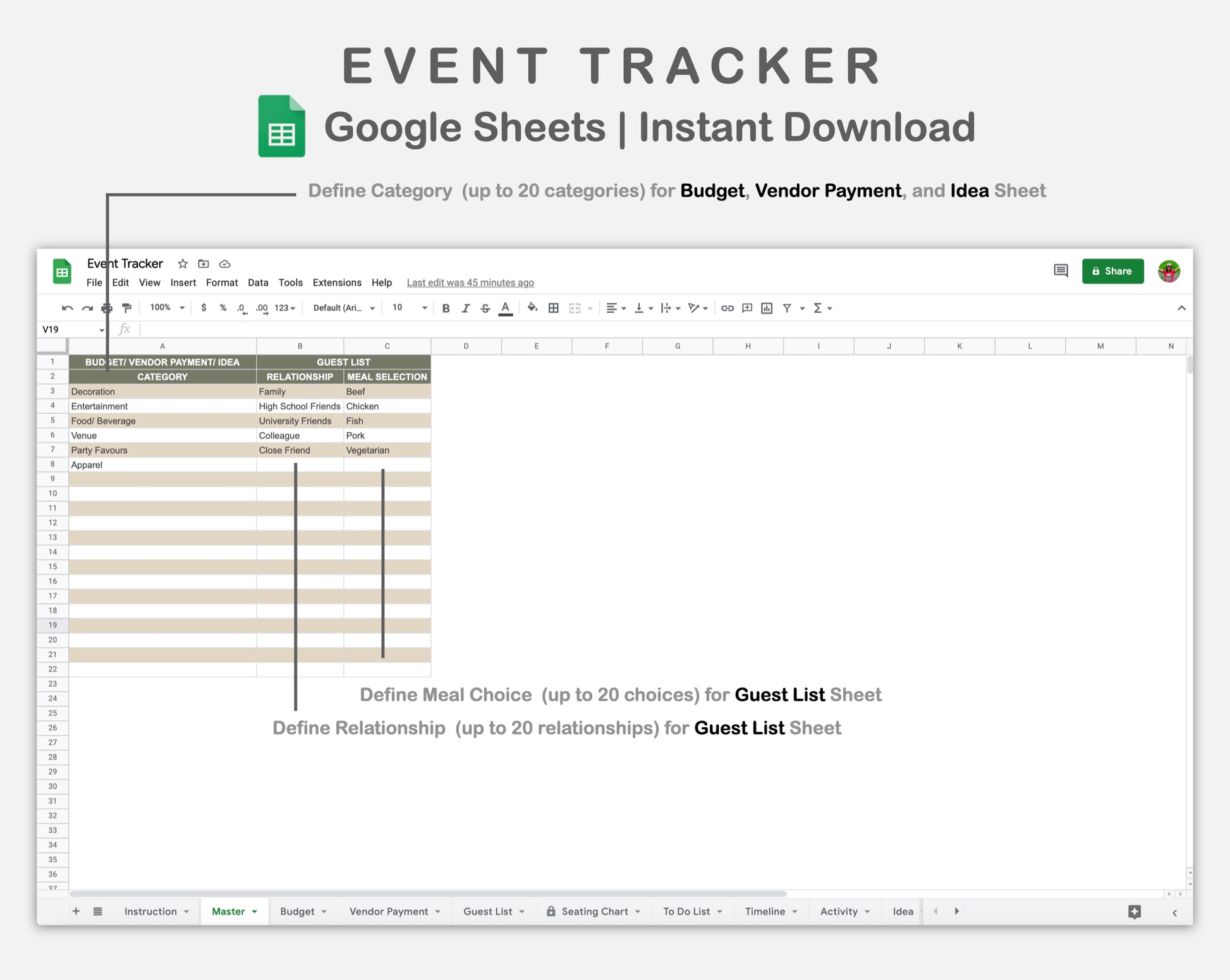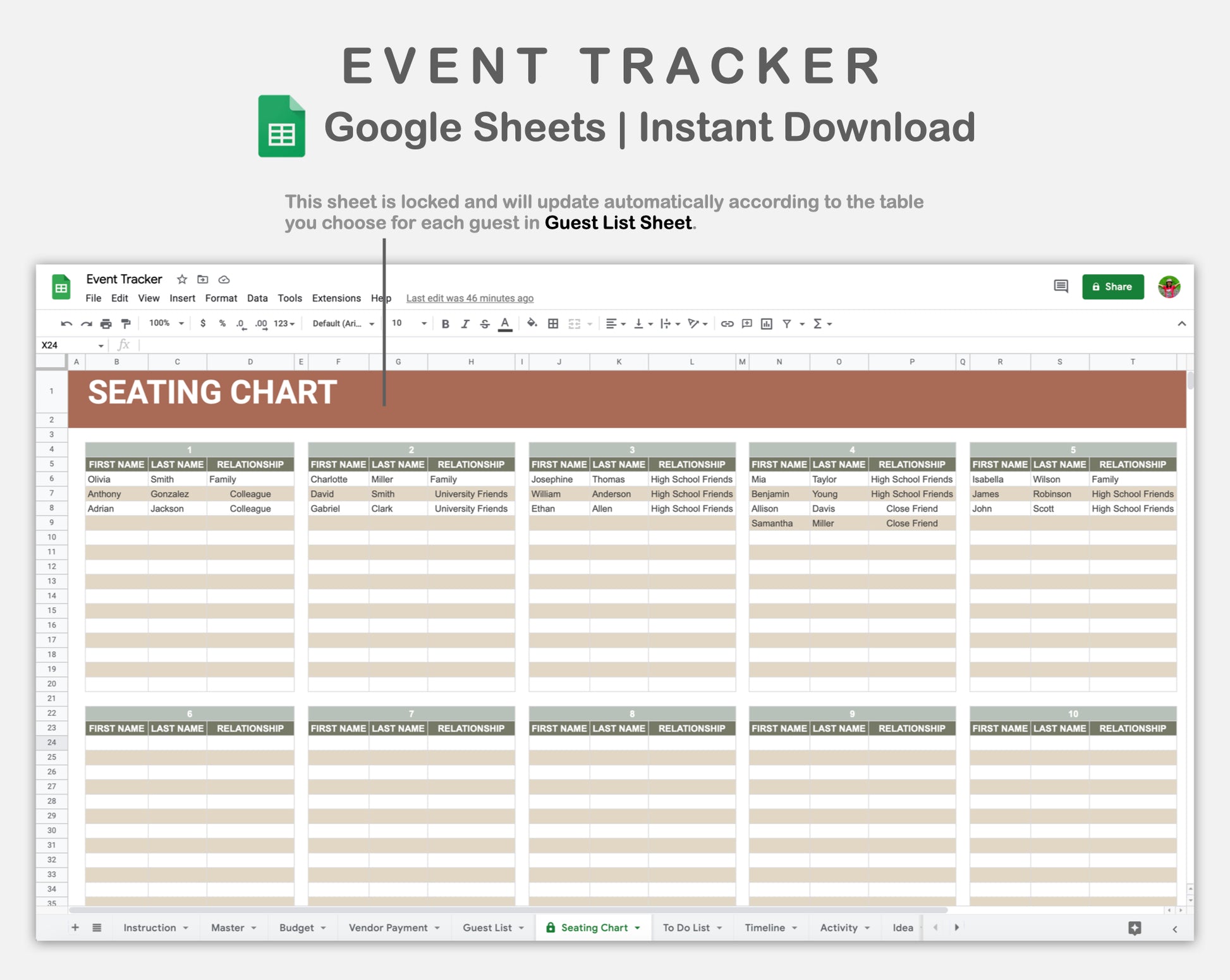 • There are 10 sheets: Instruction, Master, Budget, Vendor Payment, Guest List, Seating Chart, To Do List, Timeline, Activity, and Idea.