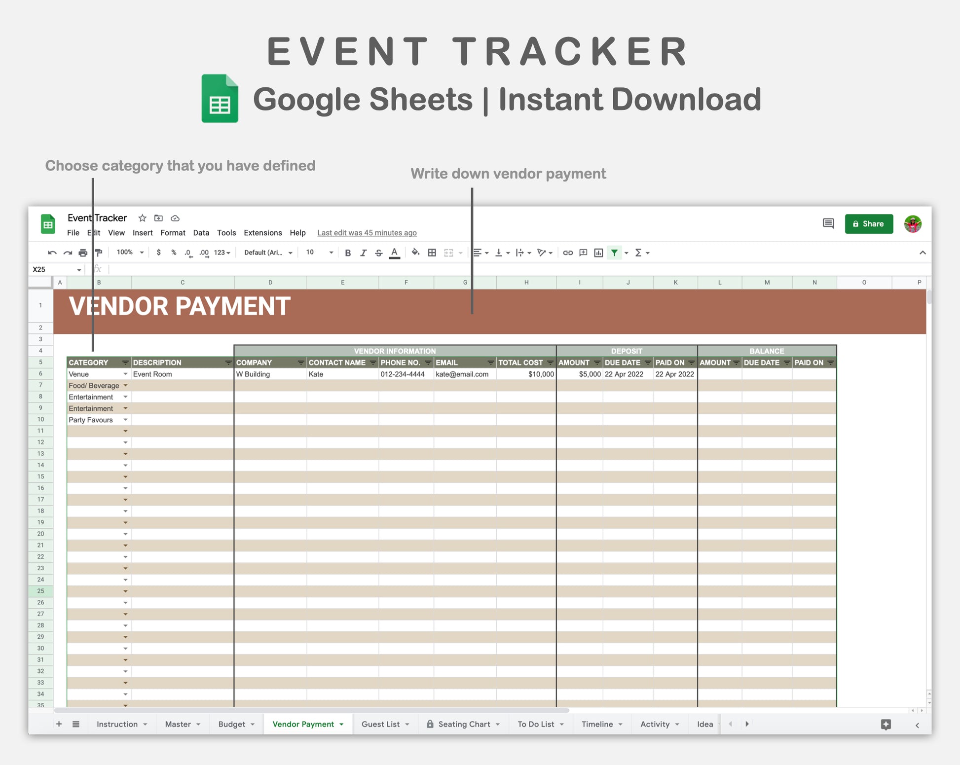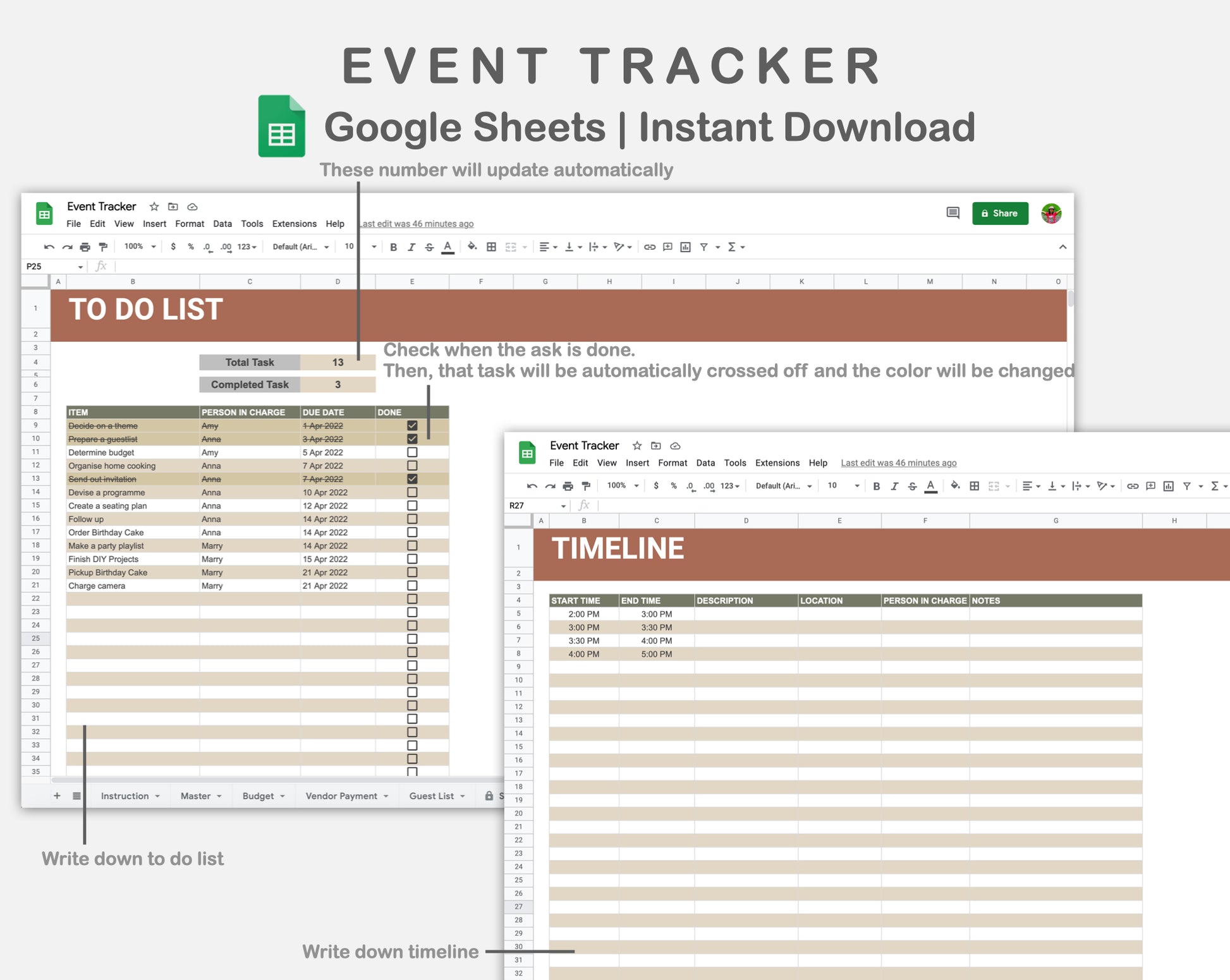 This Event Planner Spreadsheet for Google Sheets is made in EARTHY theme in order to help you organize your event or party.