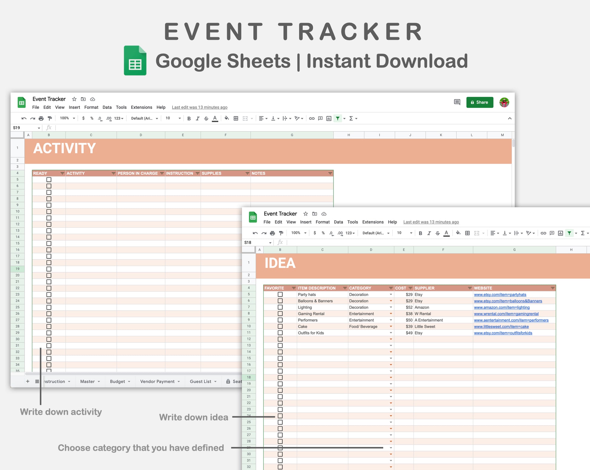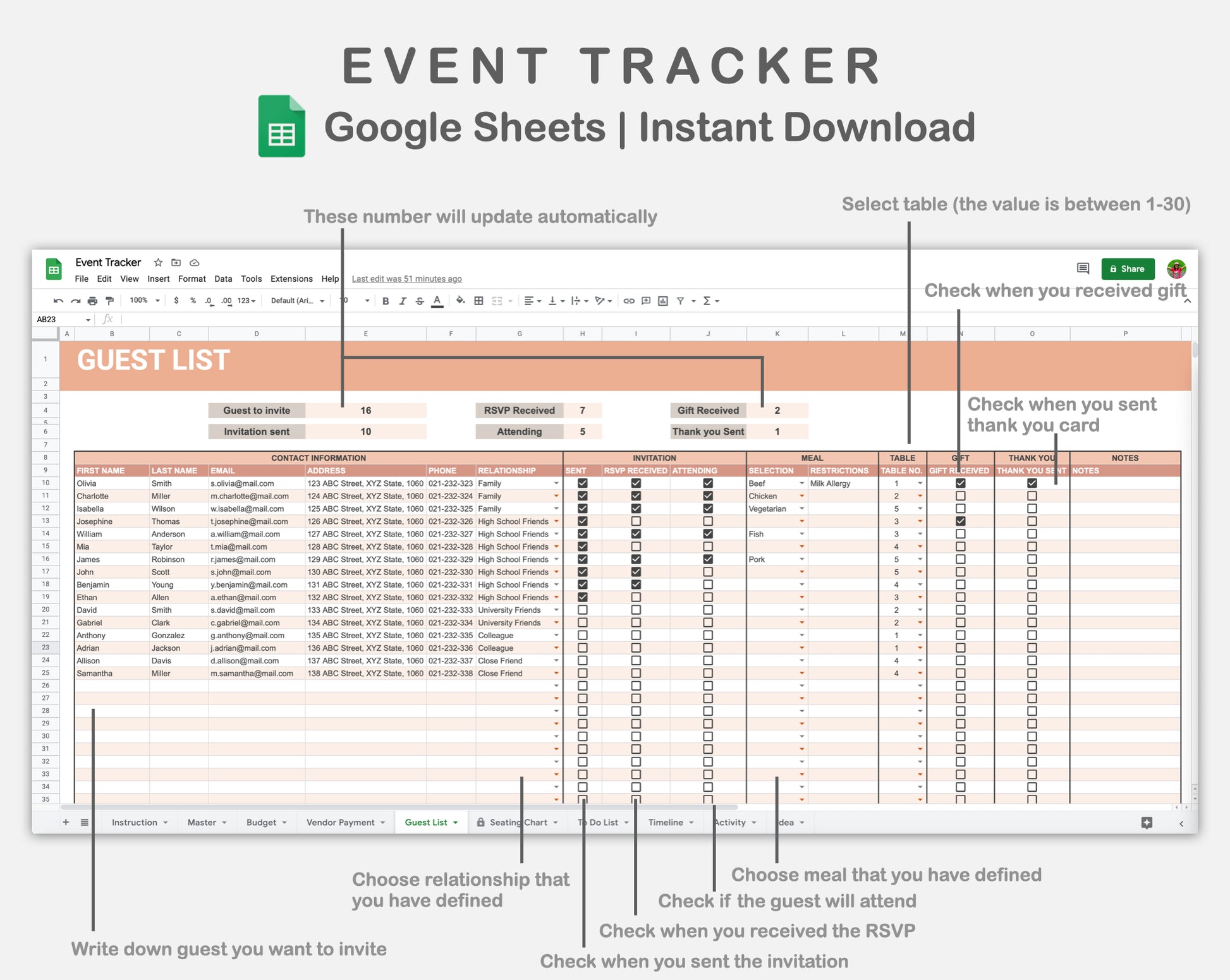 This Event Planner Spreadsheet for Google Sheets is made in NEUTRAL theme in order to help you organize your event or party.