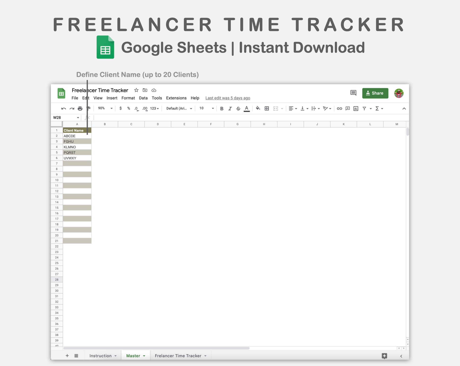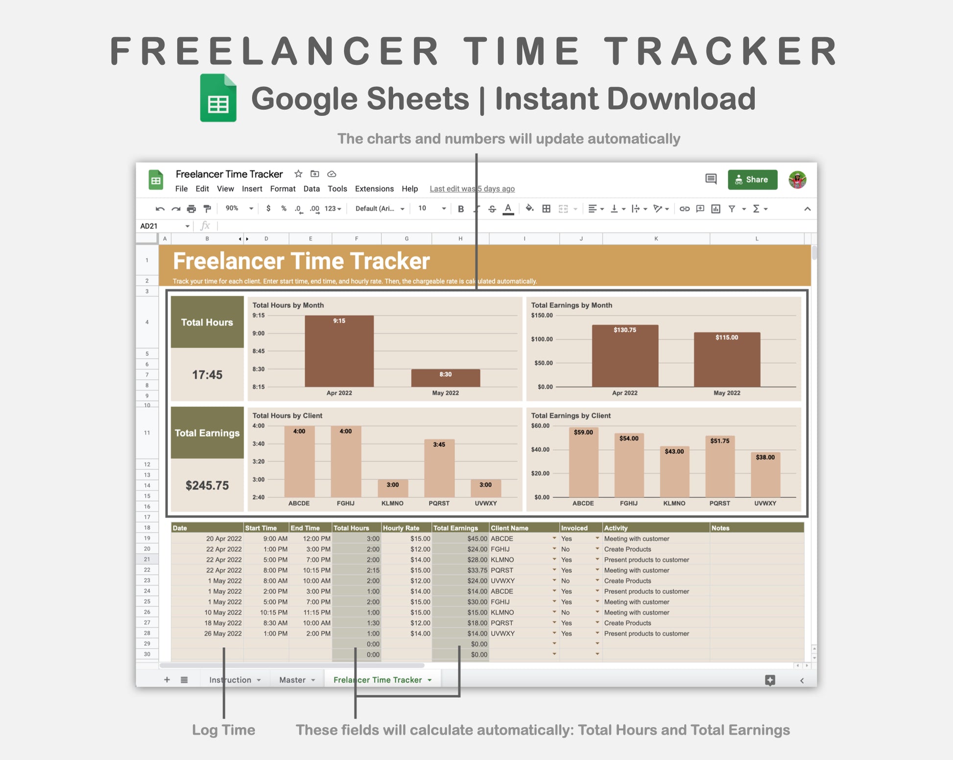This Freelancer Time Tracker Spreadsheet for Google Sheets is made in BOHO theme in order to help you track your time spent for each client.