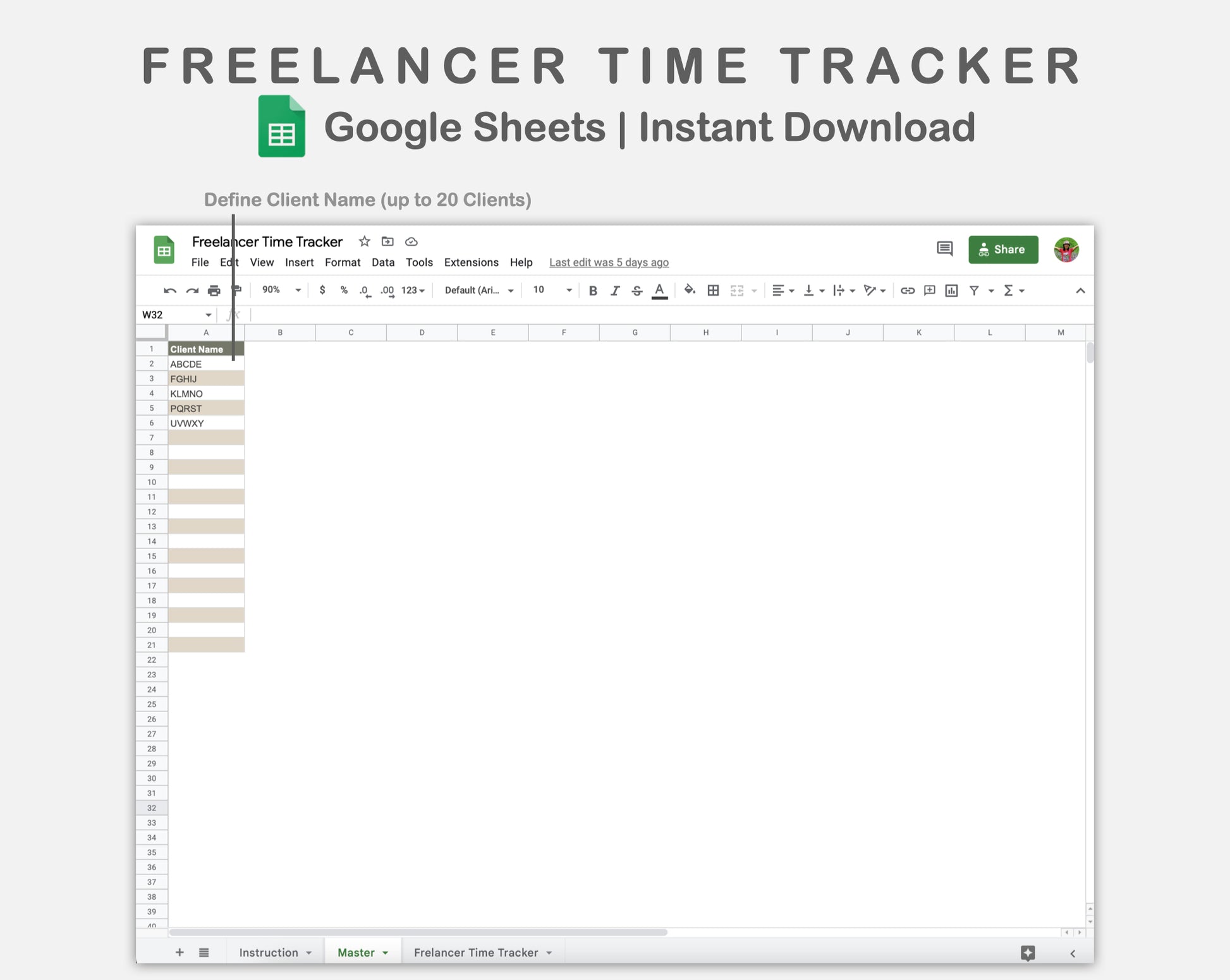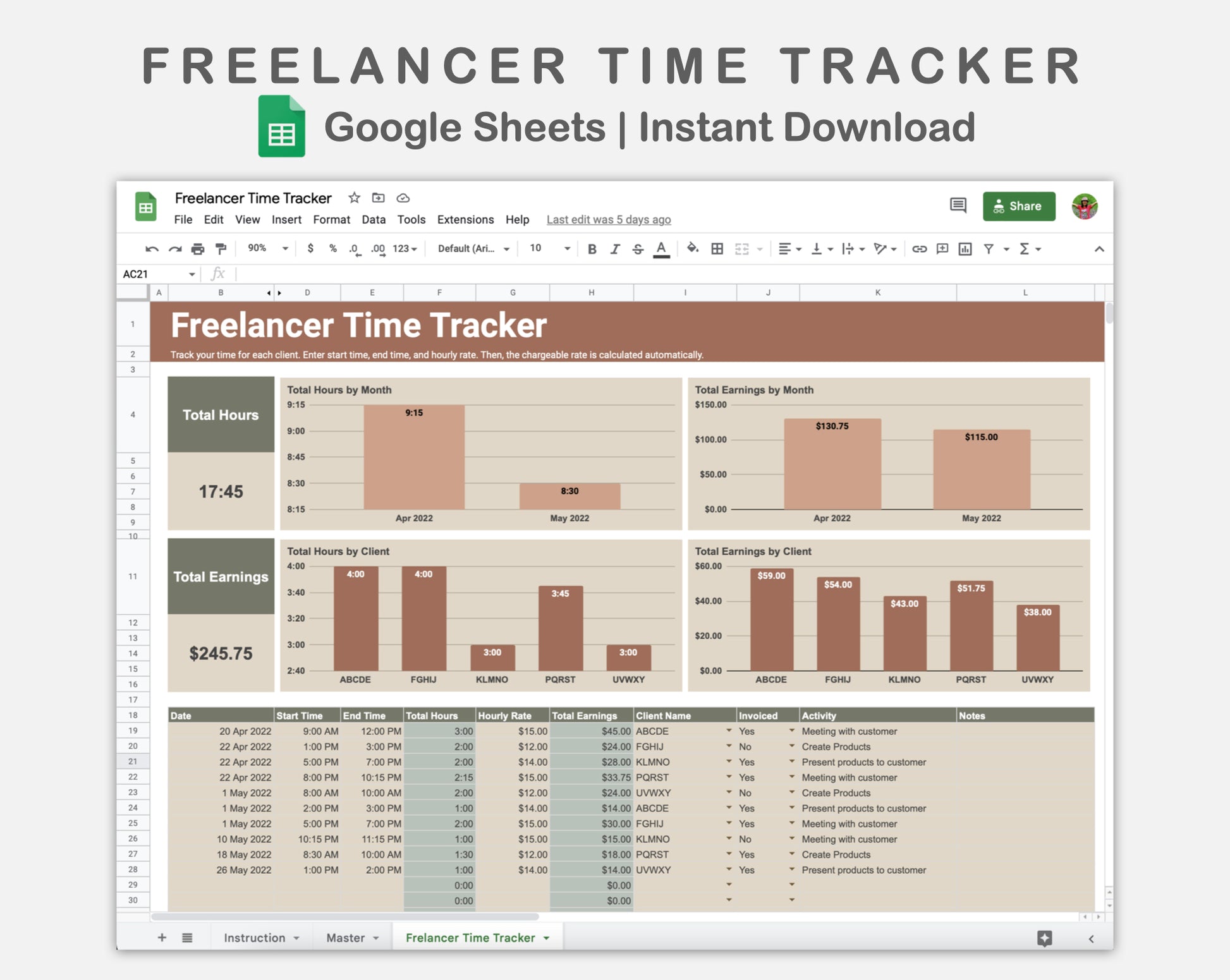 This Freelancer Time Tracker Spreadsheet for Google Sheets is made in EARTHY theme in order to help you track your time spent for each client.