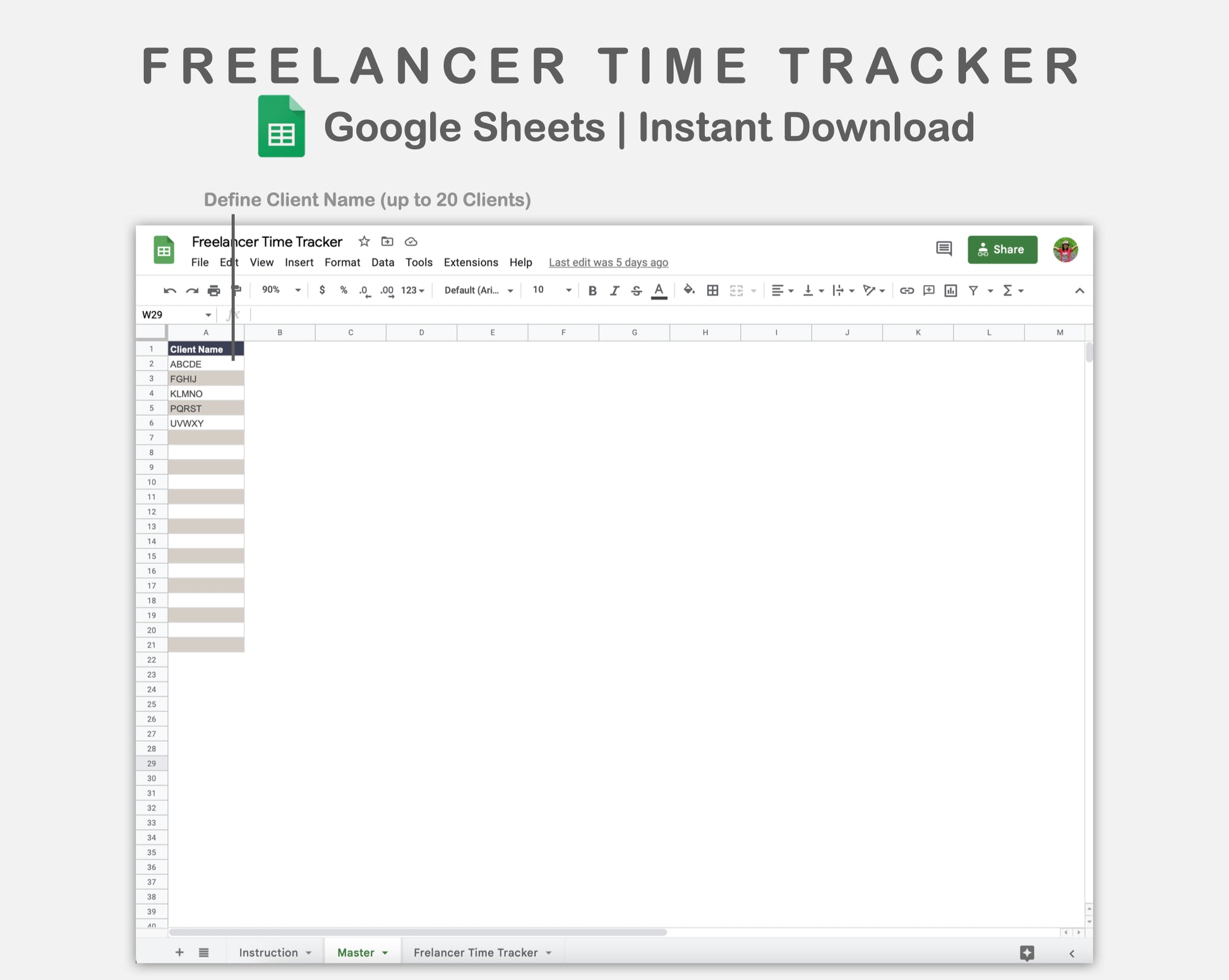 This Freelancer Time Tracker Spreadsheet for Google Sheets is made in SWEET theme in order to help you track your time spent for each client.
