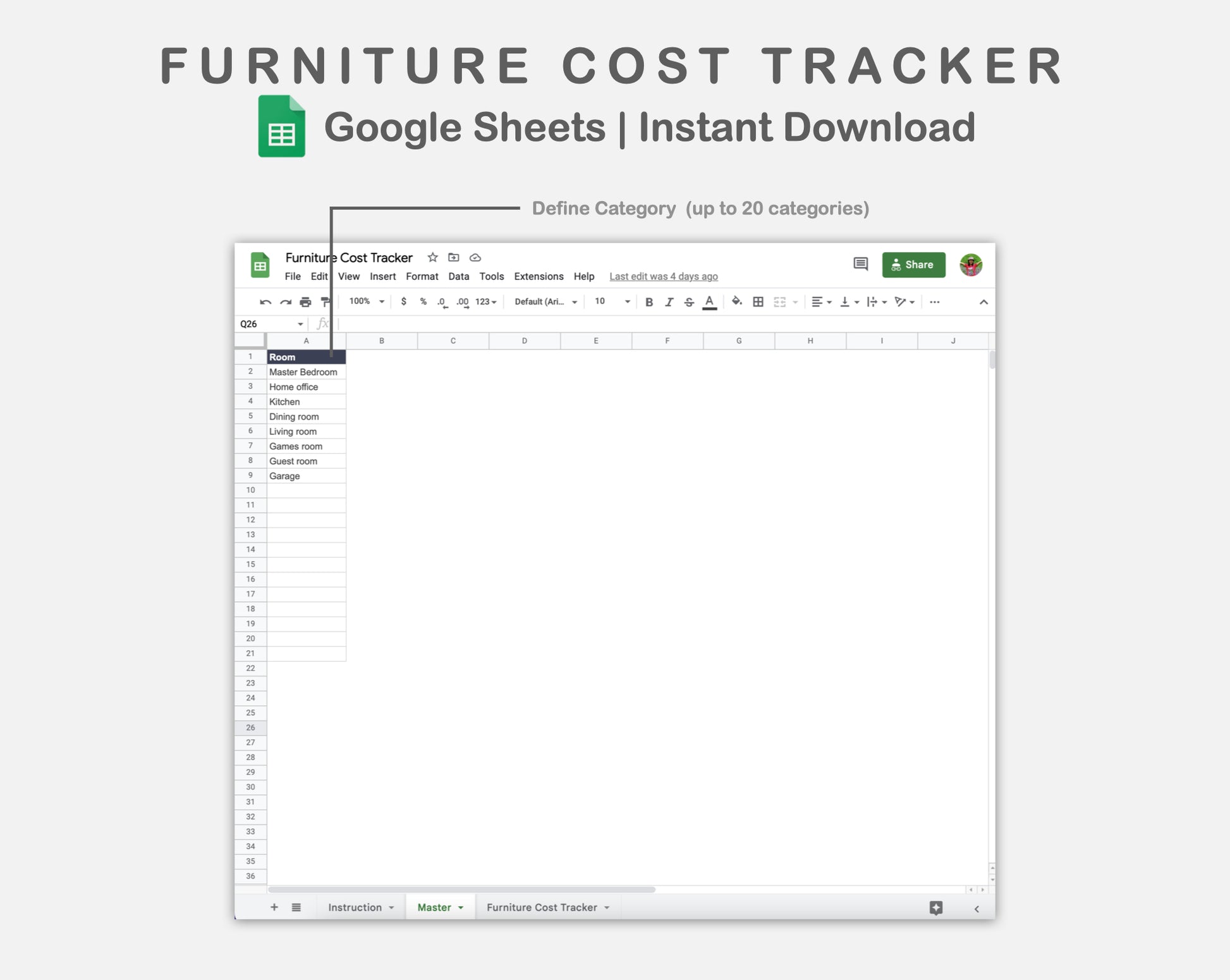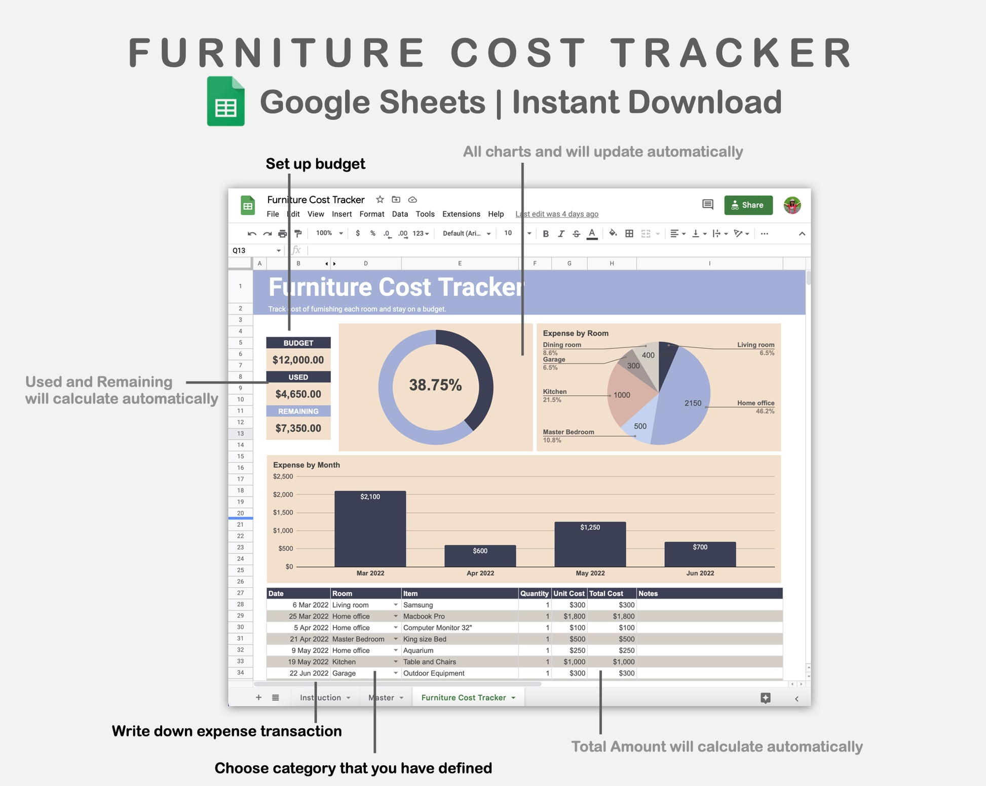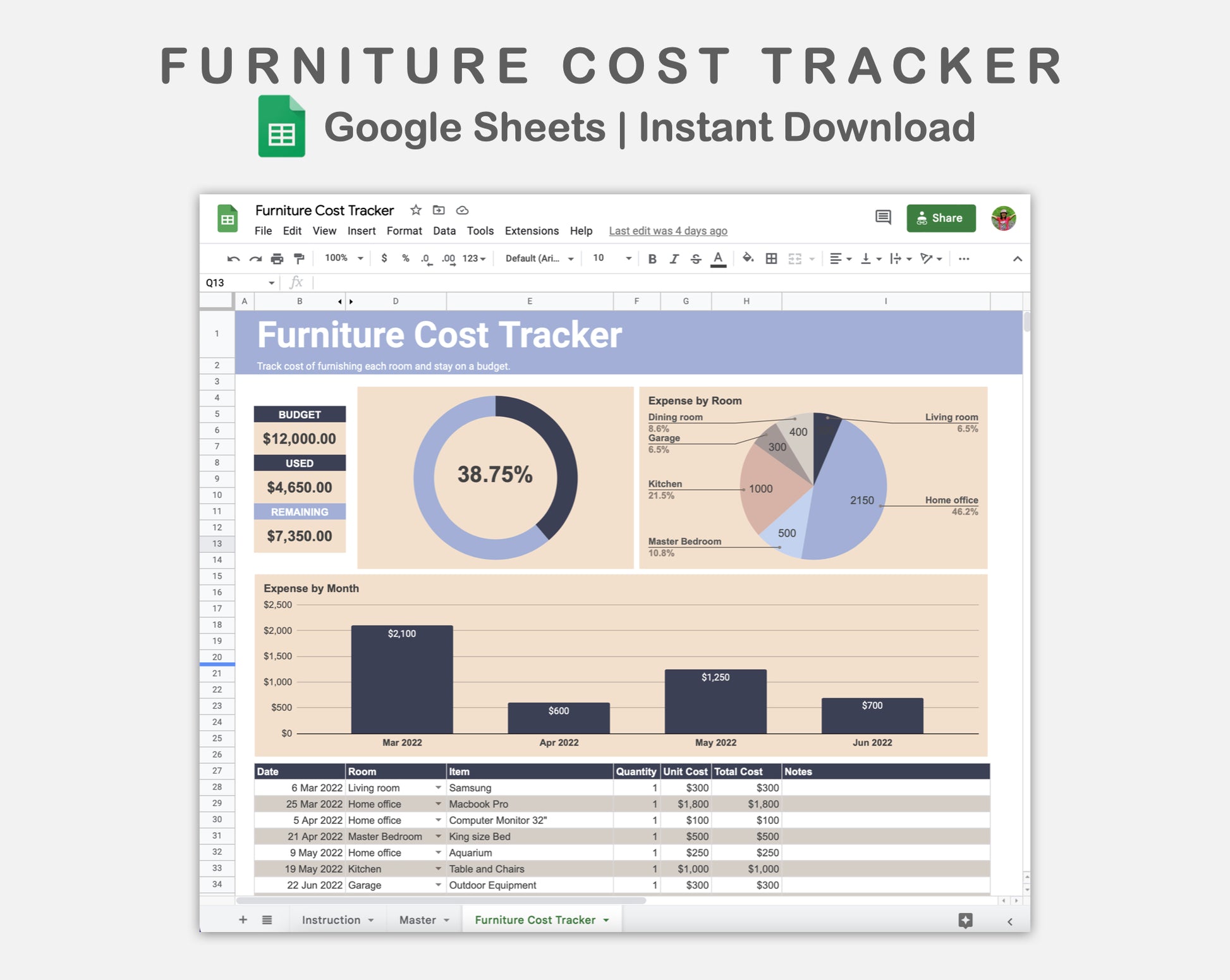 This Furniture Cost Tracker Spreadsheet for Google Sheets is made in SWEET theme in order to help you keep track of your furnishing each room and stay on a budget.