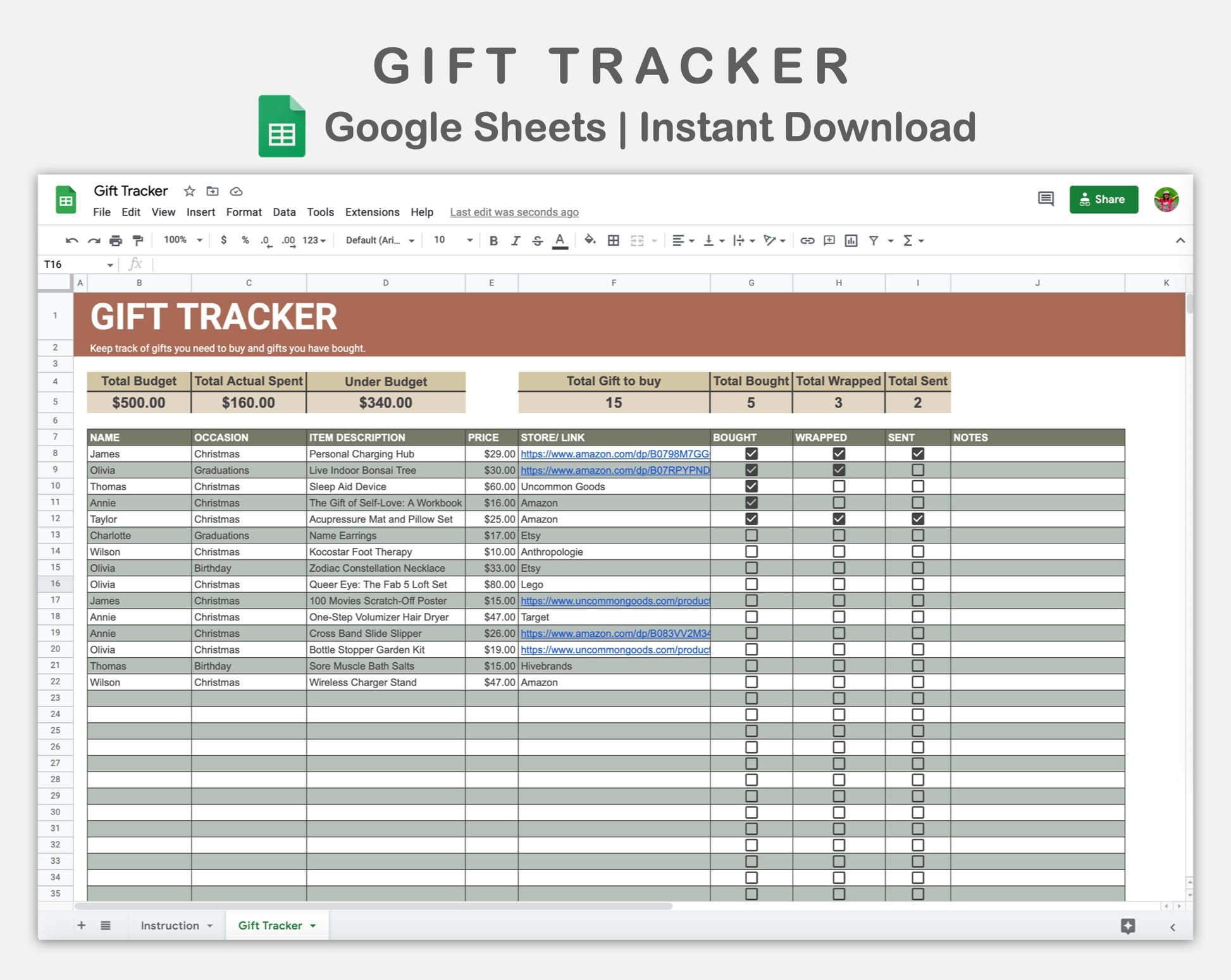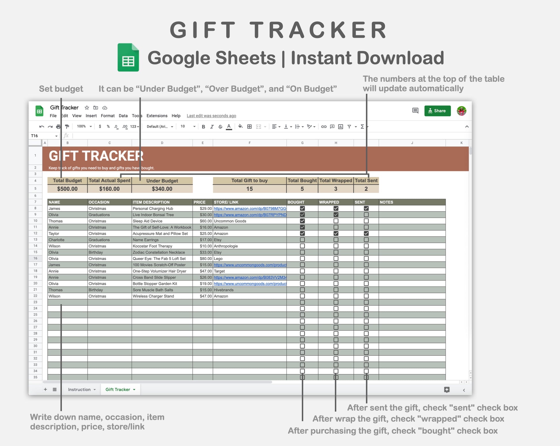 This Gift Tracker Spreadsheet for Google Sheets is made in EARTHY theme in order to help you keep track of all your gift lists, events, and purchases.