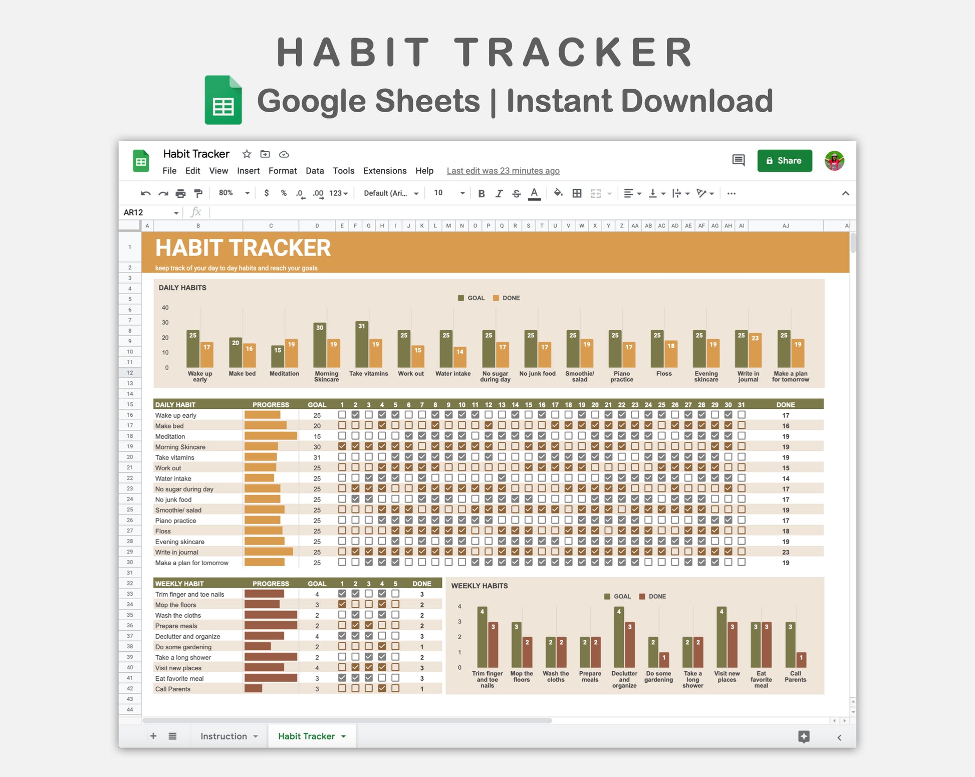 This Habit Tracker Spreadsheet for Google Sheets is made in BOHO theme in order to help you keep track of your daily and weekly habit.