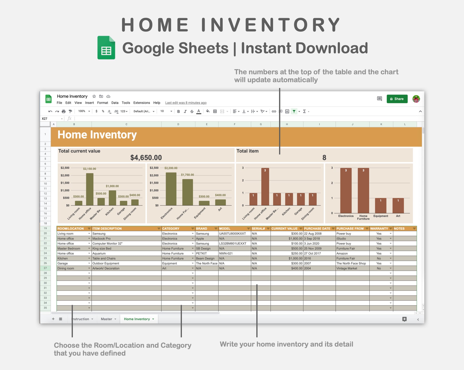 This Home Inventory Spreadsheet for Google Sheets is made in BOHO theme in order to help you organise, document and keep track of the items in your home.