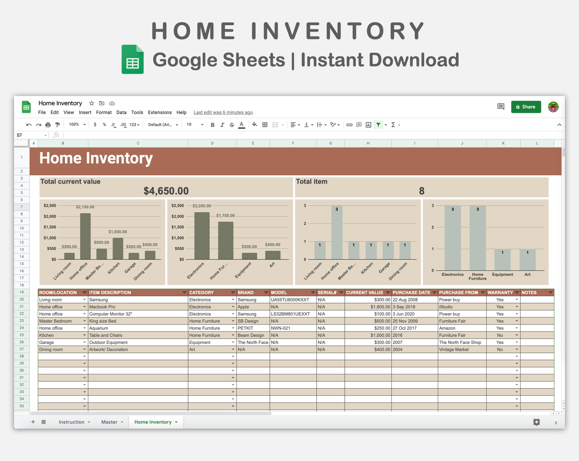 This Home Inventory Spreadsheet for Google Sheets is made in NEUTRAL theme in order to help you organise, document and keep track of the items in your home.