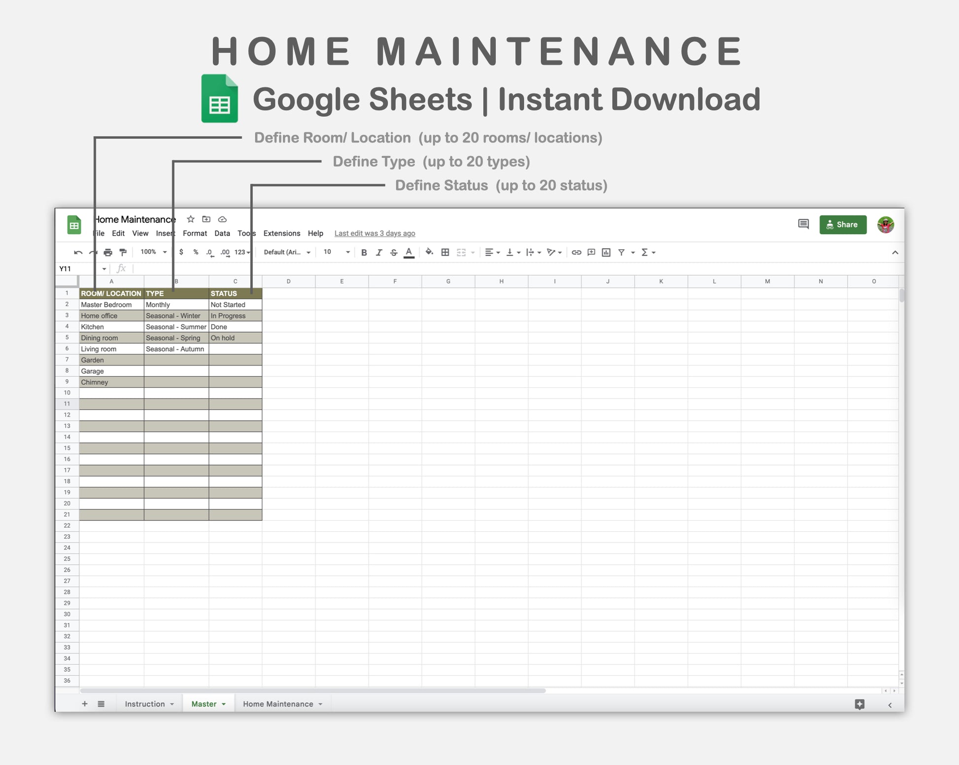 This Home Maintenance Spreadsheet for Google Sheets is made in BOHO theme in order to help you track home maintenance tasks to keep your house in tip-top shape.
