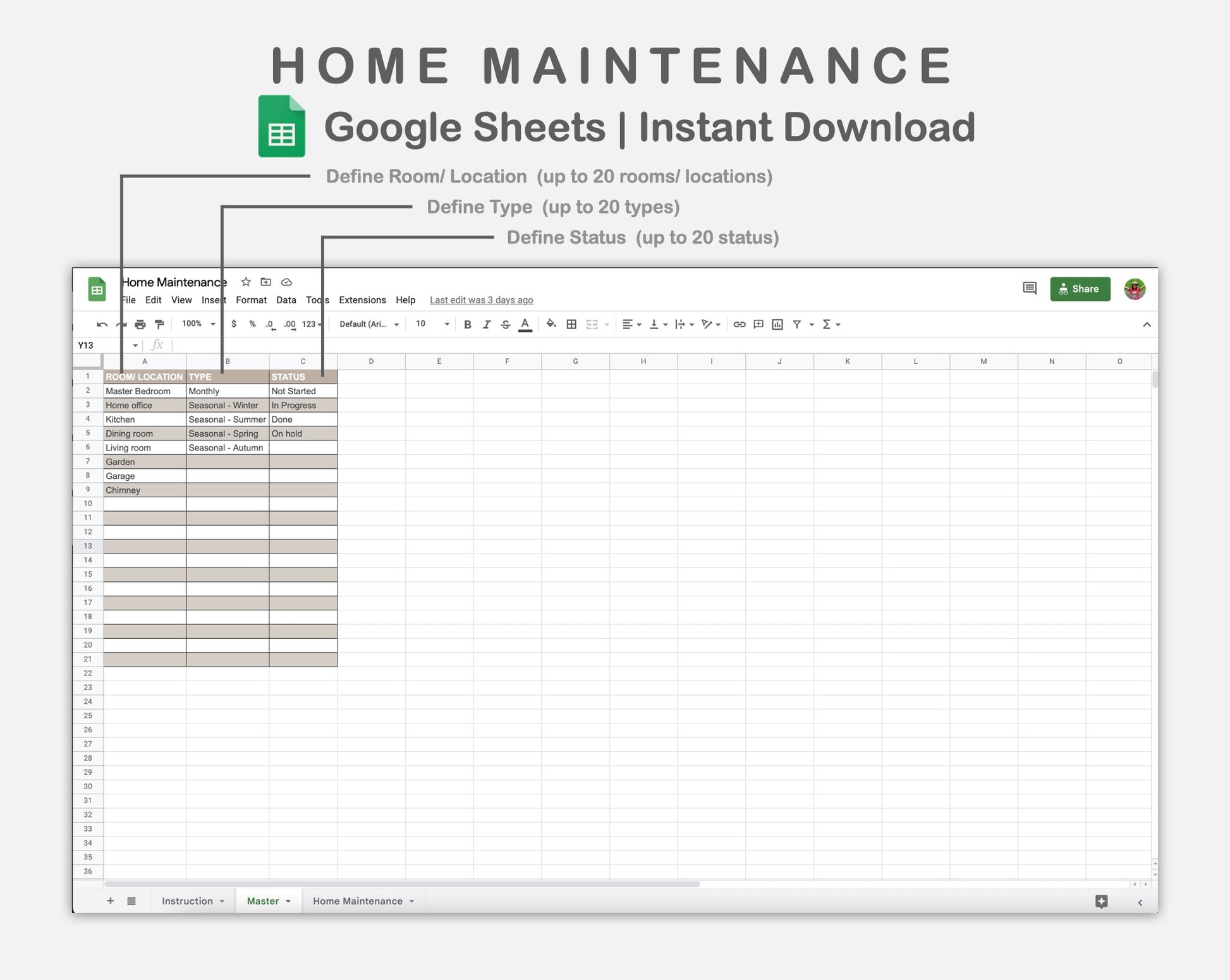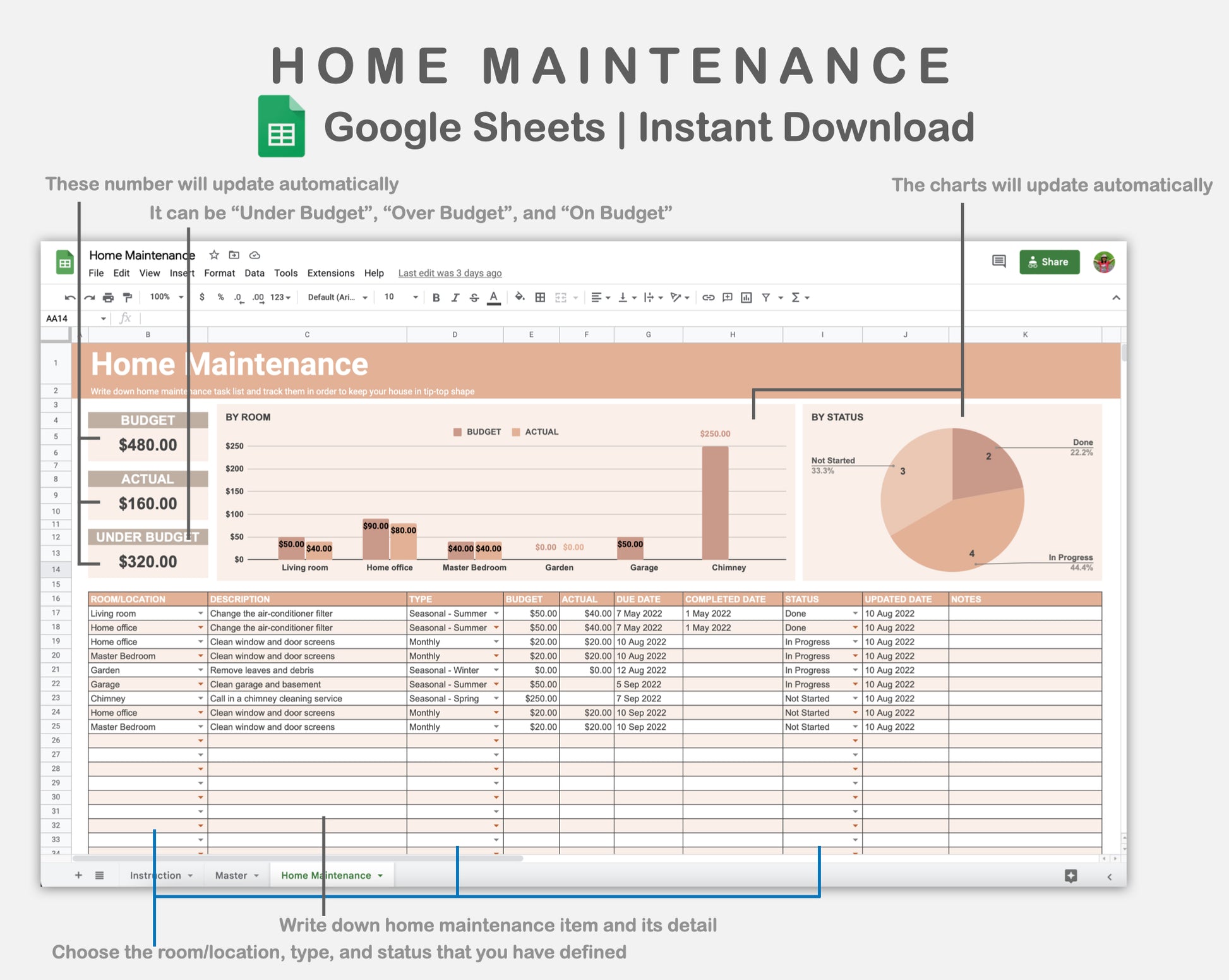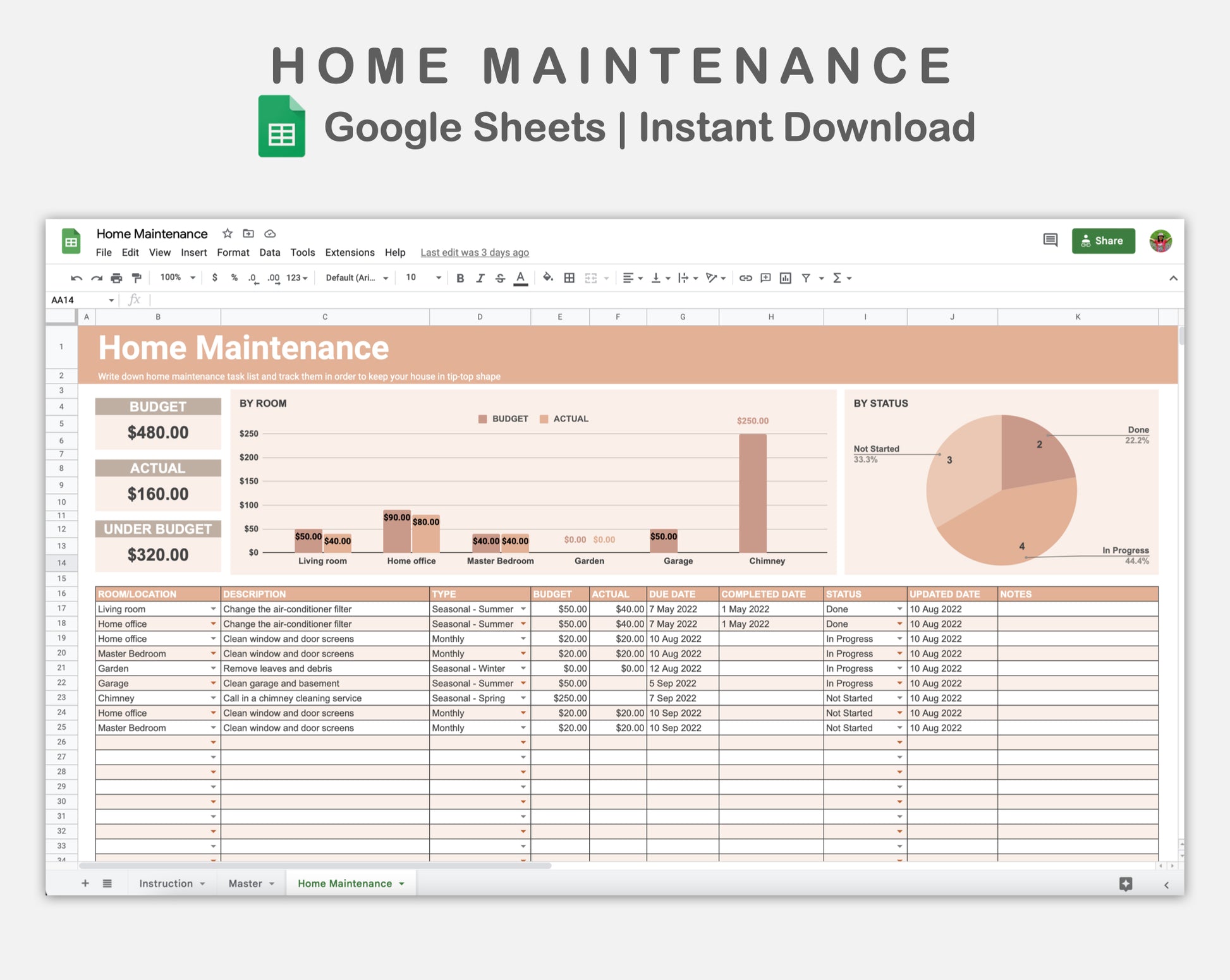This Home Maintenance Spreadsheet for Google Sheets is made in NEUTRAL theme in order to help you track home maintenance tasks to keep your house in tip-top shape.