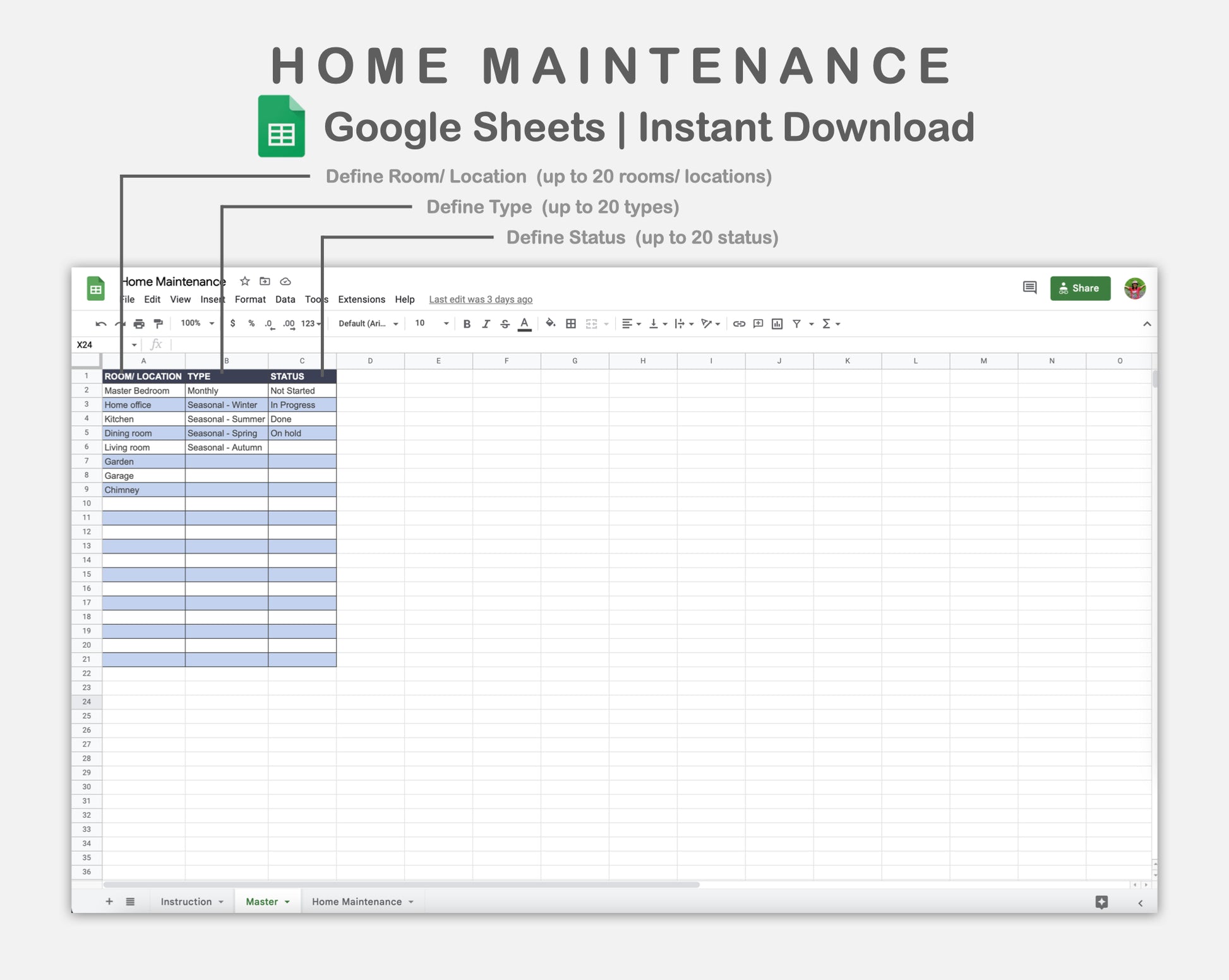 This Home Maintenance Spreadsheet for Google Sheets is made in SWEET theme in order to help you track home maintenance tasks to keep your house in tip-top shape.