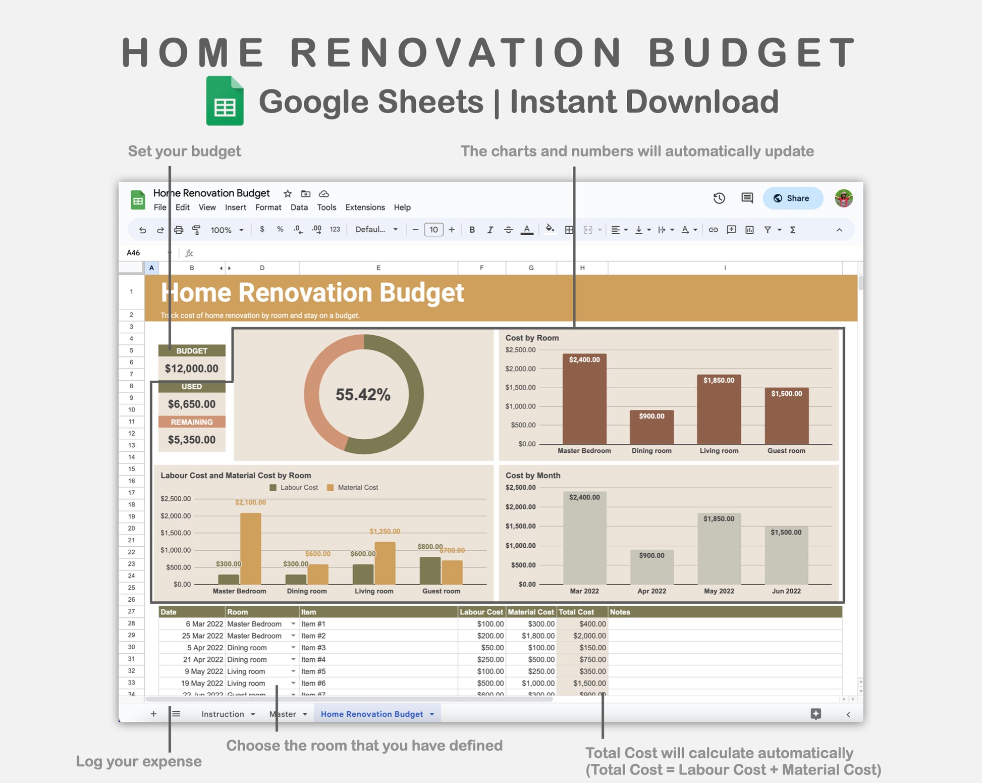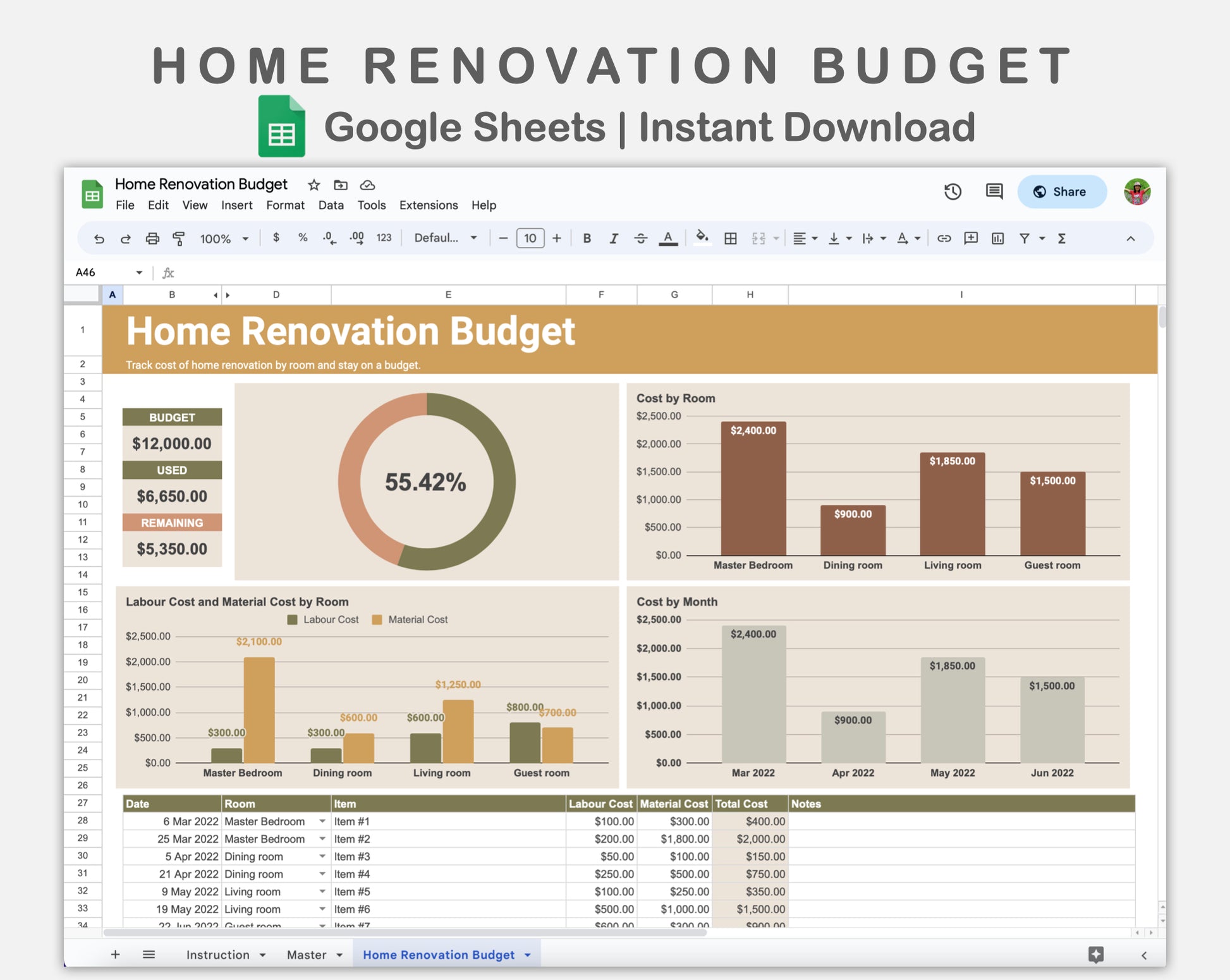 This Home Renovation Budget Tracker Spreadsheet for Google Sheets is made in BOHO theme in order to help you track cost of home renovation both by room and by month and stay on a budget.