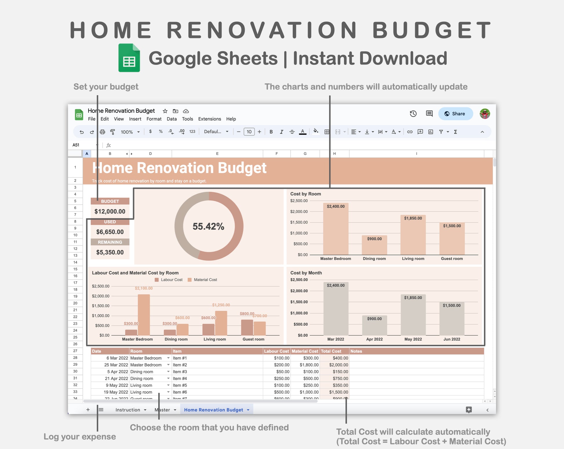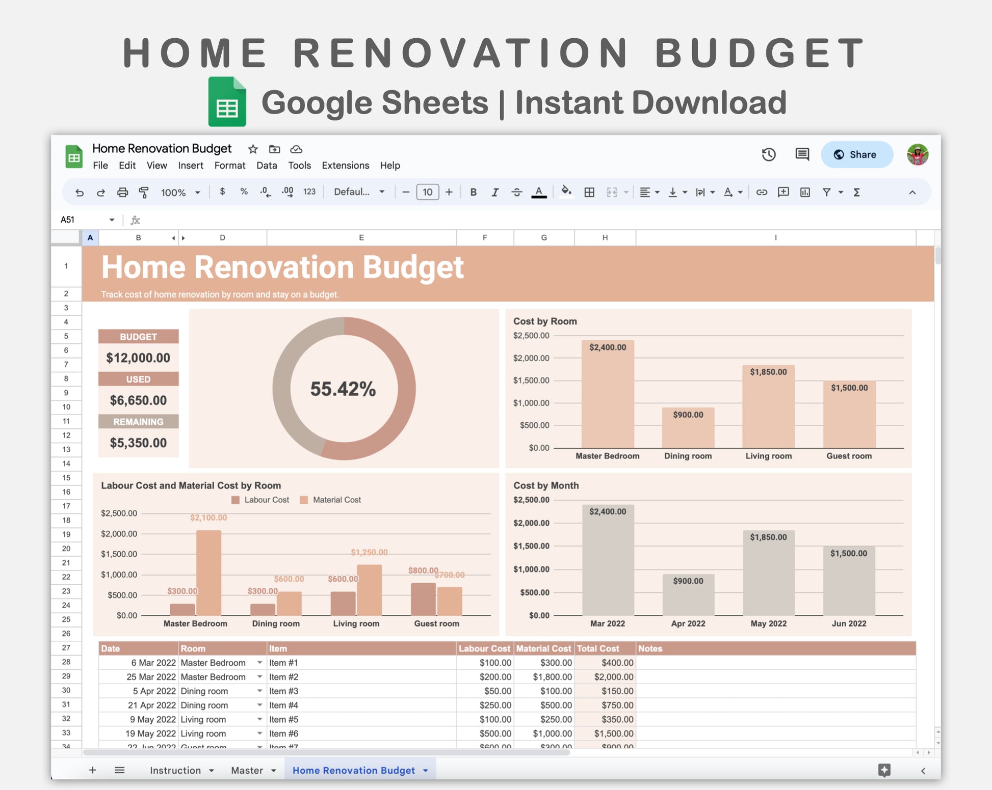 This Home Renovation Budget Tracker Spreadsheet for Google Sheets is made in NEUTRAL theme in order to help you track cost of home renovation both by room and by month and stay on a budget.