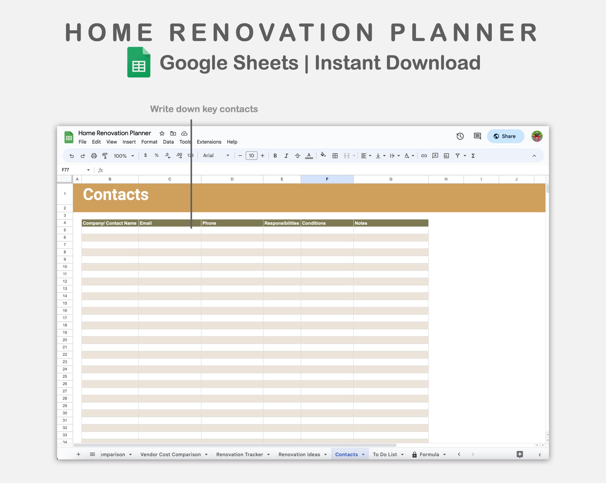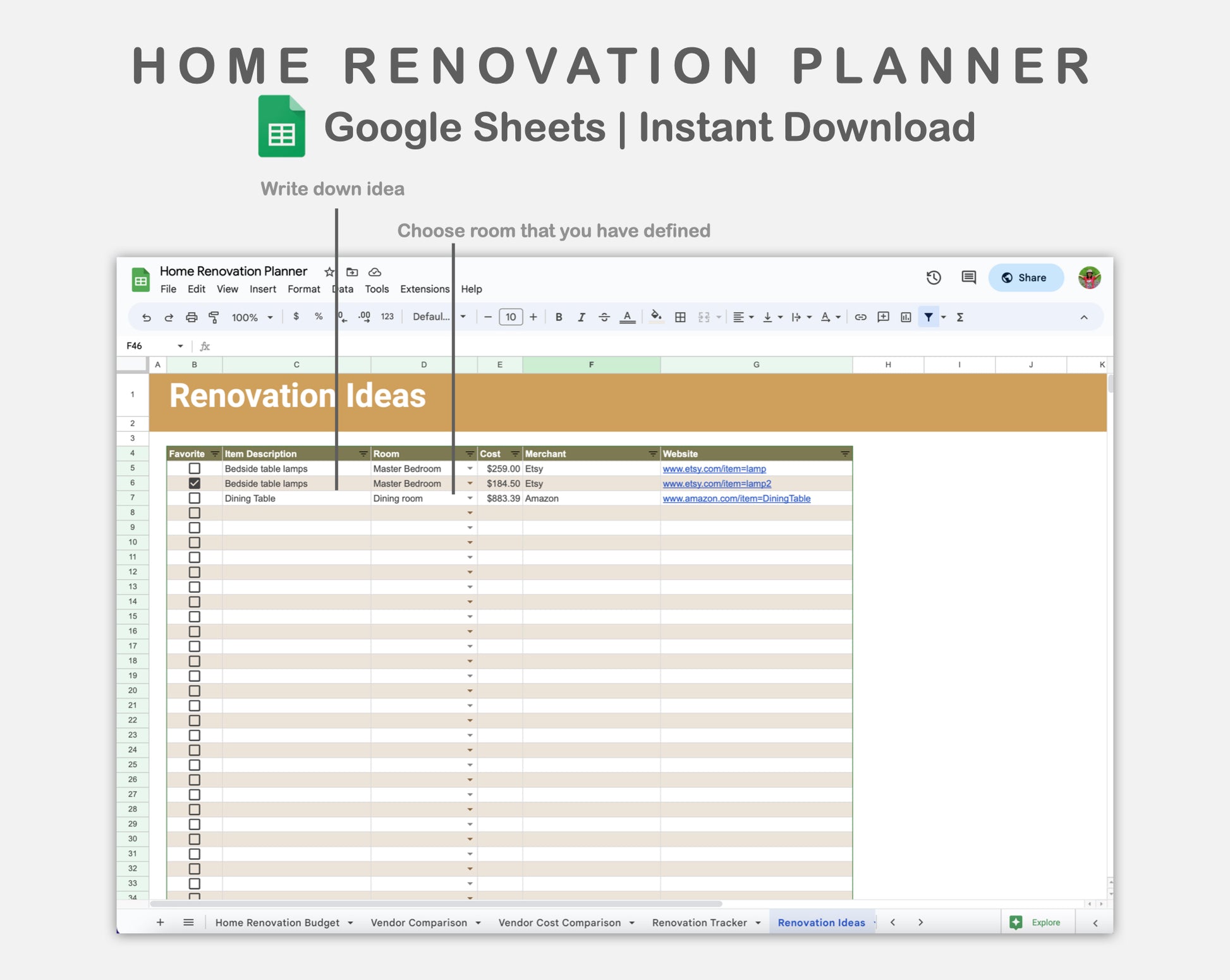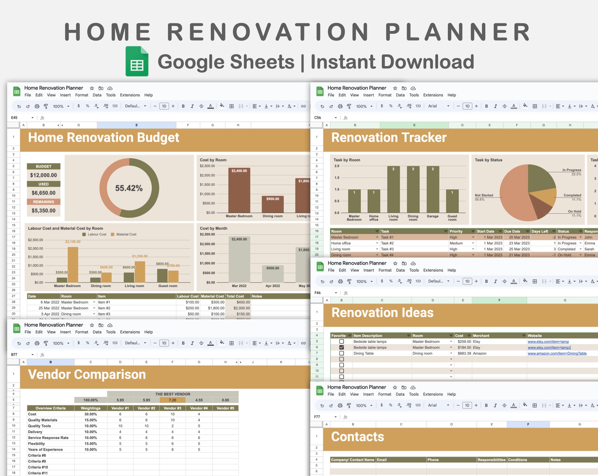 This Home Renovation Planner Spreadsheet for Google Sheets is made in BOHO theme in order to help you plan and organize your Home Renovation Project easily and effortlessly.
