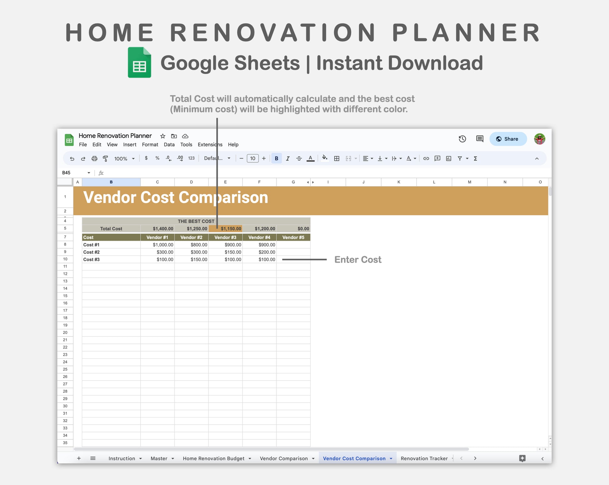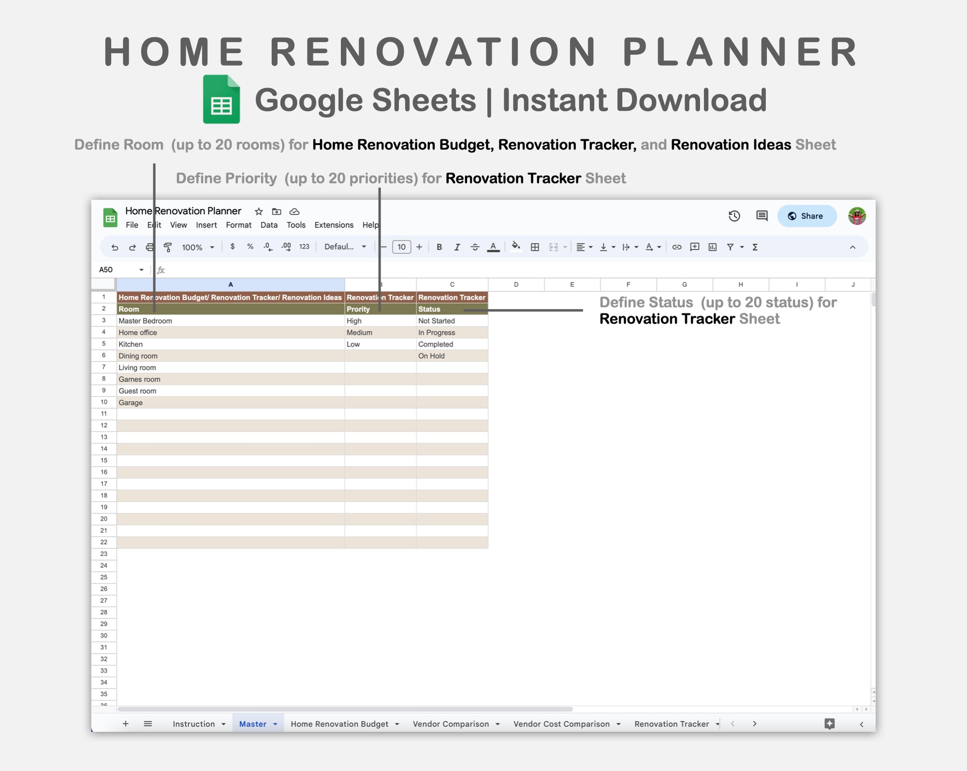 • There are 10 sheets: Instruction, Master, Home Renovation Budget, Vendor Comparison, Vendor Cost Comparison, Renovation Tracker, Renovation Ideas, Contacts, To Do List, and Formula.
