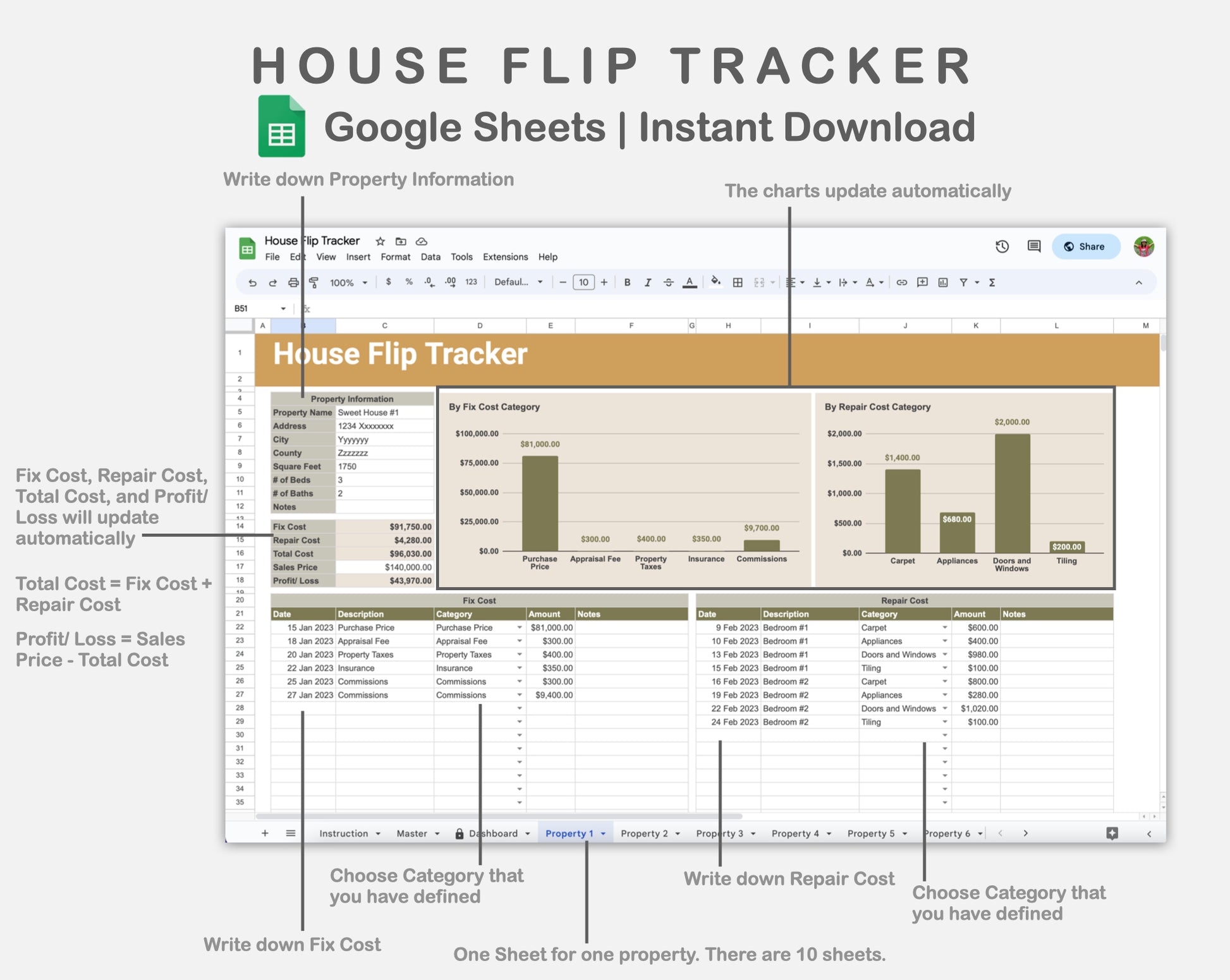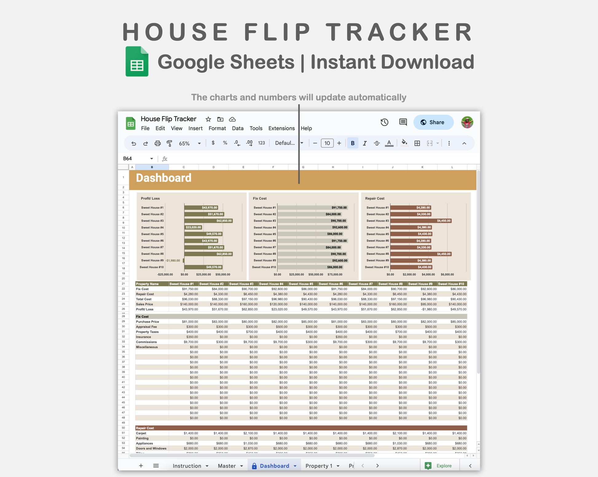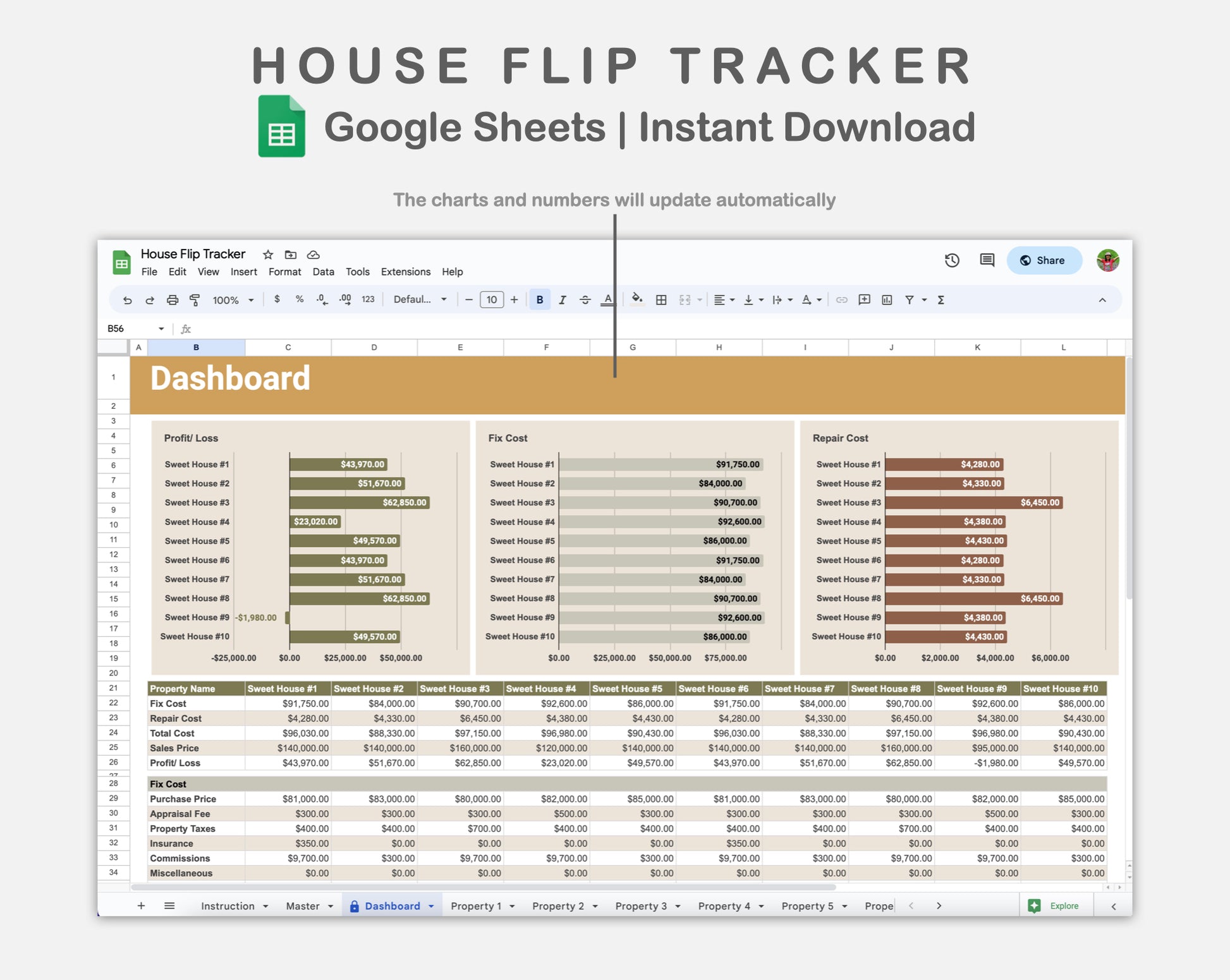 This House Flip Tracker for Google Sheets is made in BOHO theme in order to help real estate investors track and manage the expenses and profits from the house flip properties (up to 10 properties).