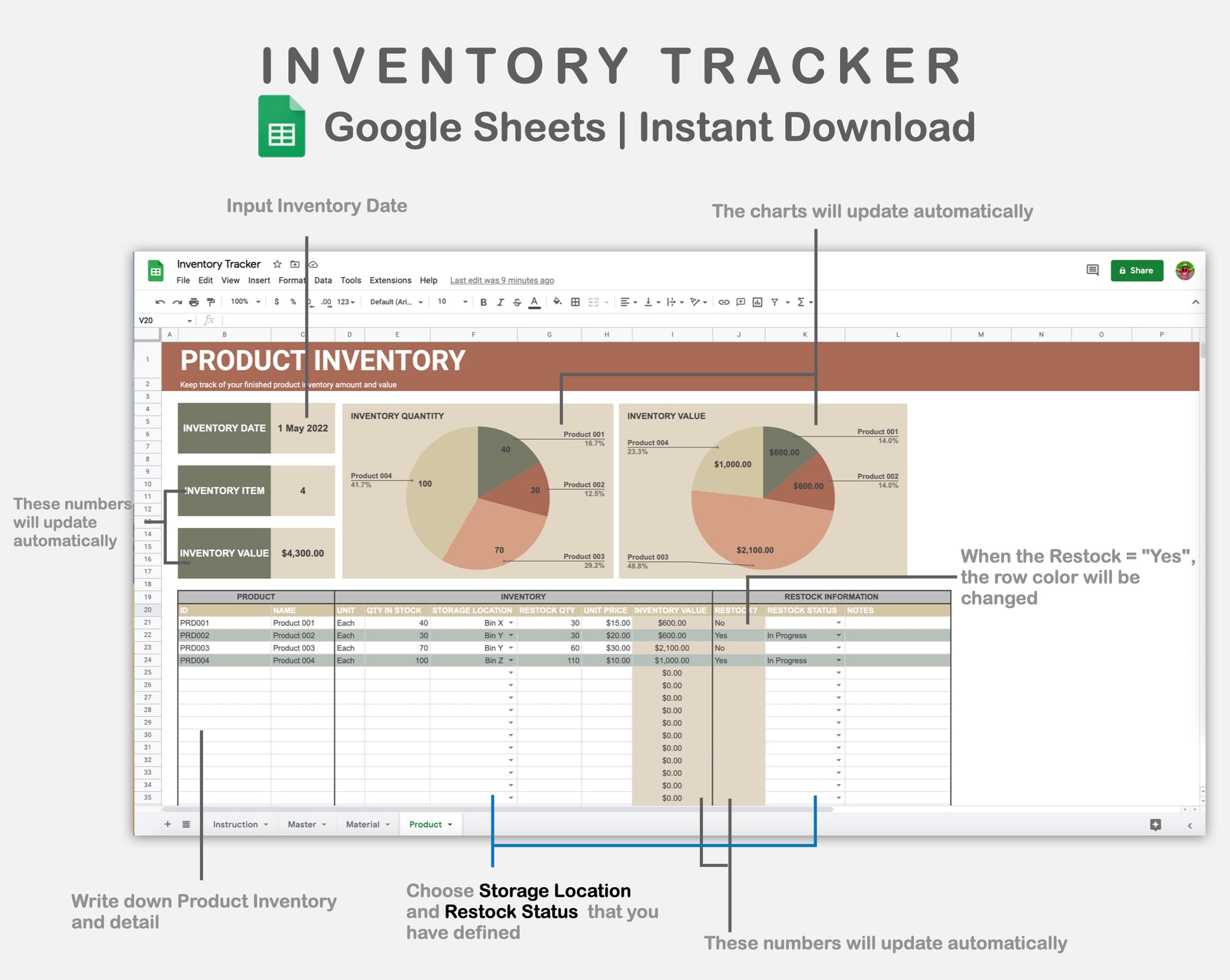 This Inventory Management Spreadsheet for Google Sheets is made in EARTHY theme in order to help you keep track of both material inventory and finished product inventory.
