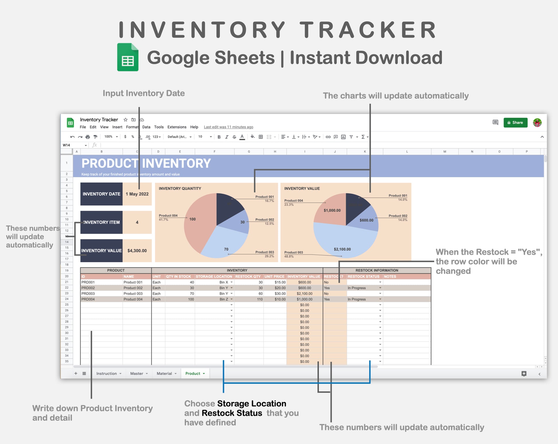 This Inventory Management Spreadsheet for Google Sheets is made in SWEET theme in order to help you keep track of both material inventory and finished product inventory.