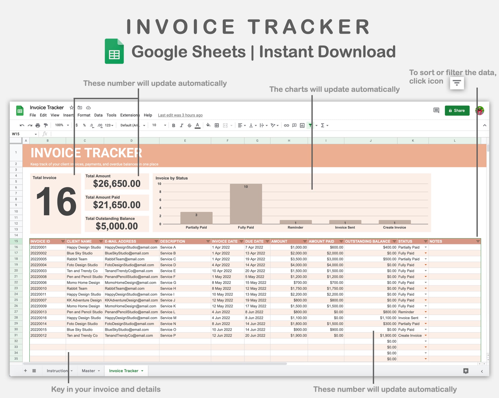 This Invoice Tracker Spreadsheet for Google Sheets is made in NEUTRAL theme in order to keep track of your client invoices, payments, and overdue balances in one place.