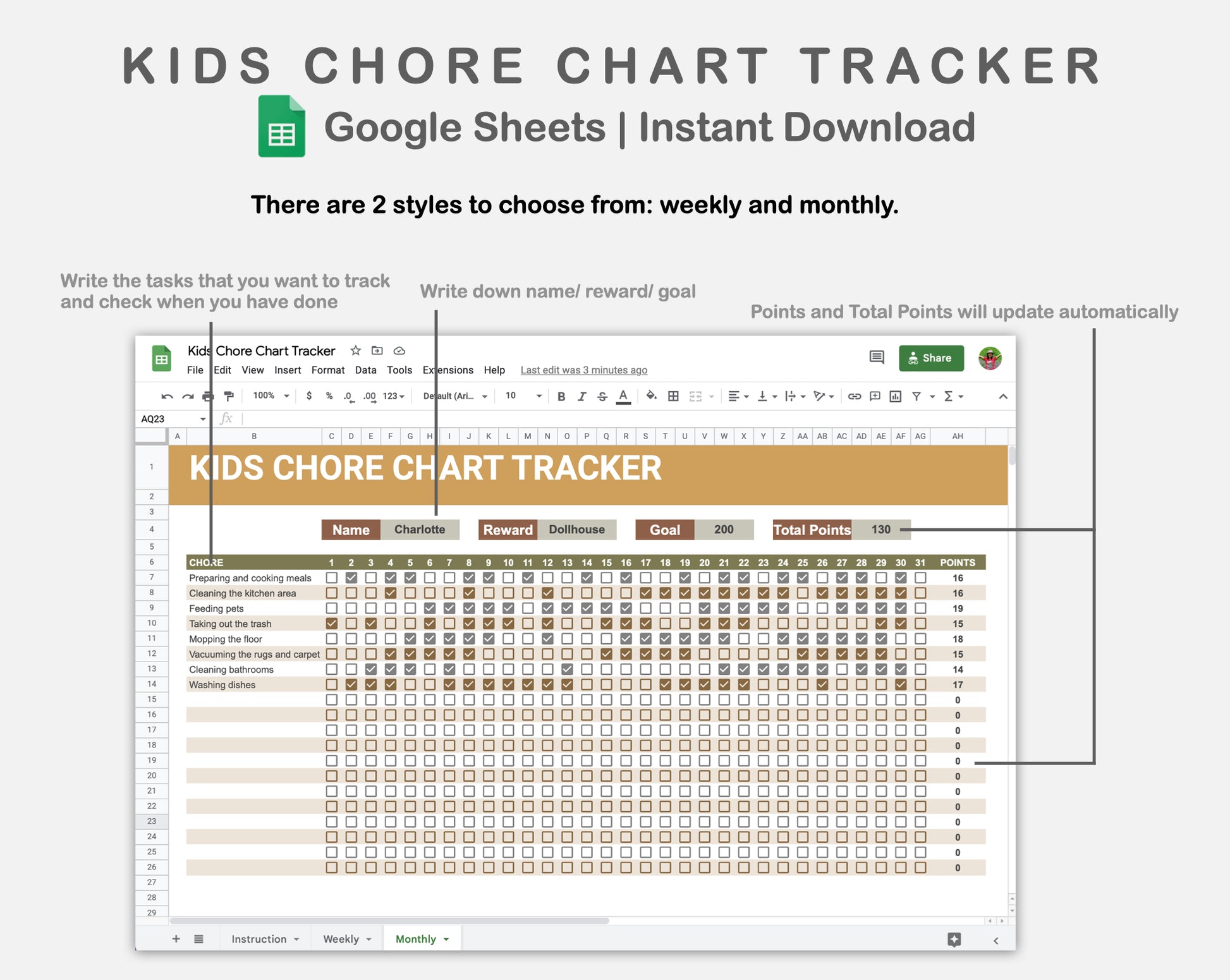 Google Sheets - Kids Chore Chart Tracker - Boho
