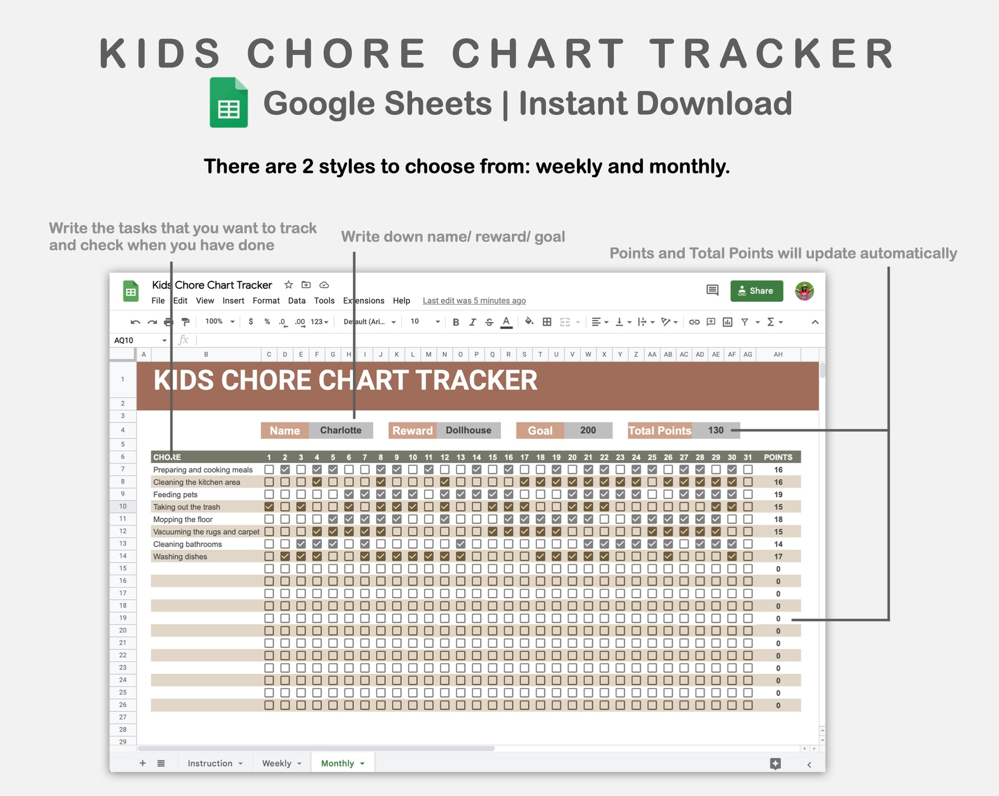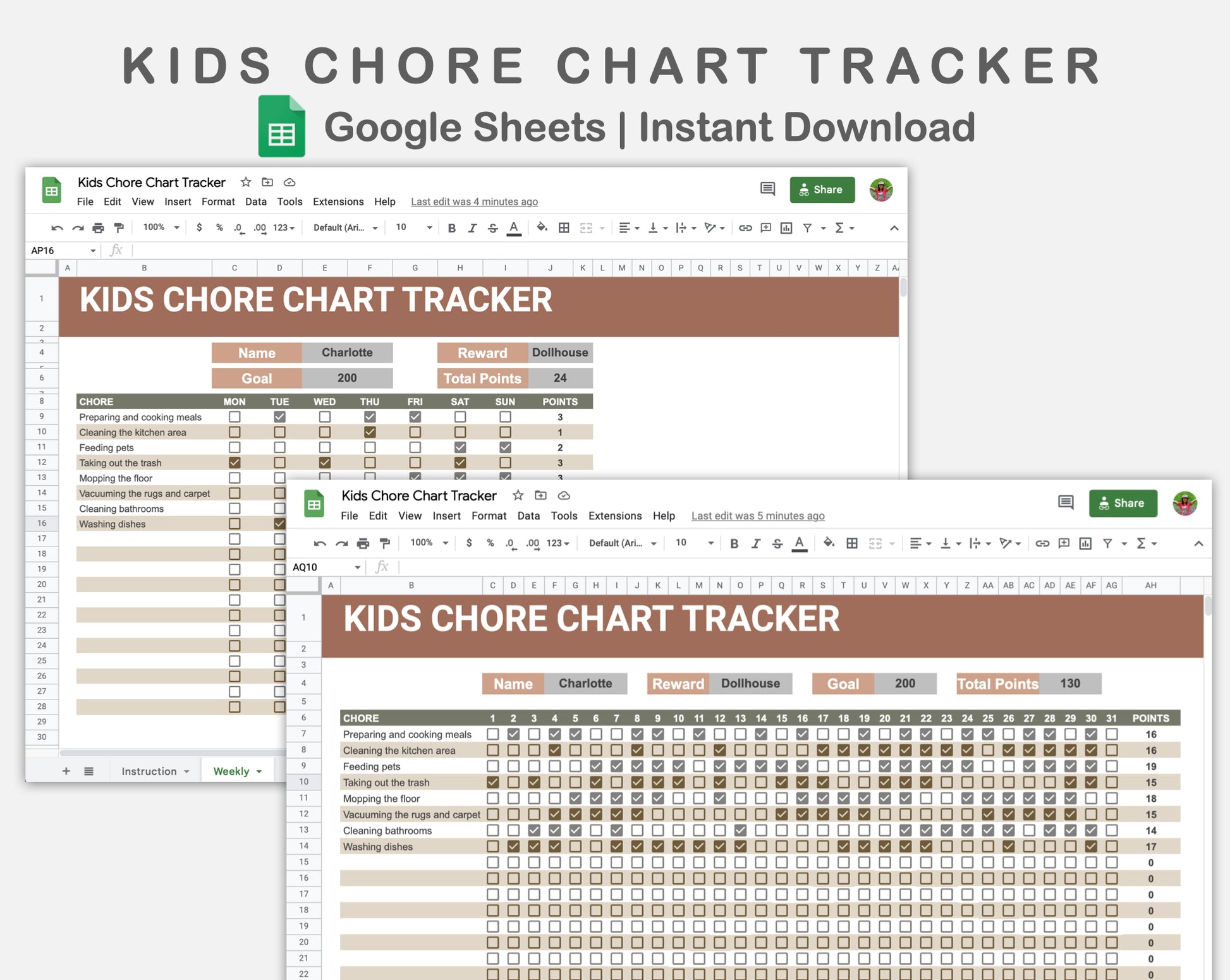 Google Sheets - Kids Chore Chart Tracker - Earthy