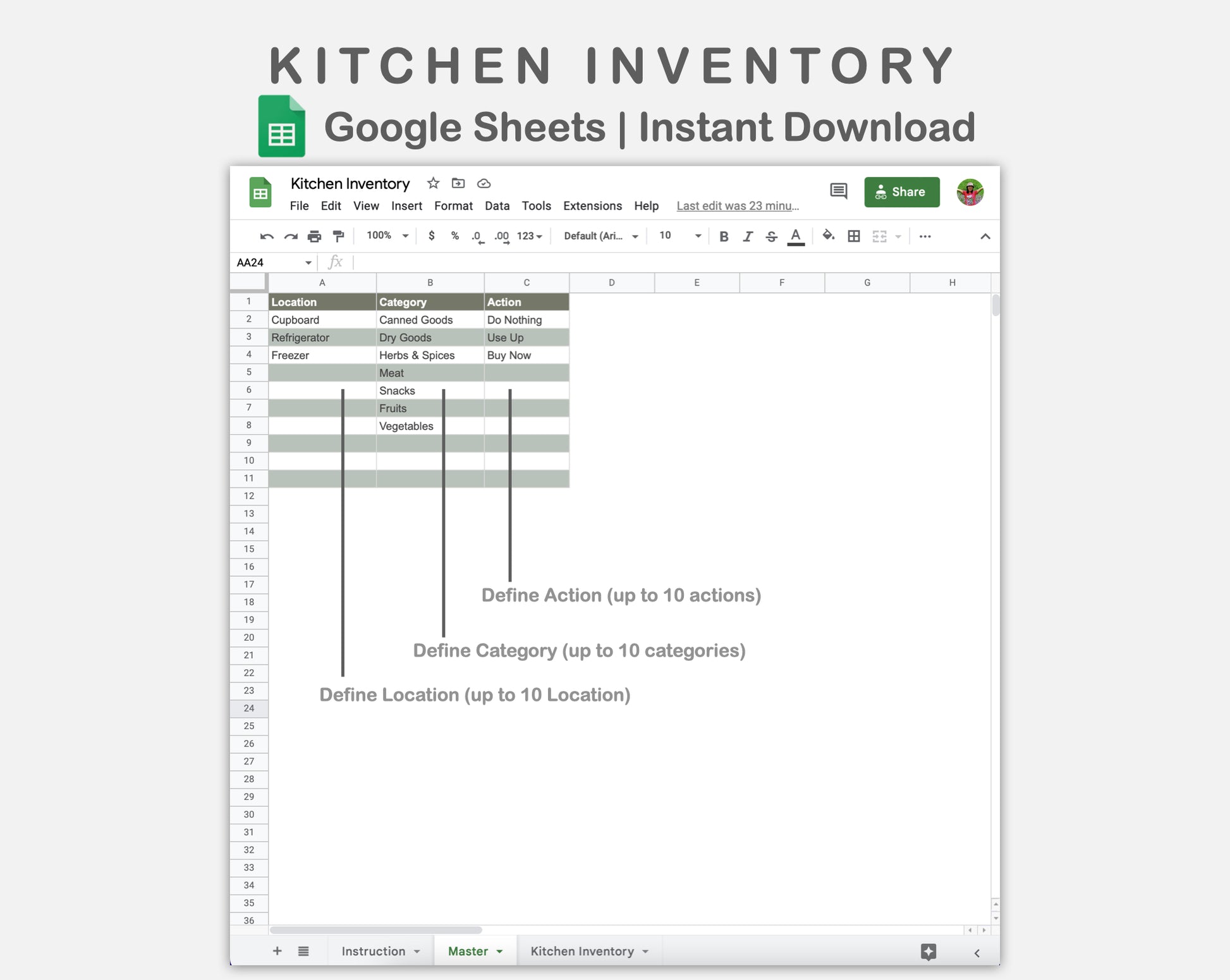 This Kitchen Inventory Spreadsheet for Google Sheets is made in EARTHY theme in order to help you plan your kitchen more effectively and efficiently. Keep track of what you already have and need to use up.
