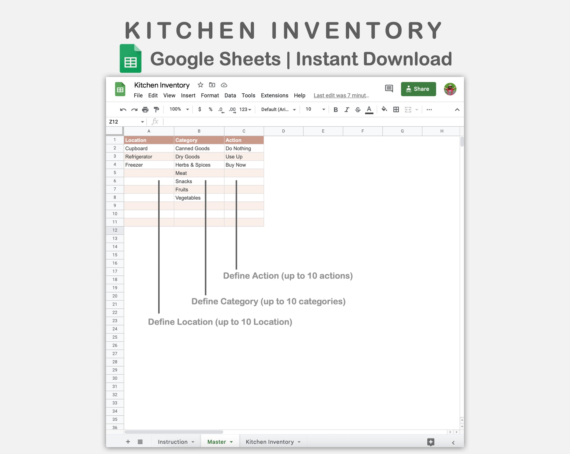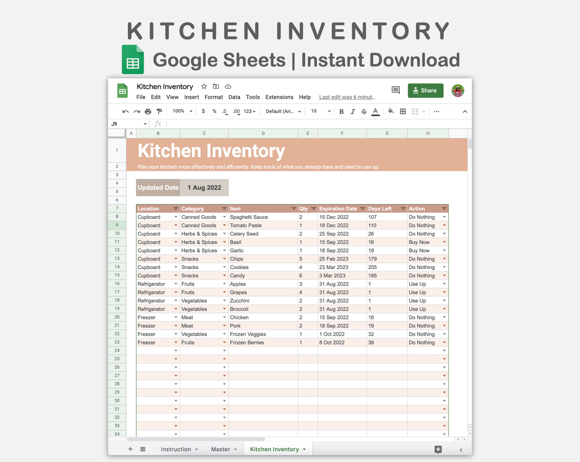 This Kitchen Inventory Spreadsheet for Google Sheets is made in NEUTRAL theme in order to help you plan your kitchen more effectively and efficiently. Keep track of what you already have and need to use up.